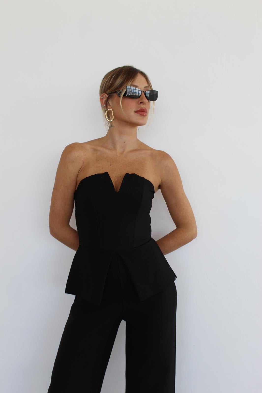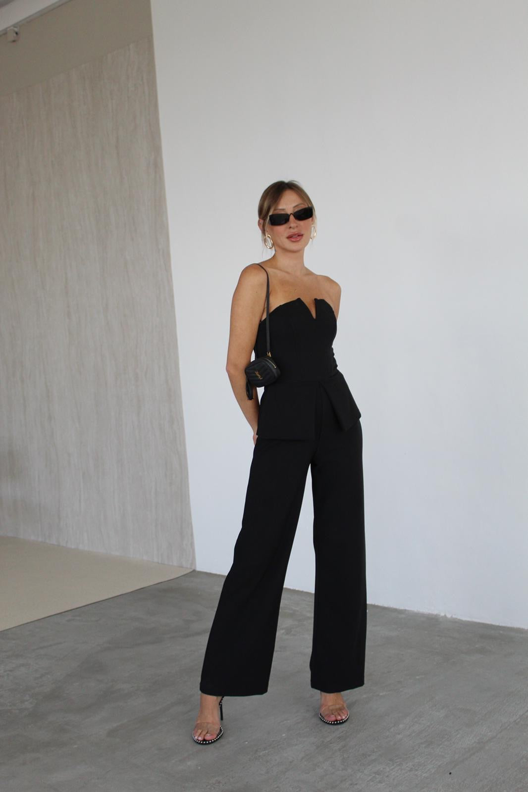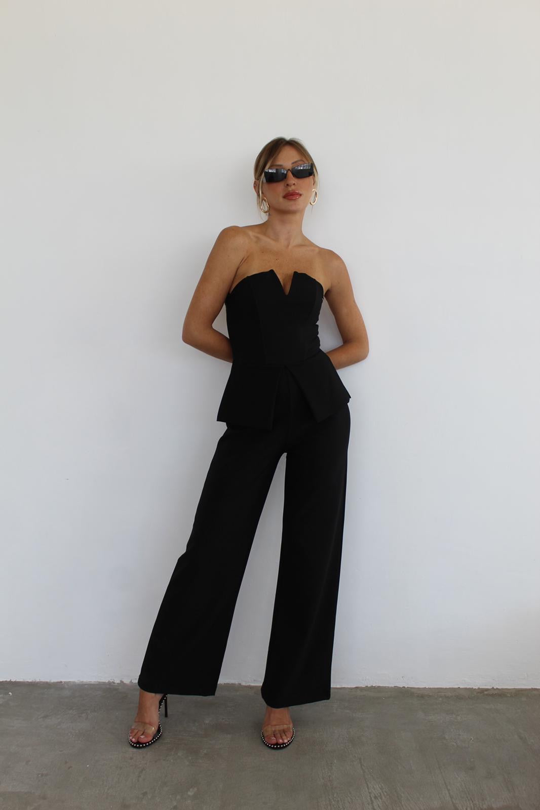 אוברול מקסי סטרפלס בגזרה מחמיאה עם מחוך מובנה וקו מותן מודגש.