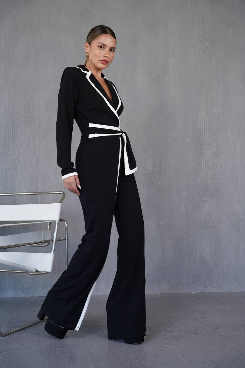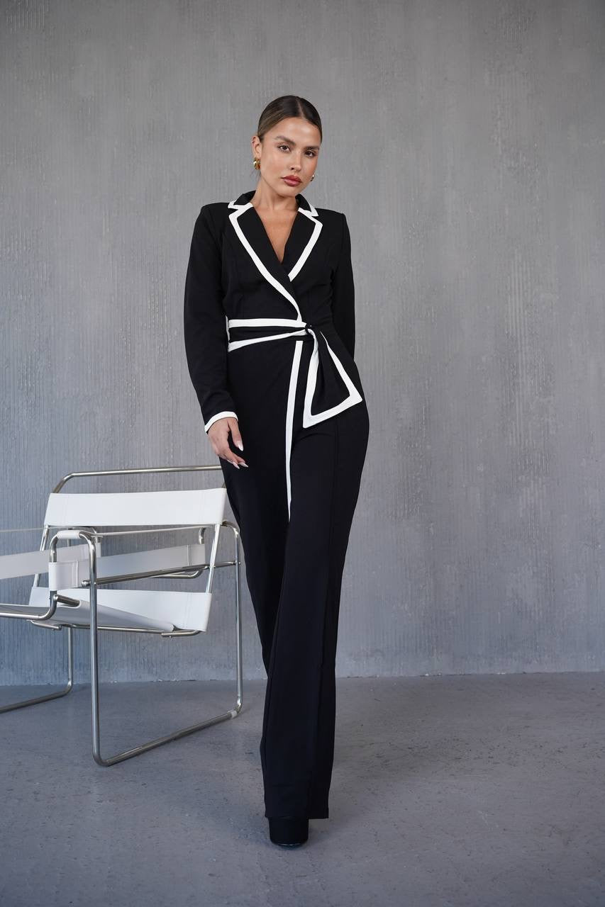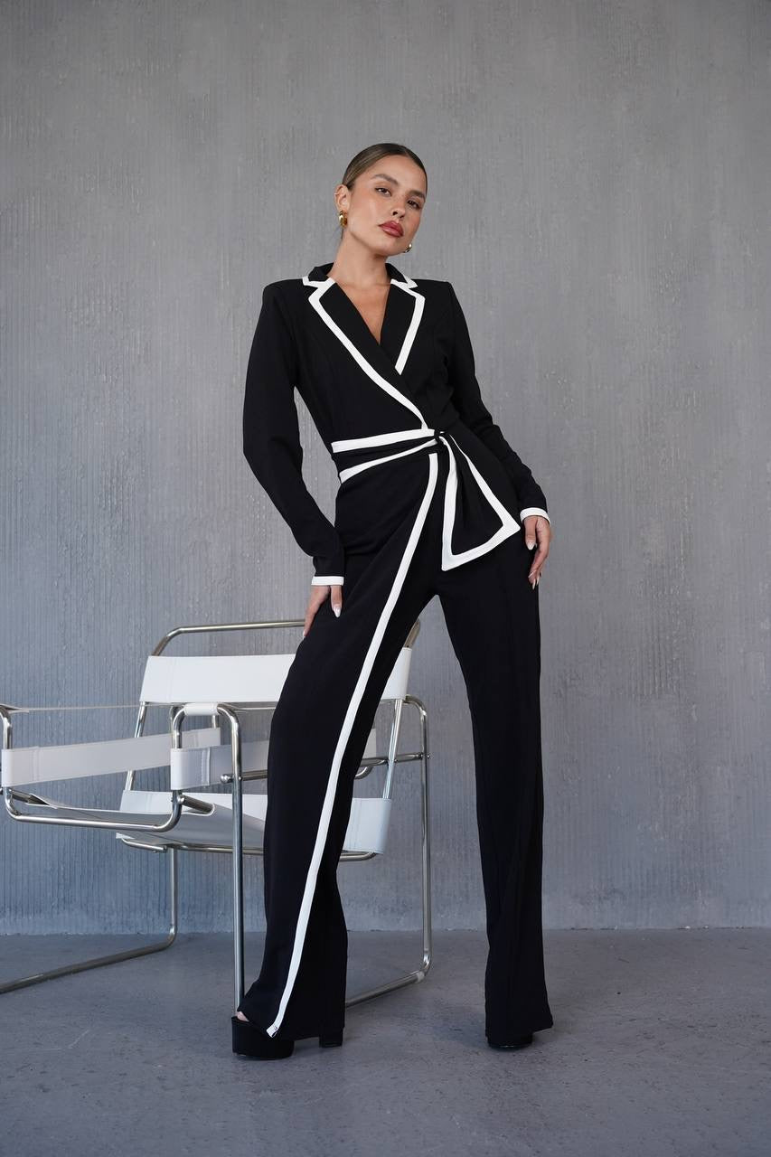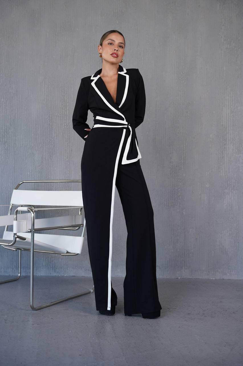 אוברול מחויט וקלאסי בשחור עם פסי קונטרסט לבנים – הלוק שמגדיר מחדש עוצמה נשית.