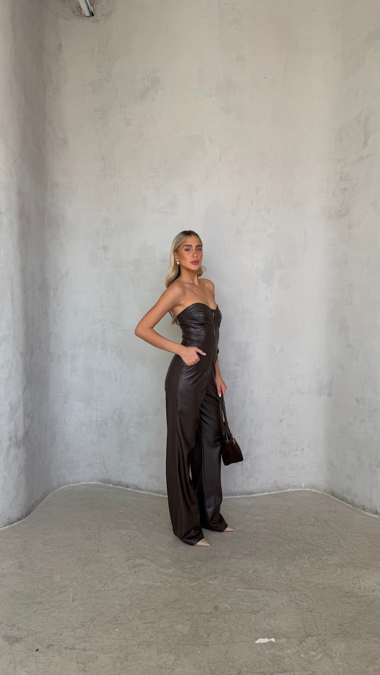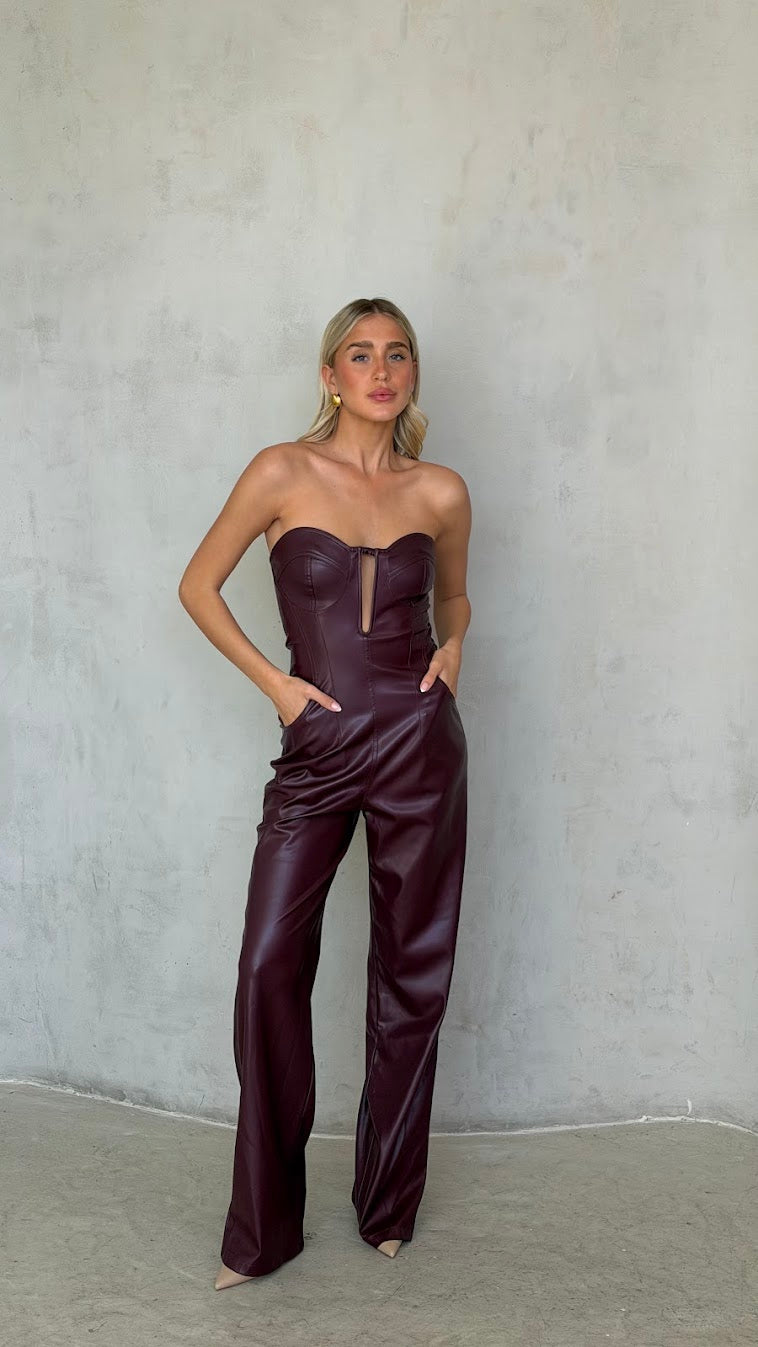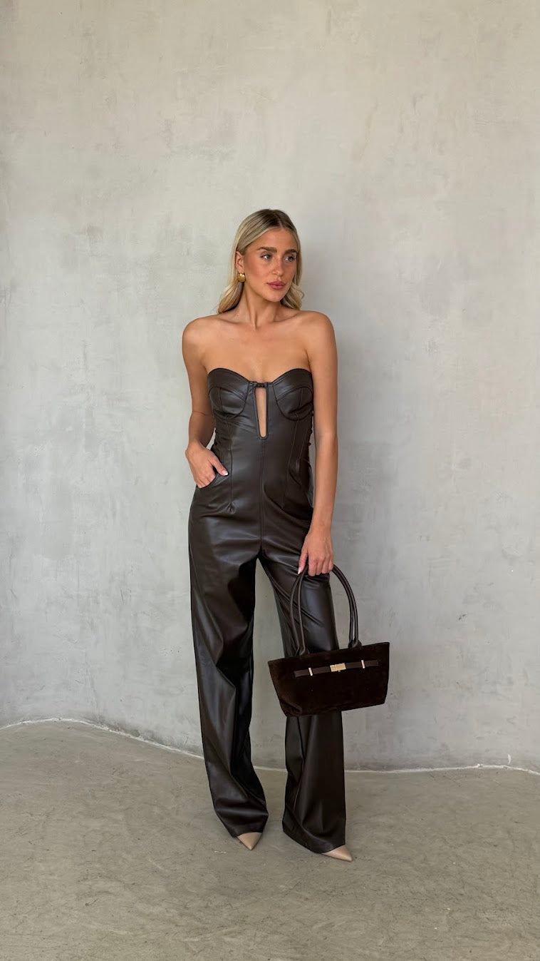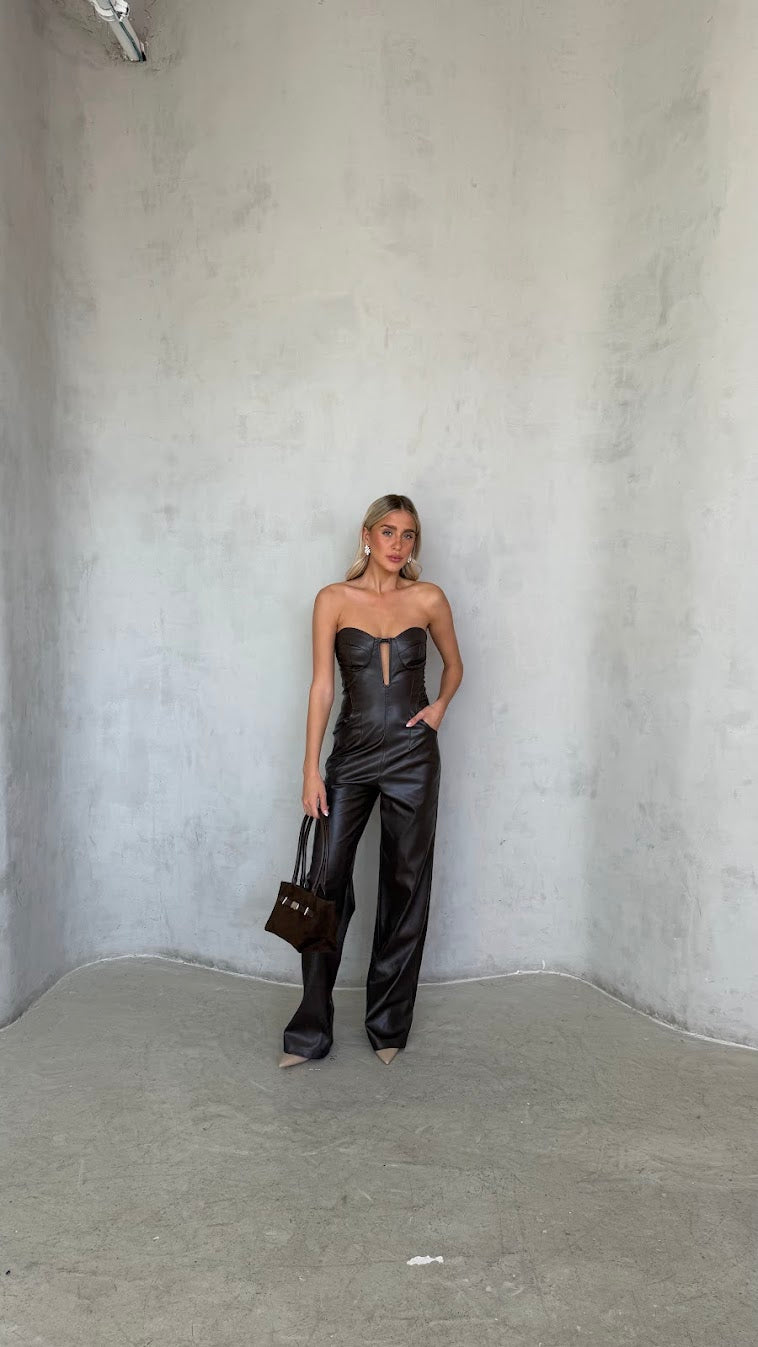 אוברול סטרפלס דמוי עור – מחוך ומכנס רחב