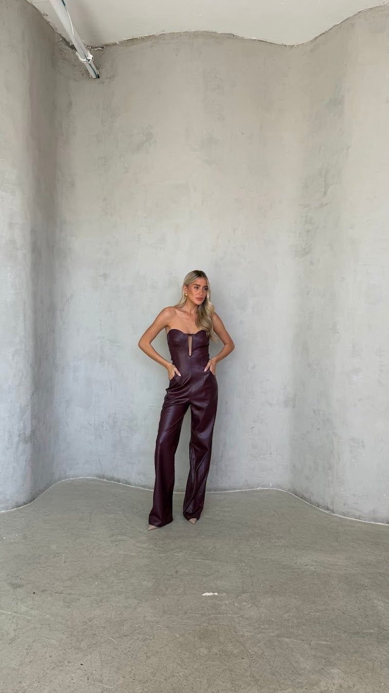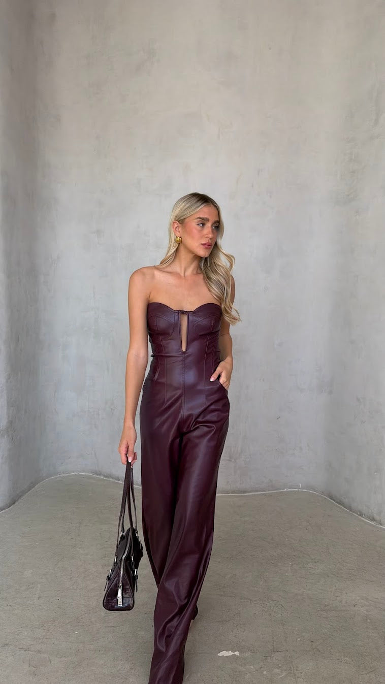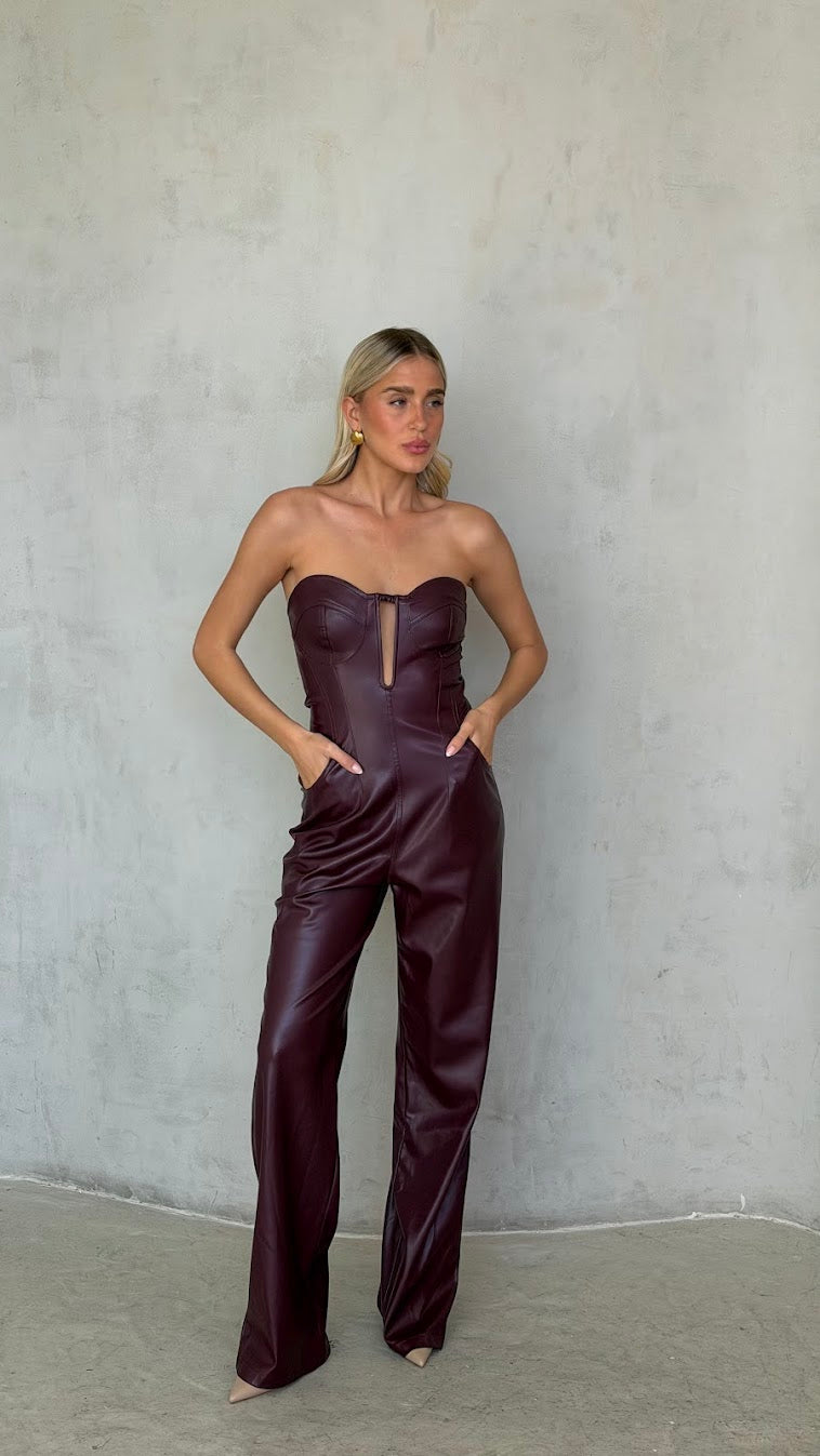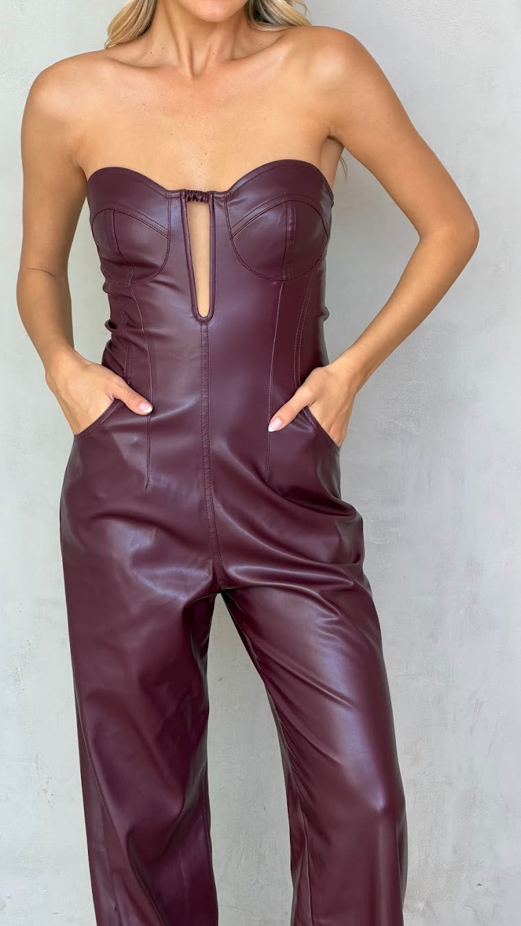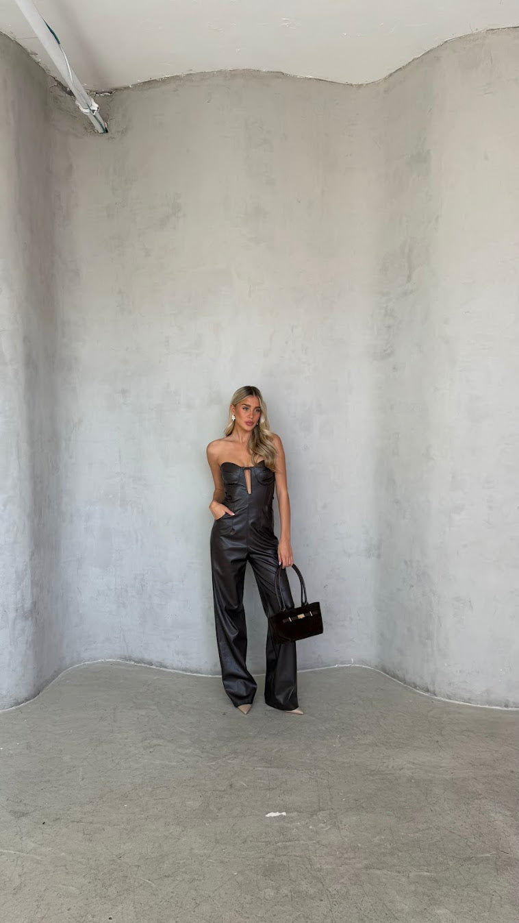 אוברול סטרפלס דמוי עור – מחוך ומכנס רחב