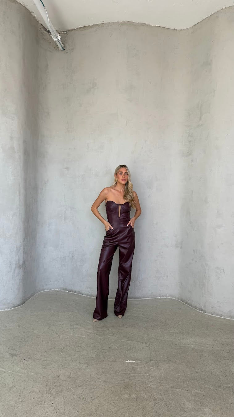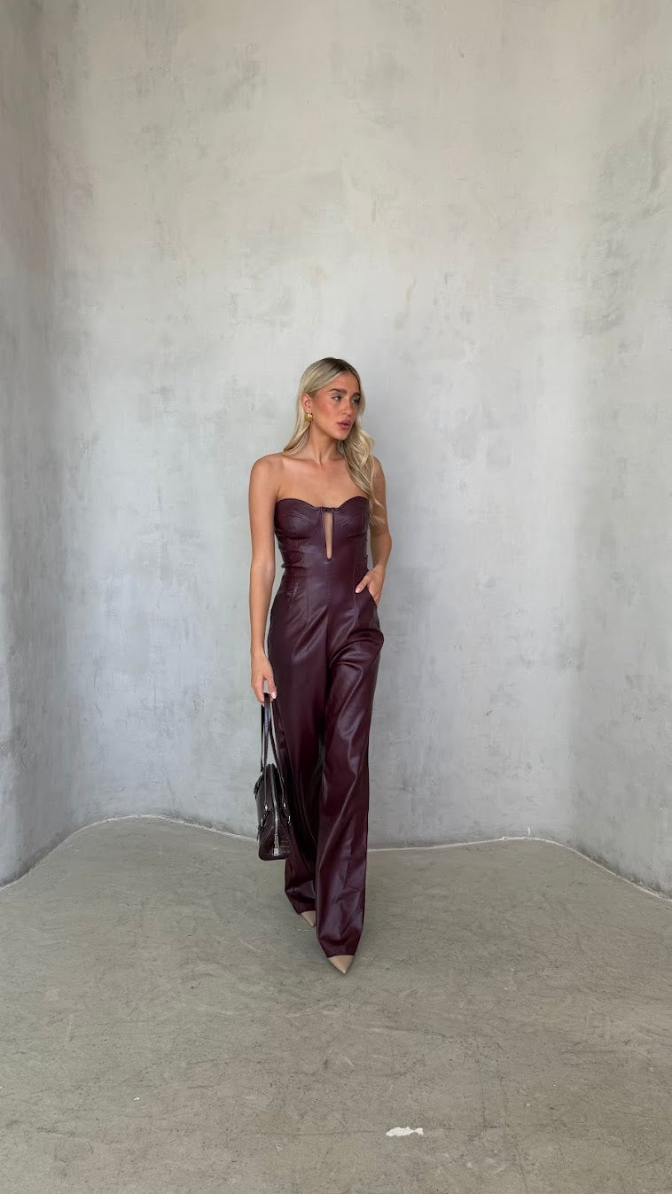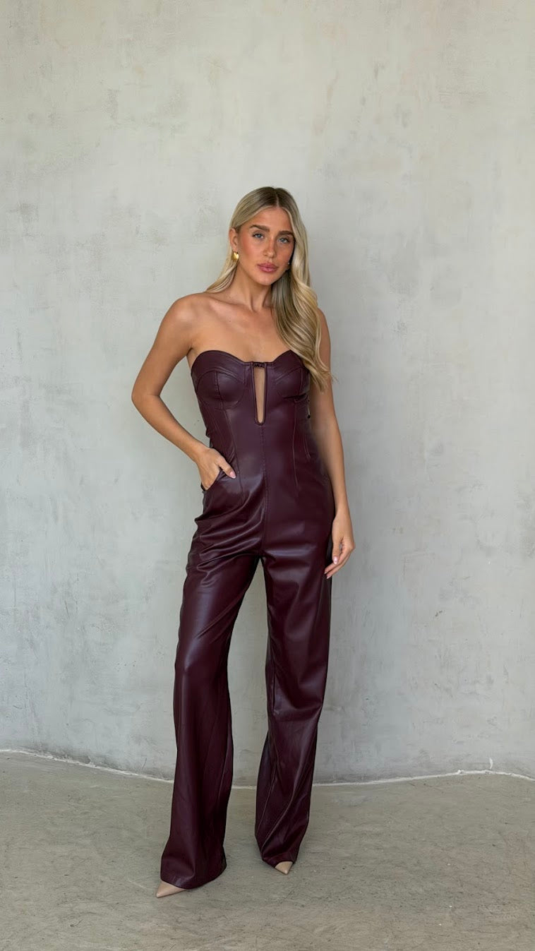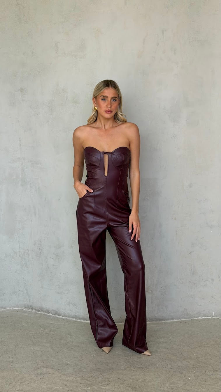 אוברול סטרפלס דמוי עור – מחוך ומכנס רחב