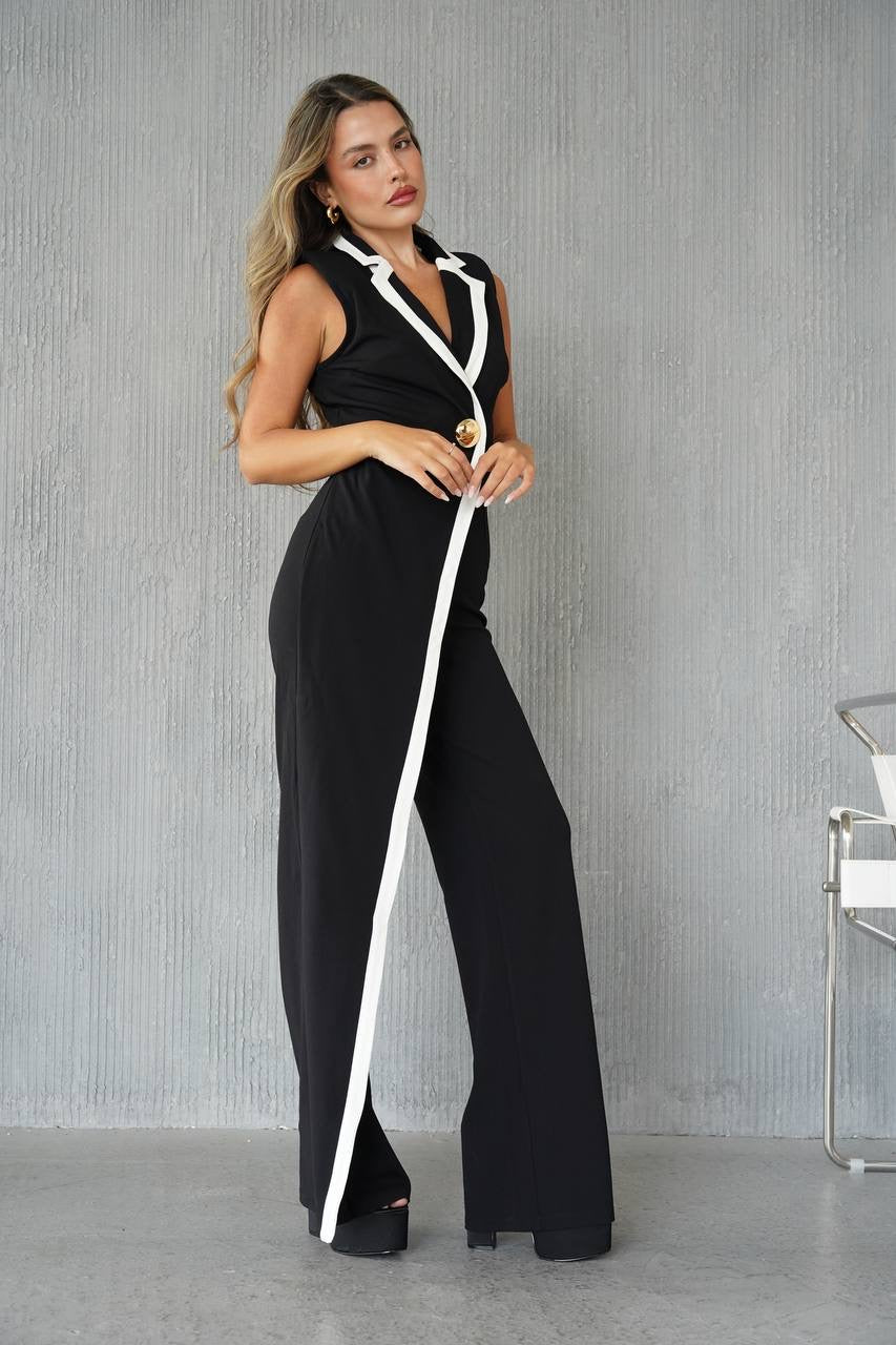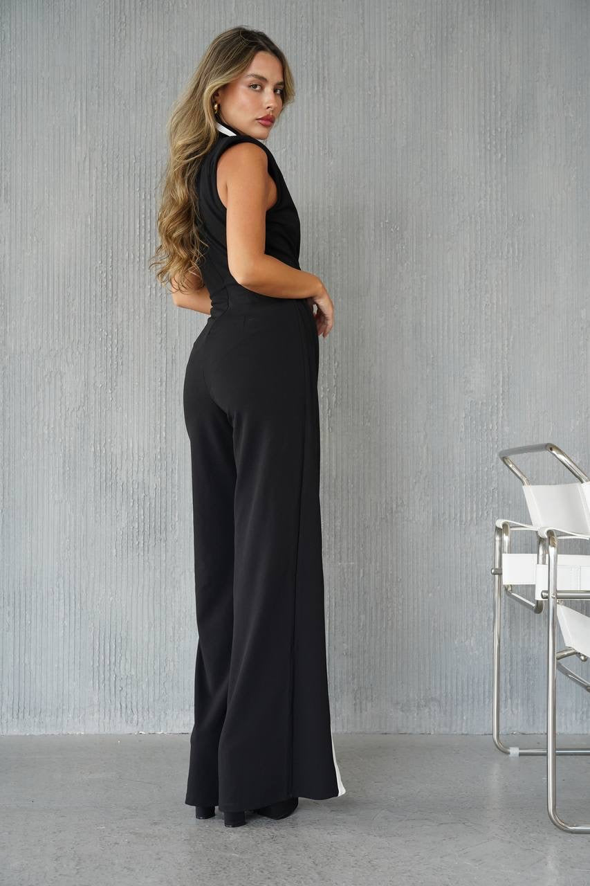 אוברול מחויט ללא שרוולים בגזרה ישרה, משולב פסי קונטראסט לבנים לדגש מחמיא לאורך הגוף.