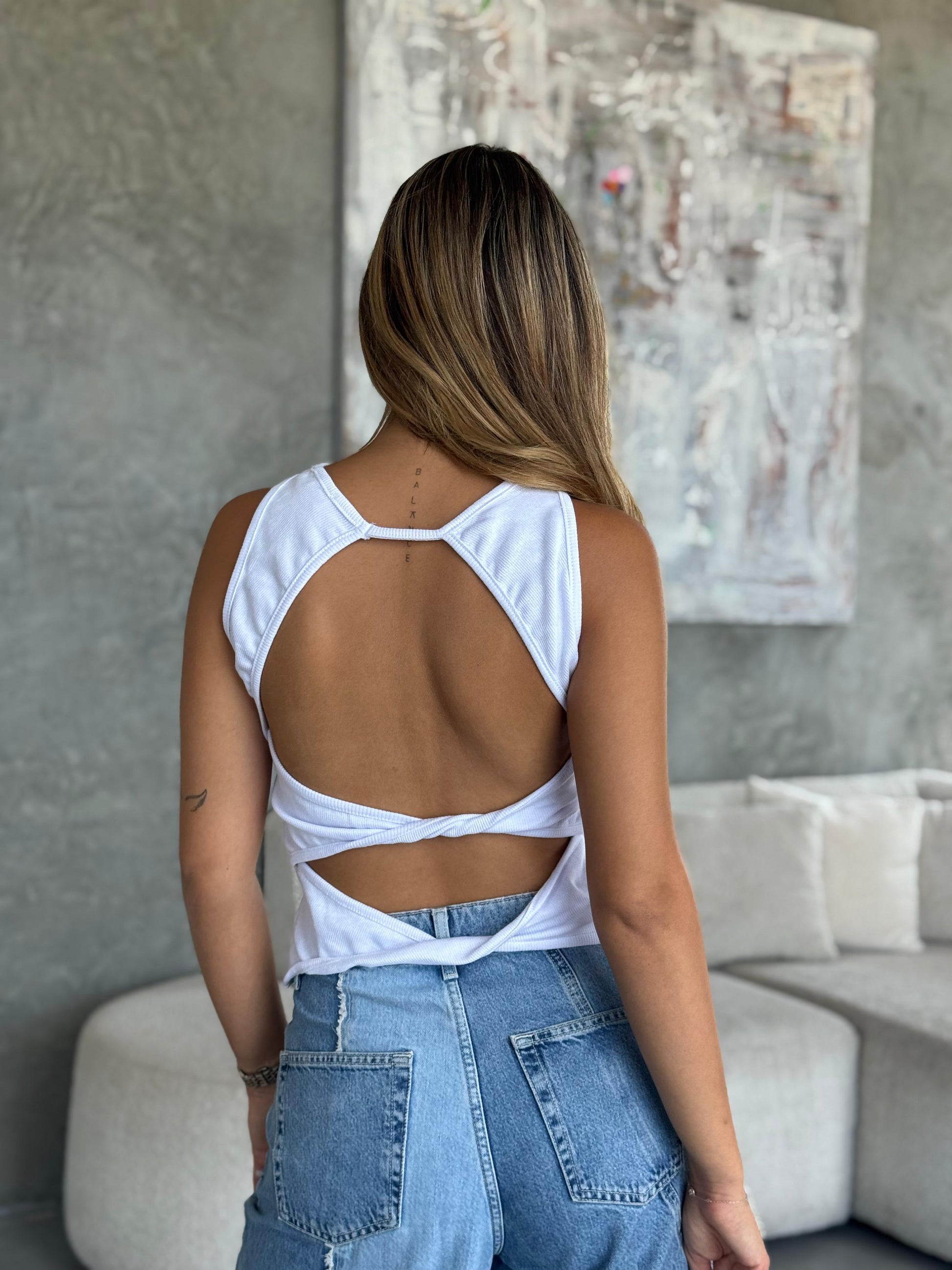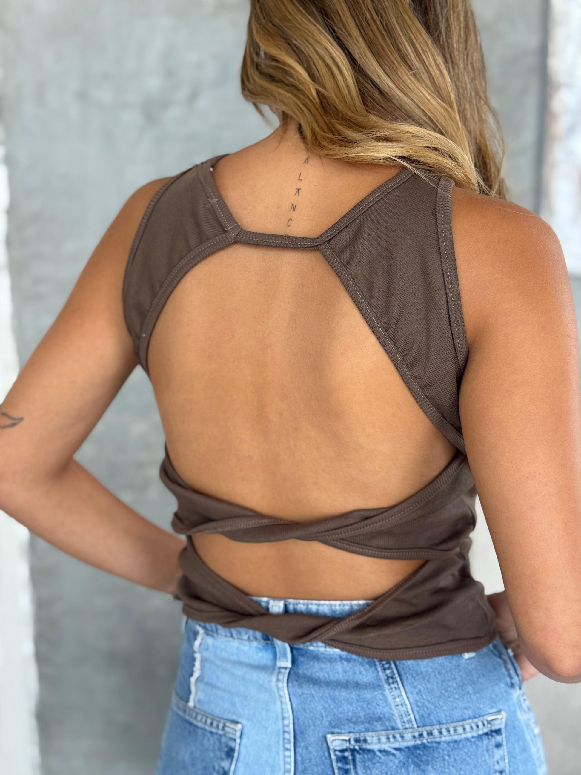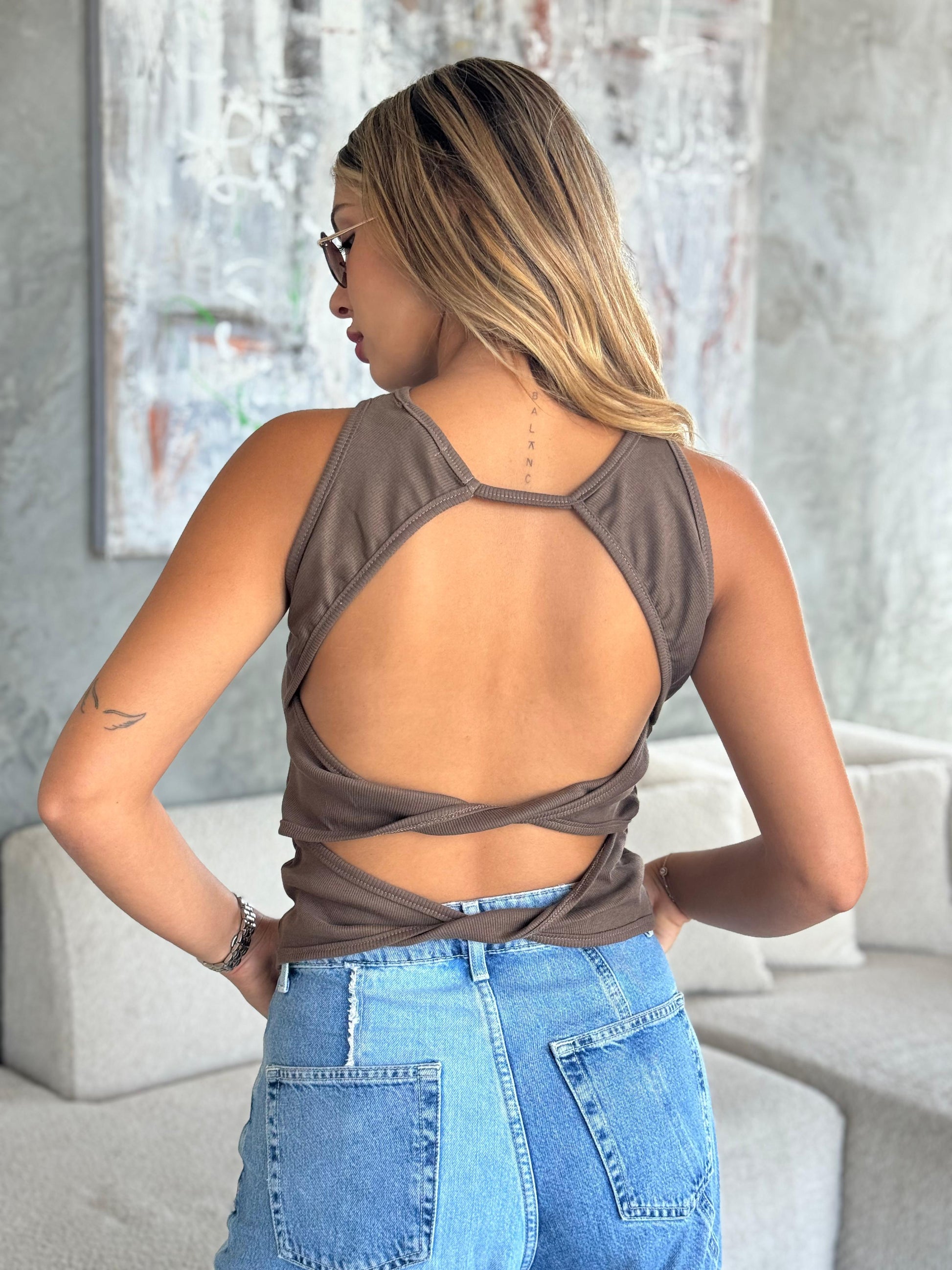 בגב – עיצוב פתוח עם קשירות קרוס-אובר אופנתיות.