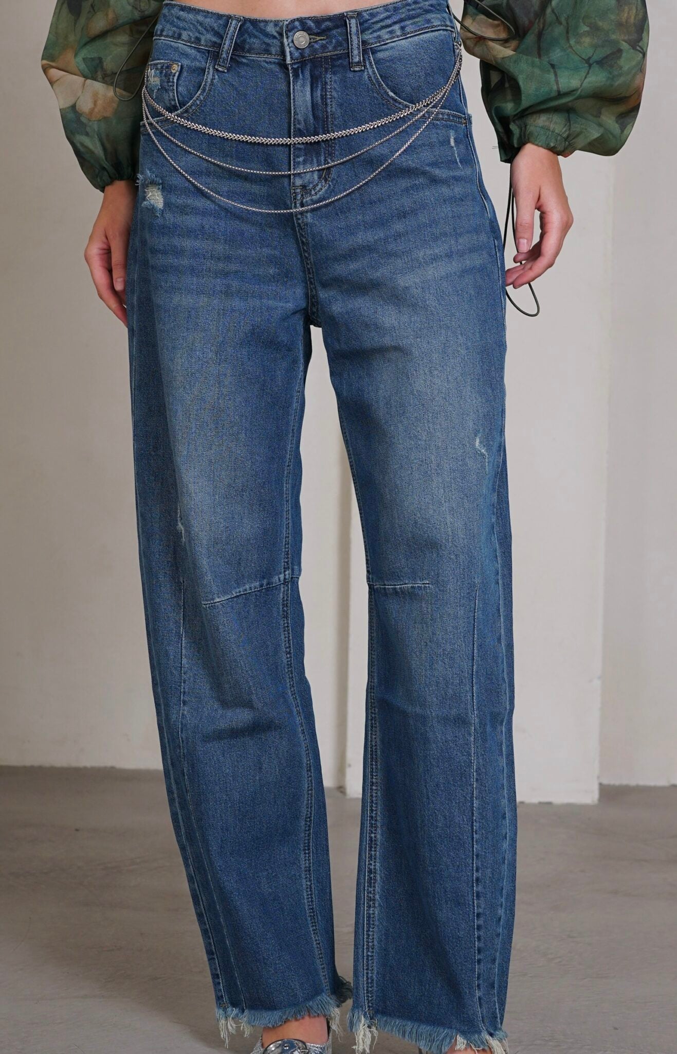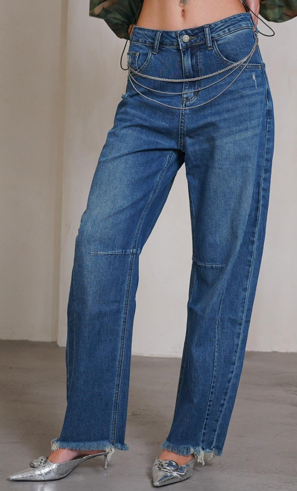 ג’ינס בגזרה רחבה עם חיתוך פרום – דגם אוברסייז בגוון דנים קלאסי, עם קרעים עדינים וסיומת פרומה למראה קז’ואל-שיק. יושב גבוה במותן ומחמיא לגוף, בשילוב שרשרת במותן,עם טאץ’ עדכני שמתאים גם ליום-יום וגם ליציאה.