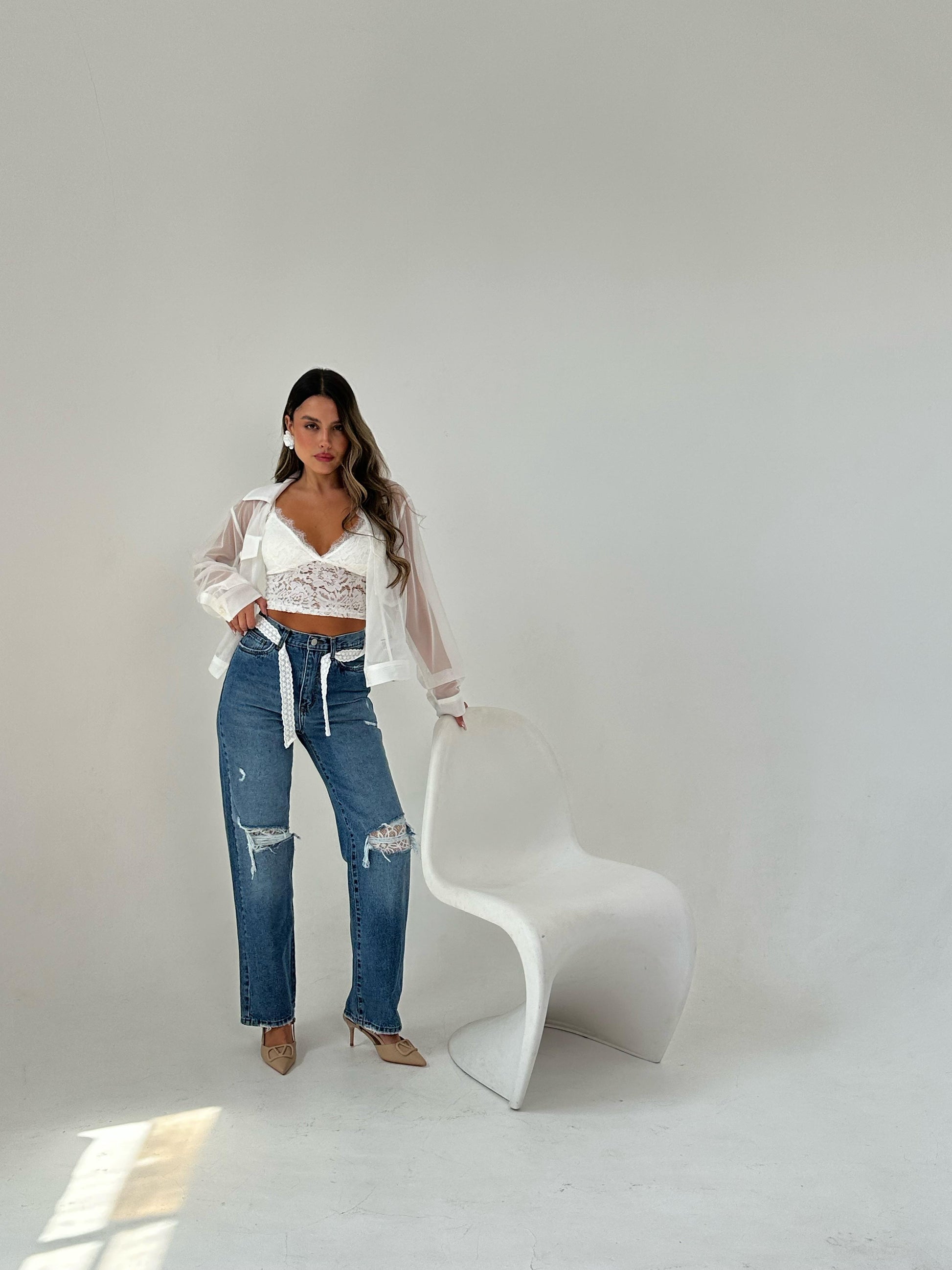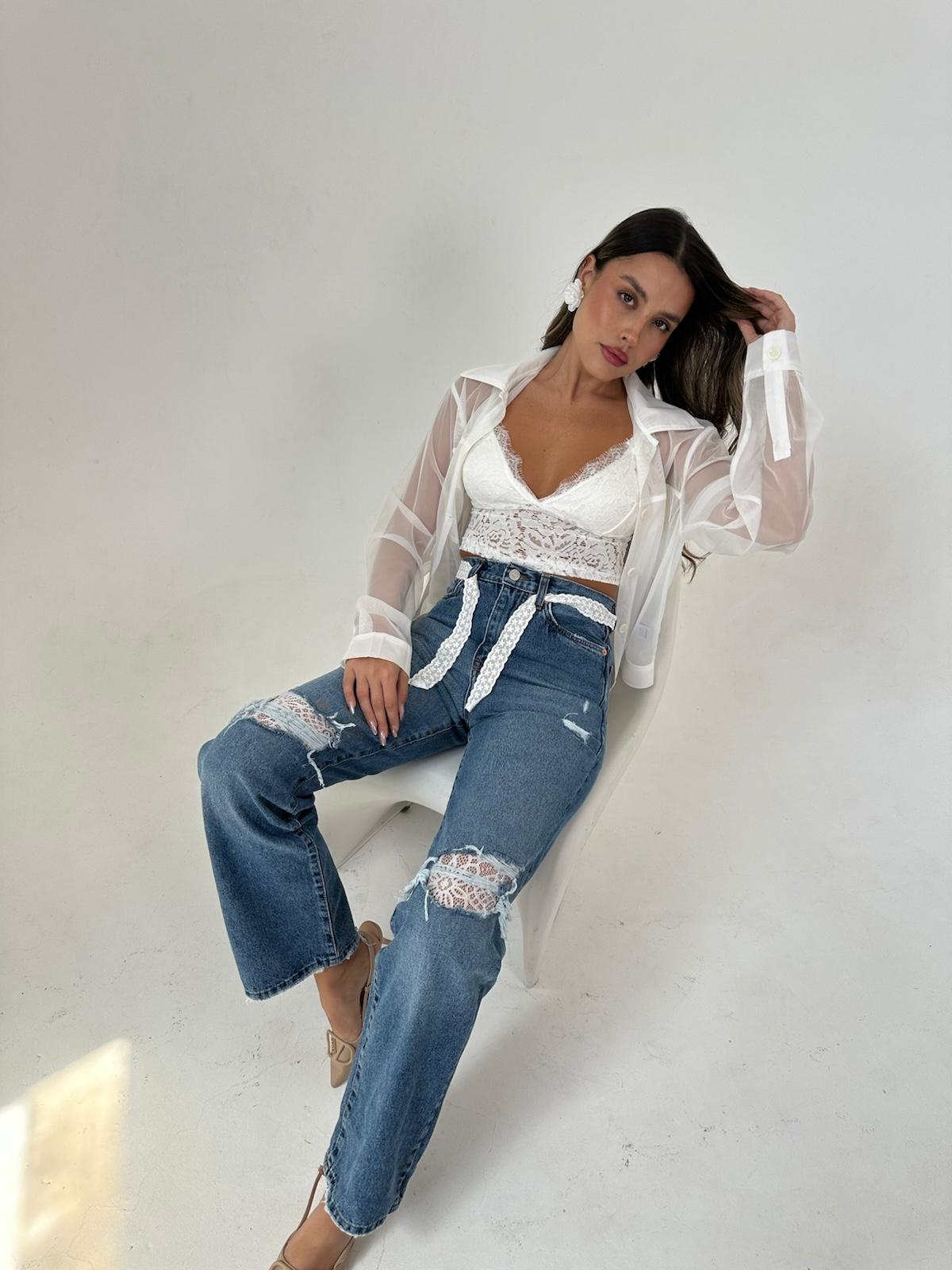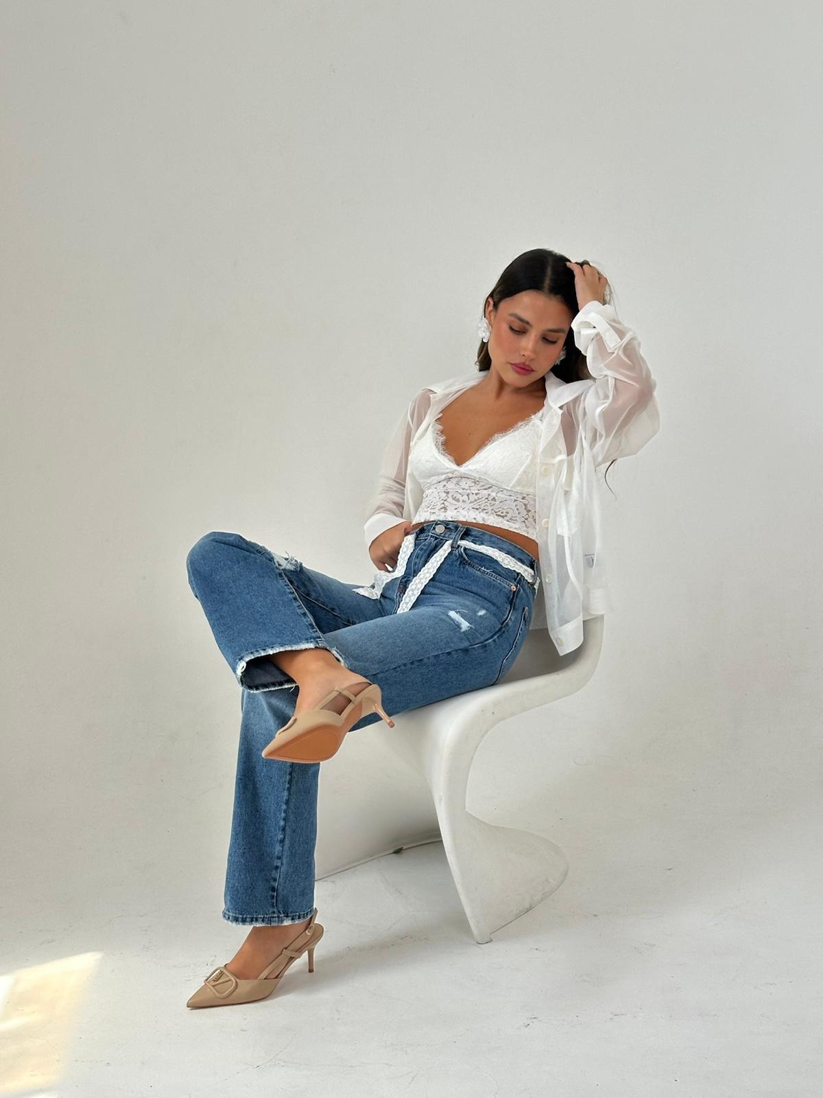 מכנסי ג’ינס קלאסיים בגזרת סטרייט ישרה, עם קרעים עדינים שנותנים טאץ’ עדכני וקליל. הבד הדנים איכותי ונוח, מתאים לשימוש יום־יומי וגם לשילובים אלגנטיים יותר עם עקבים.