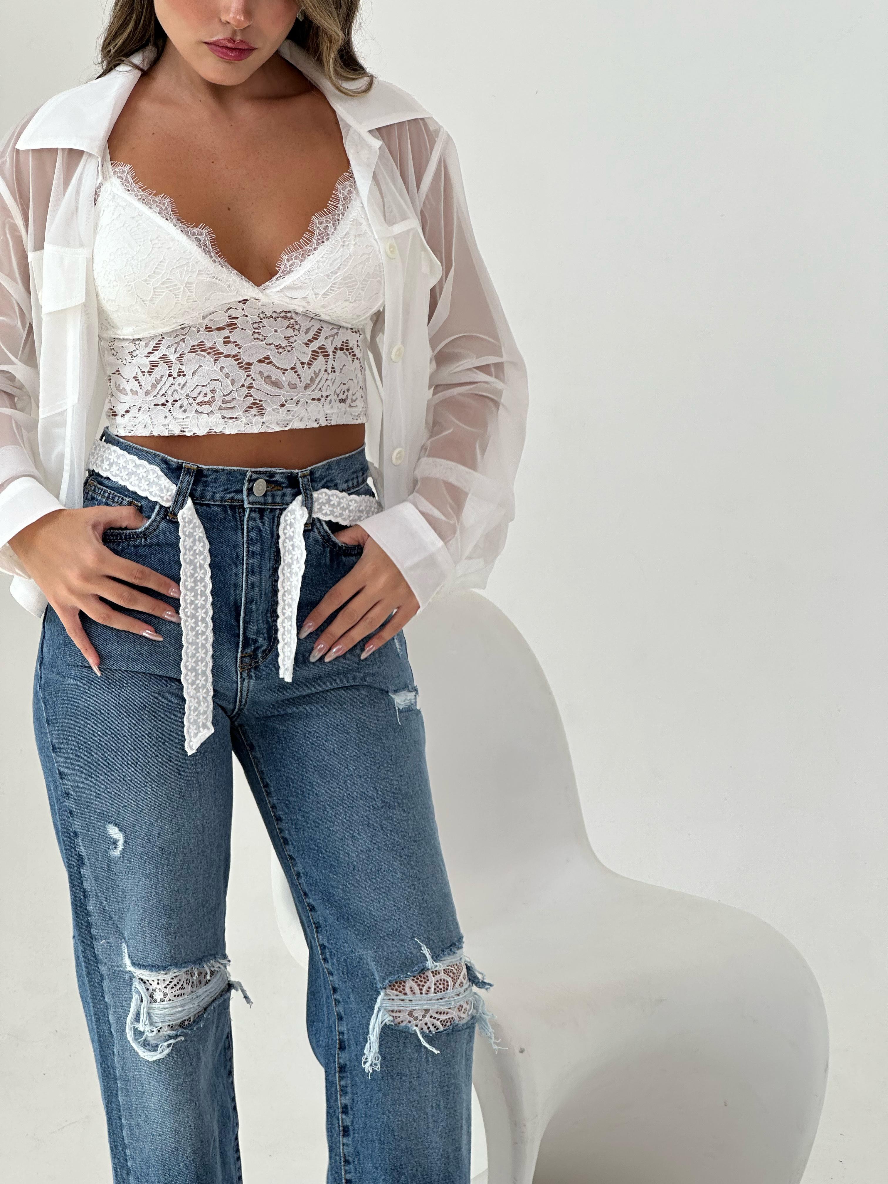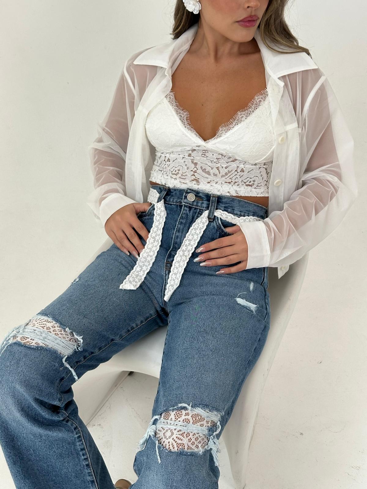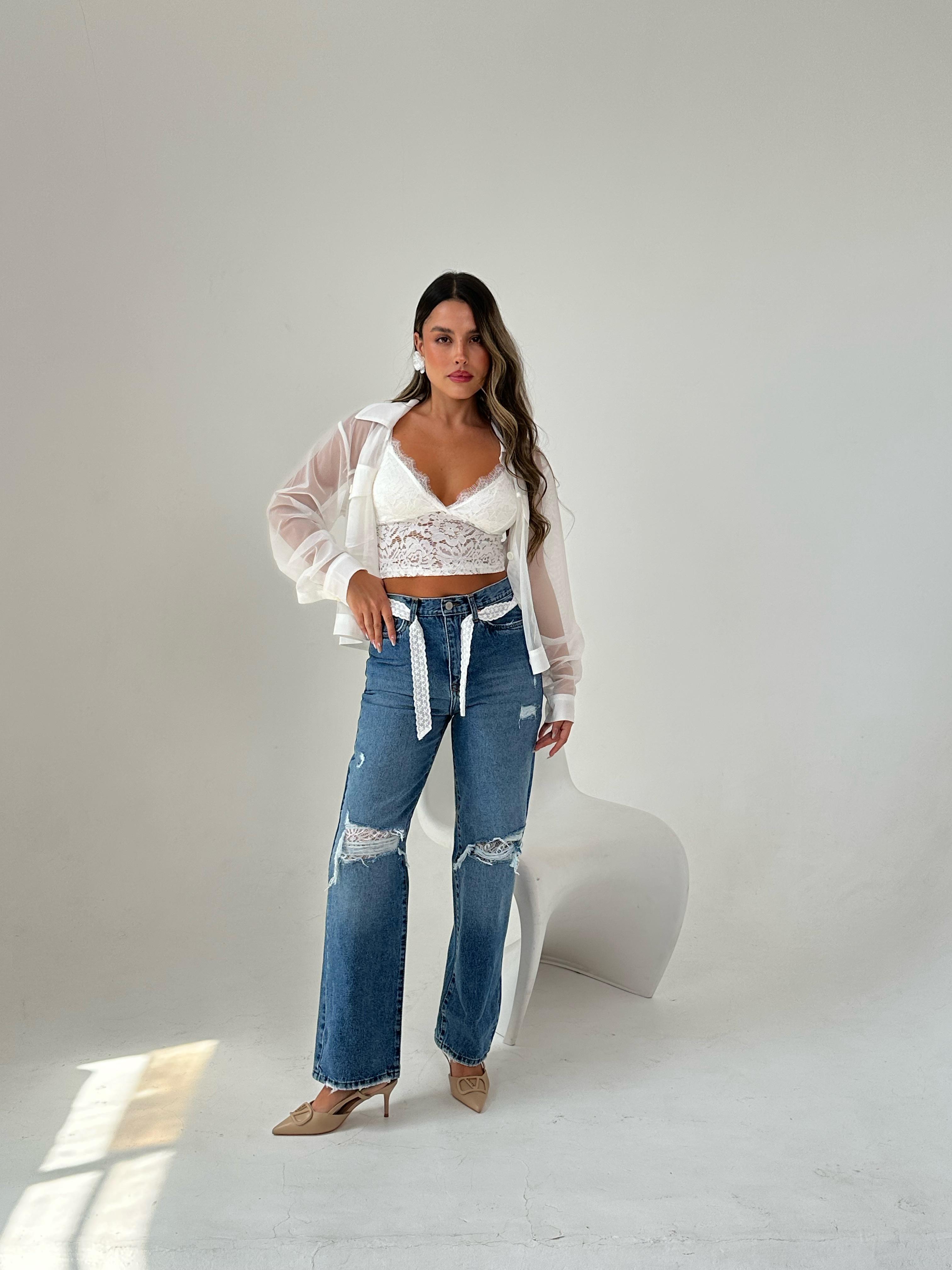 מכנסי ג’ינס קלאסיים בגזרת סטרייט ישרה, עם קרעים עדינים שנותנים טאץ’ עדכני וקליל. הבד הדנים איכותי ונוח, מתאים לשימוש יום־יומי וגם לשילובים אלגנטיים יותר עם עקבים.