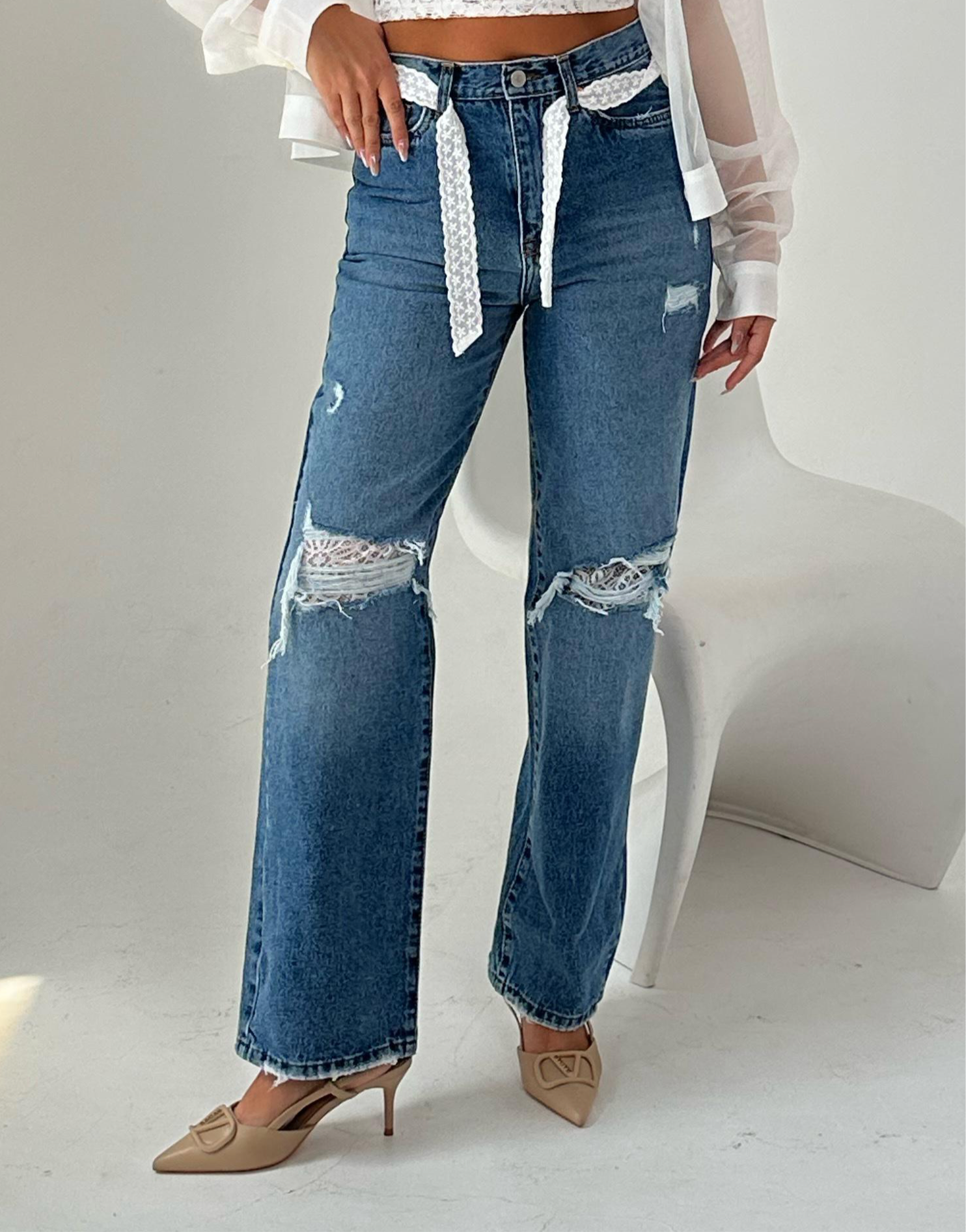 ג’ינס כחול בגזרת סטרייט עם קרעים עדינים