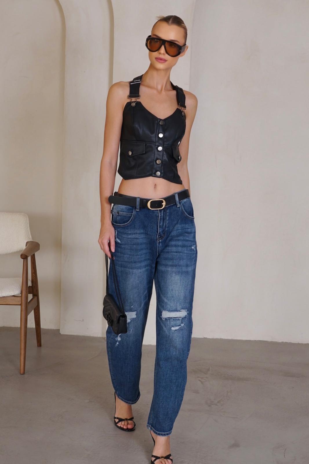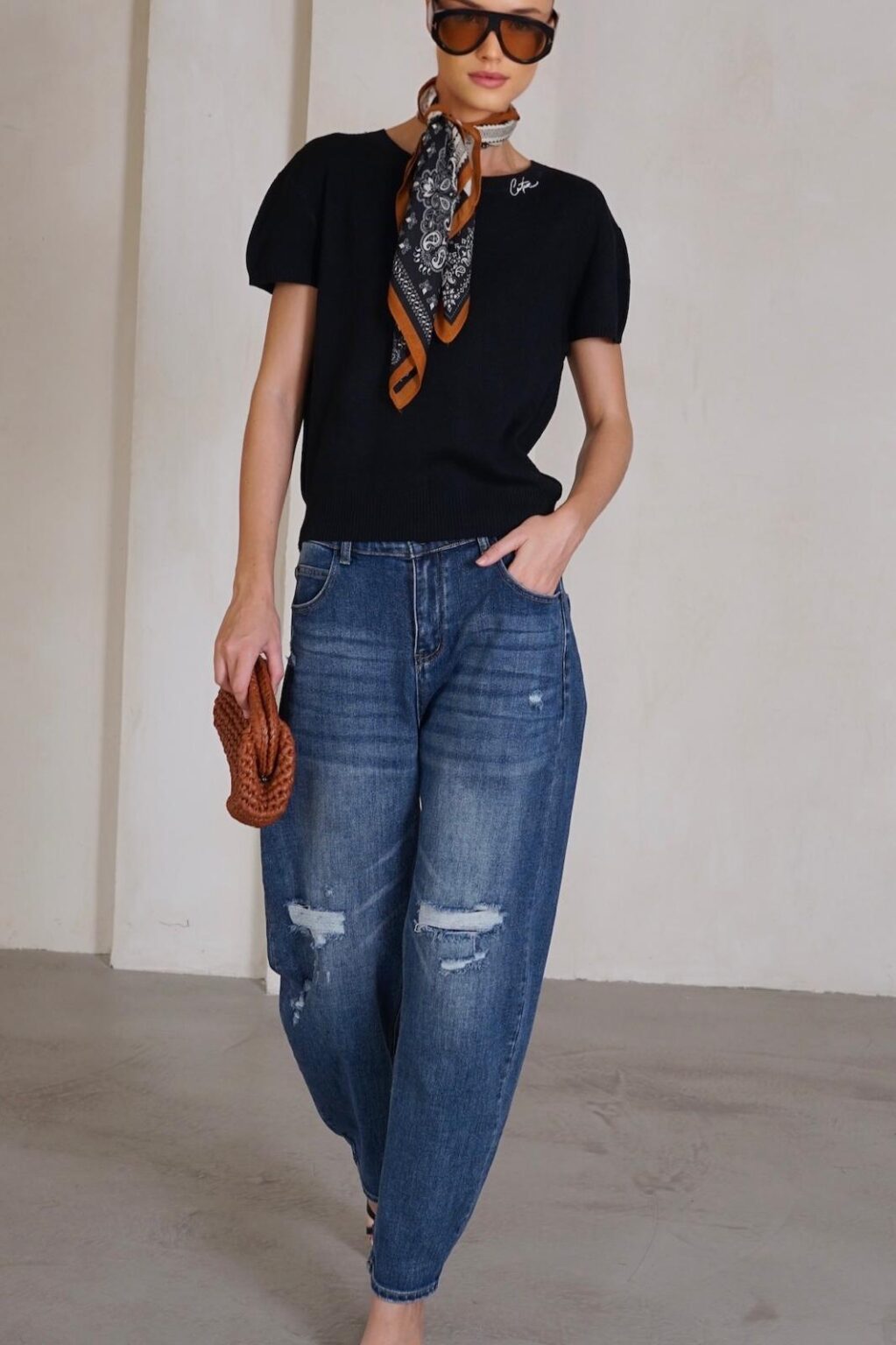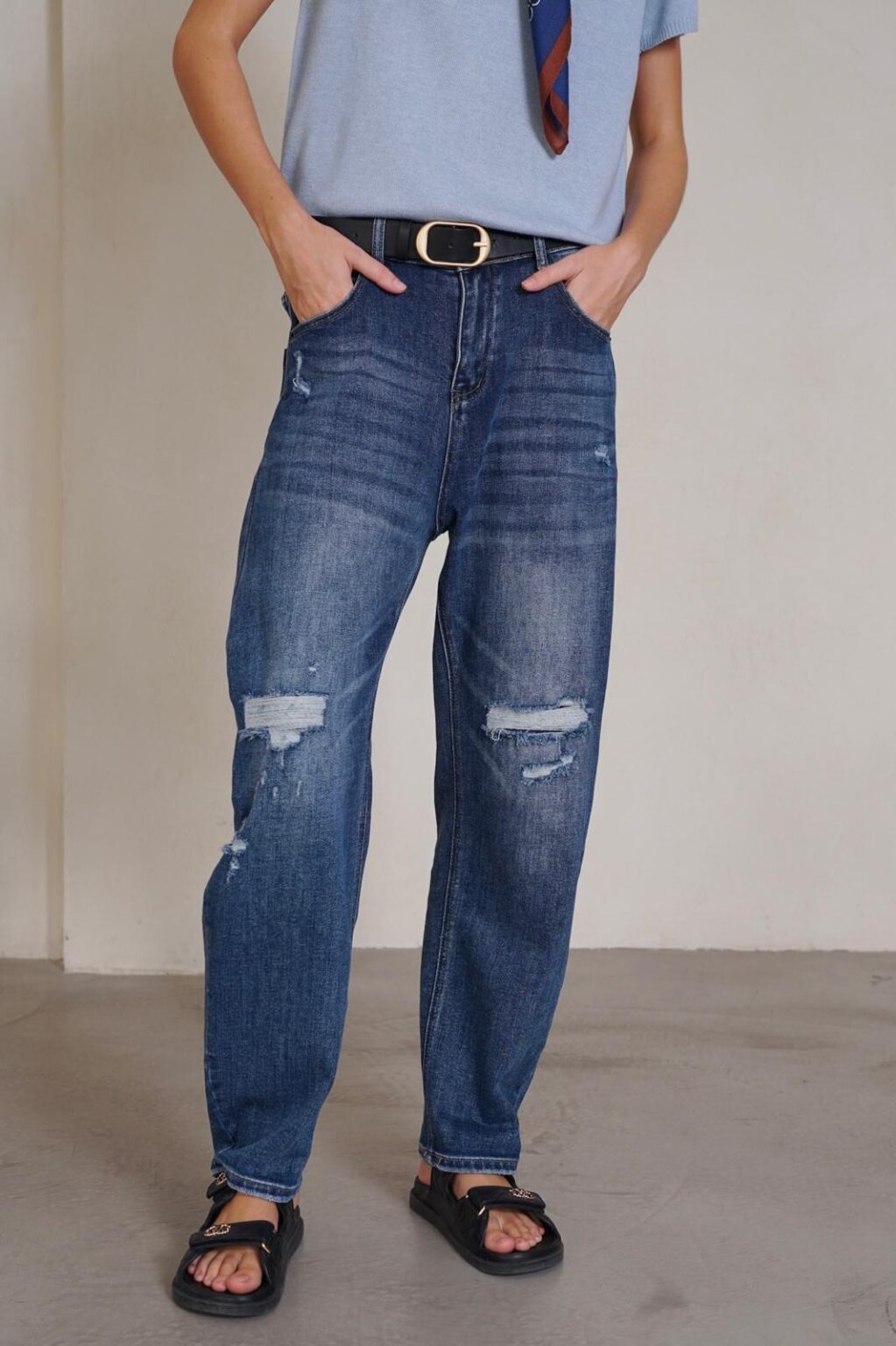 גינס בצבע כהה עם קרעים בגזרה ישרה סיומת מתרחבת .