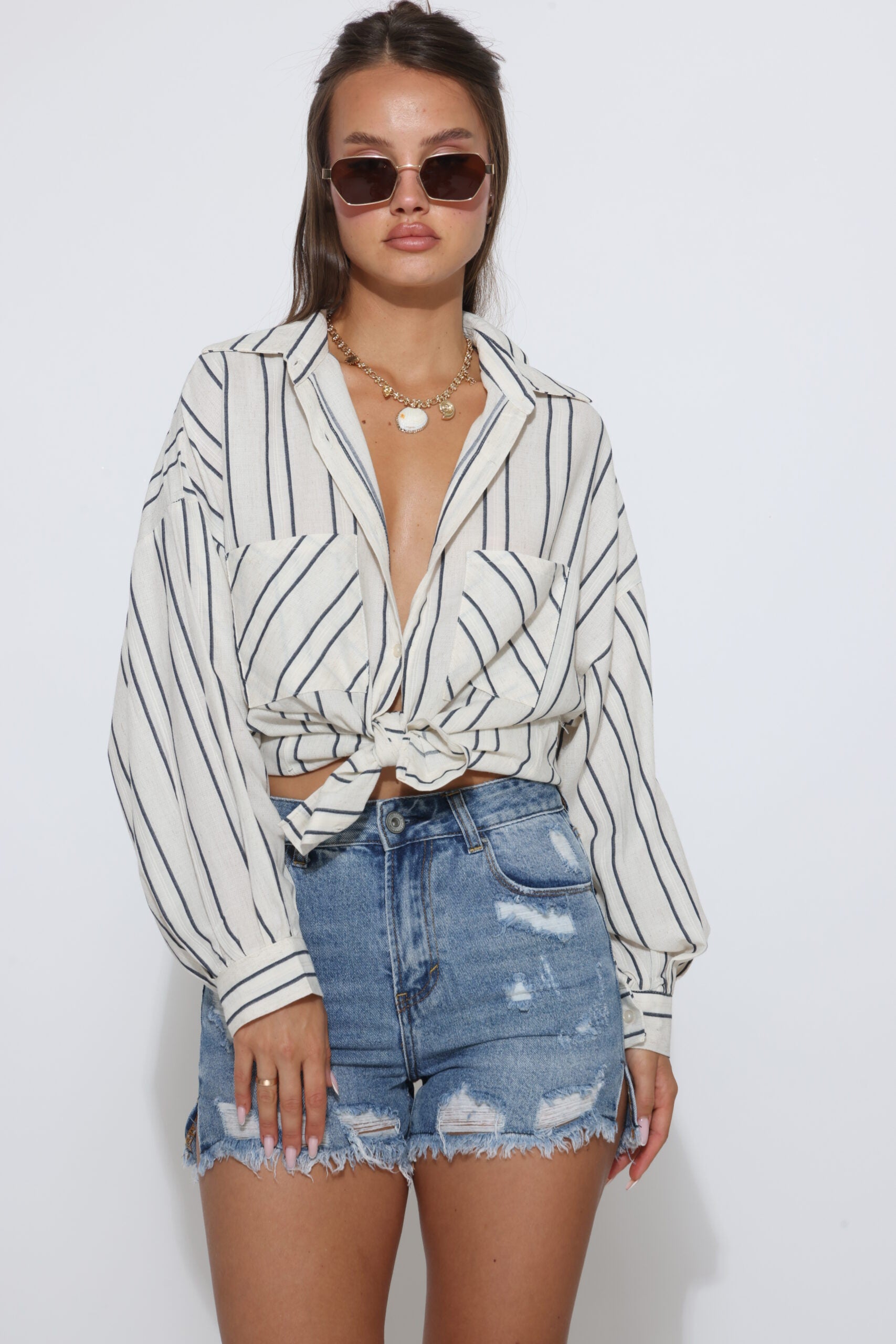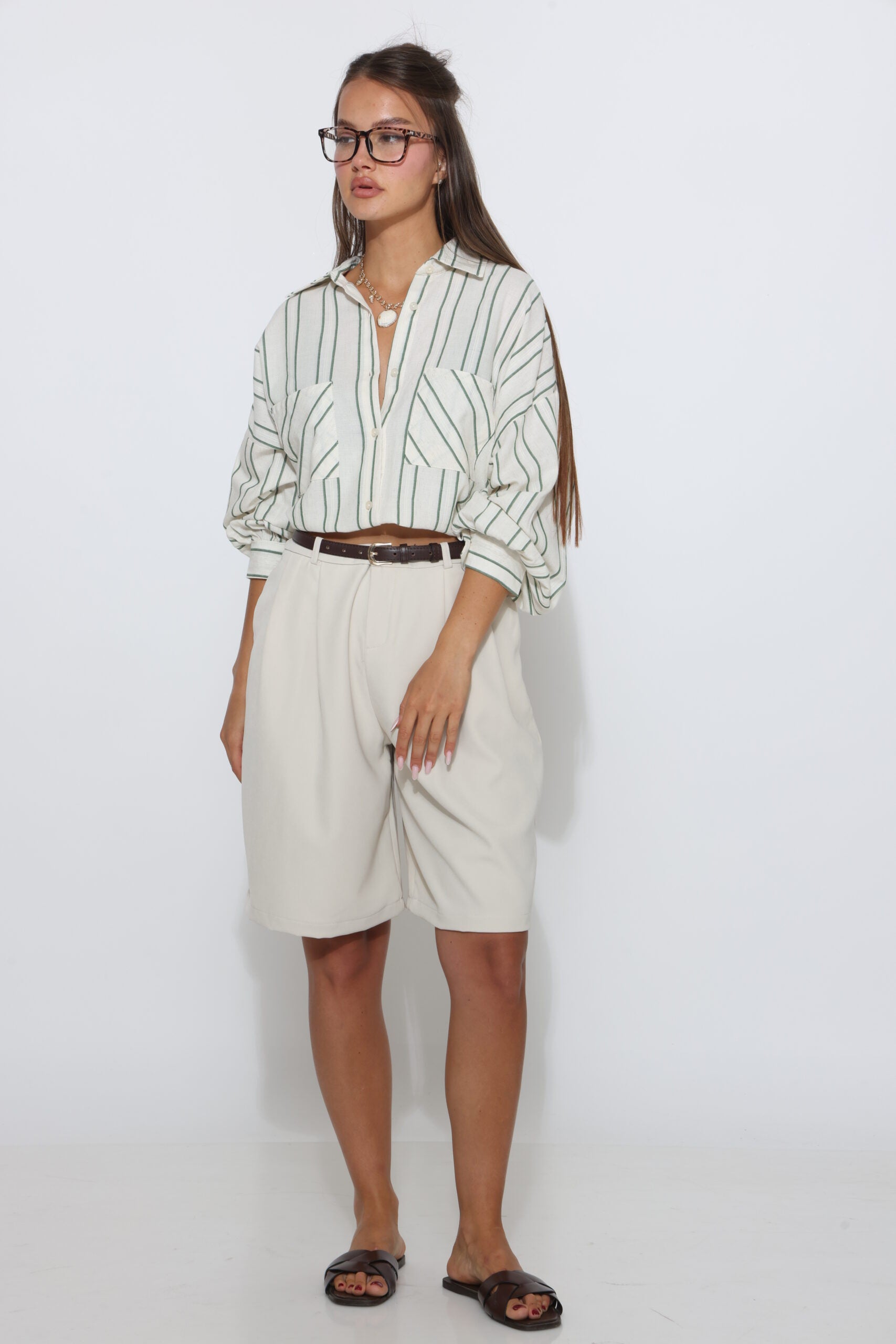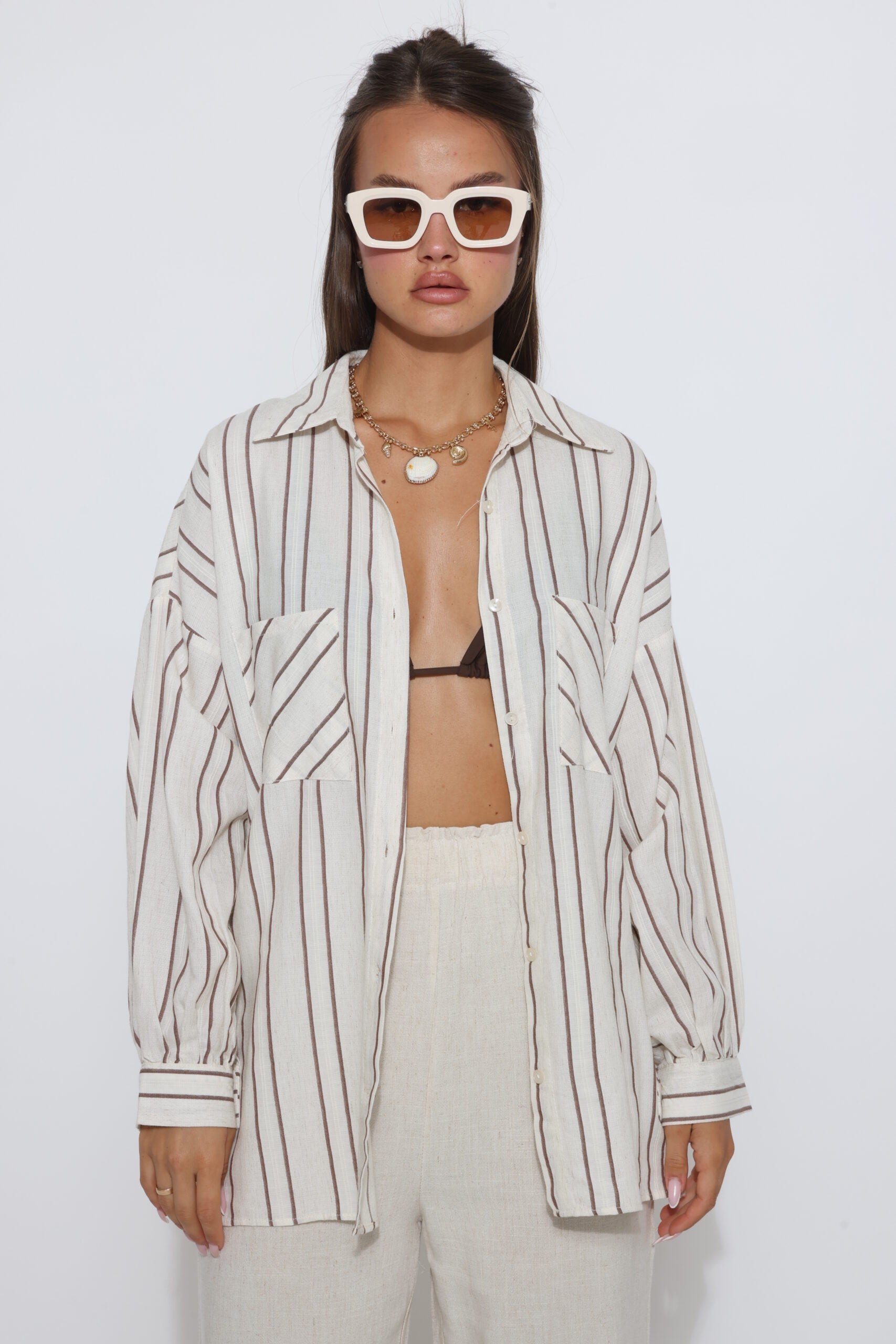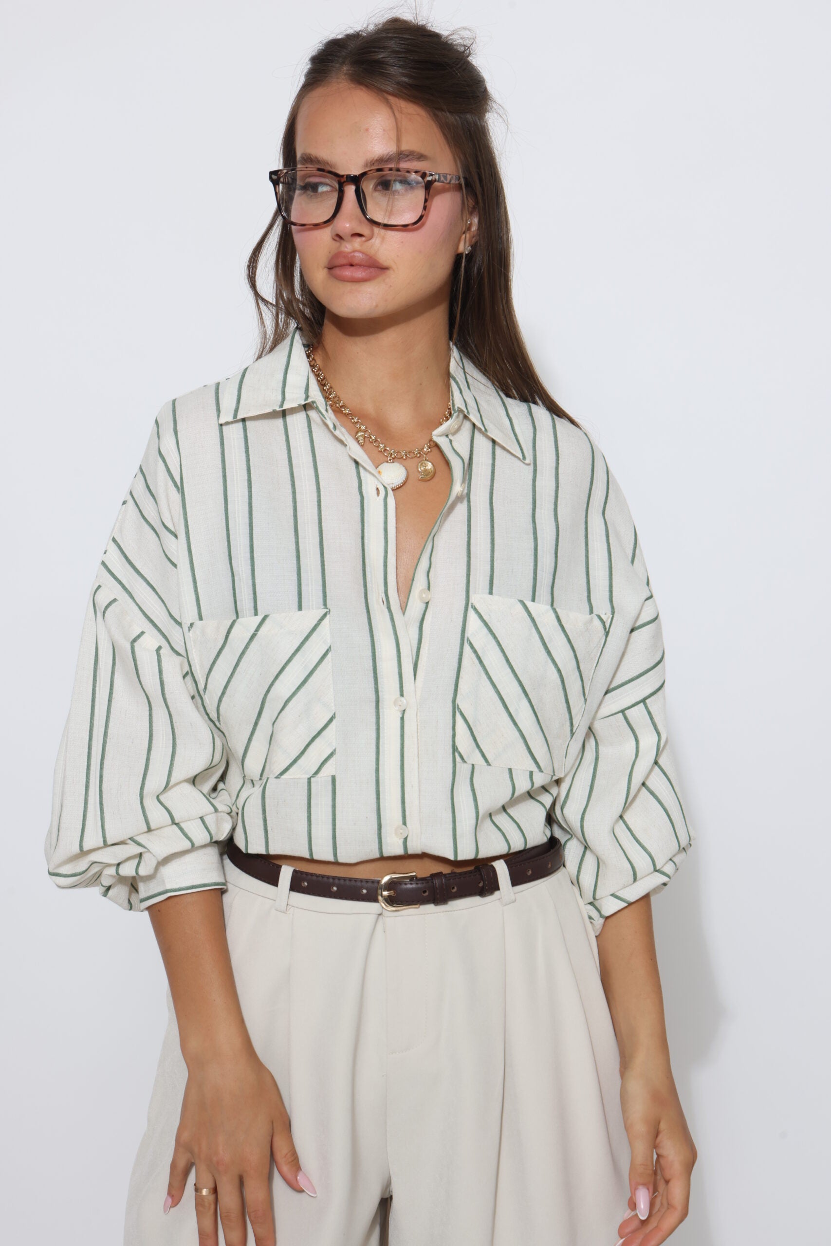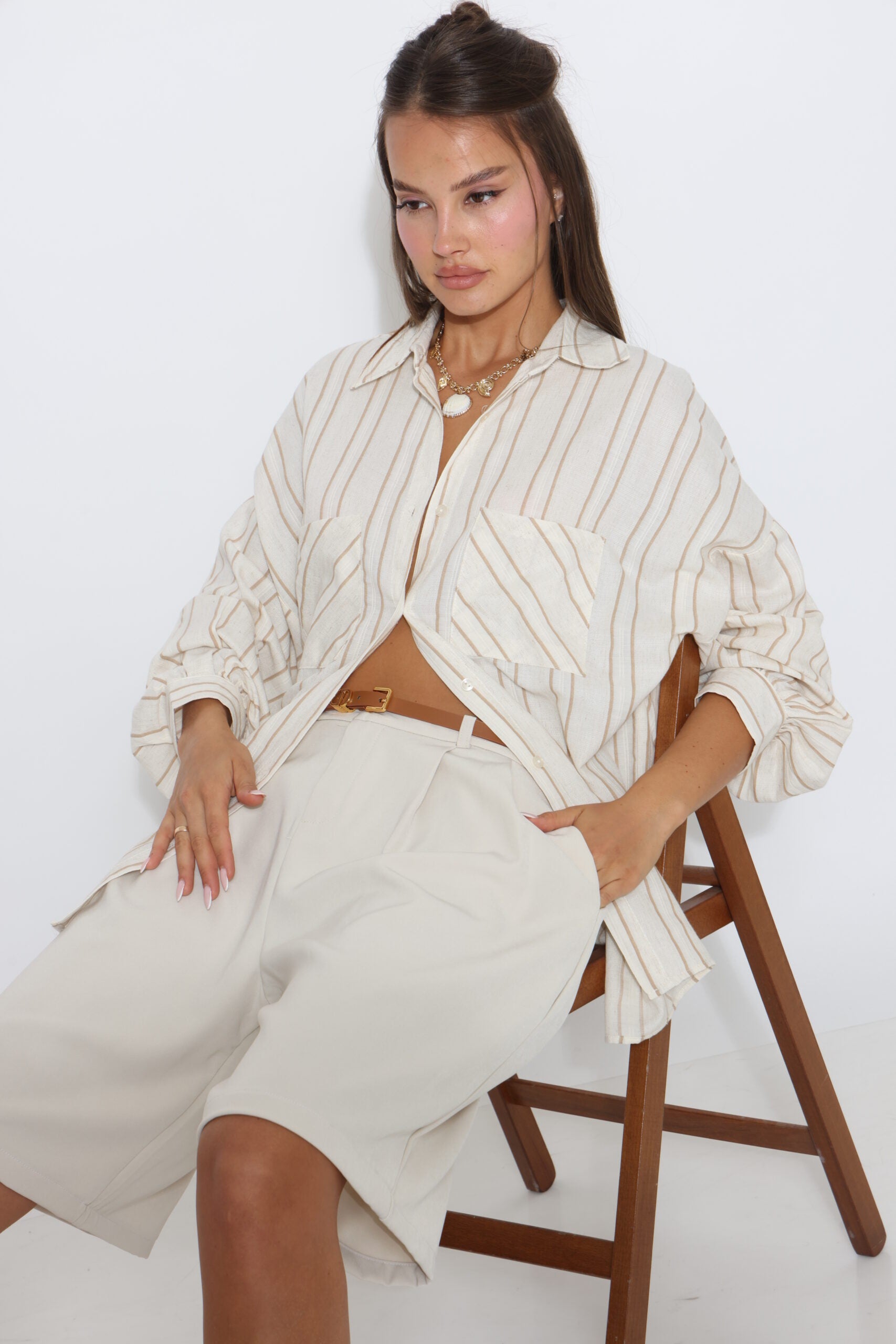 חולצה מכופתרת קלילה בסגנון בוי-פרנד עם פסים בצבעים על רקע שמנת טבעי. עשויה בד נעים ונושם שמתאים בדיוק לעונת המעבר או לקיץ .