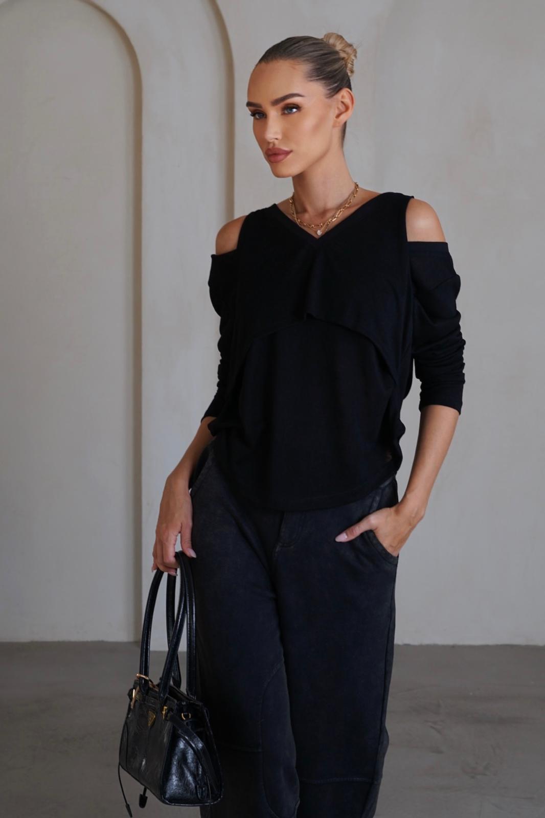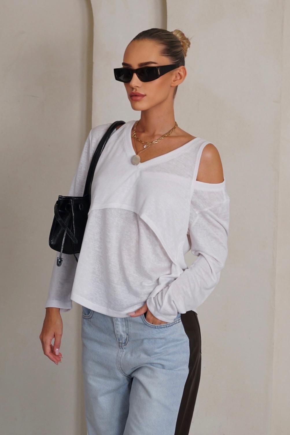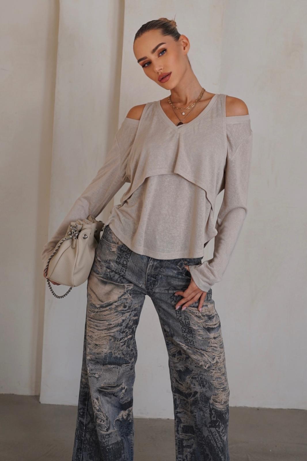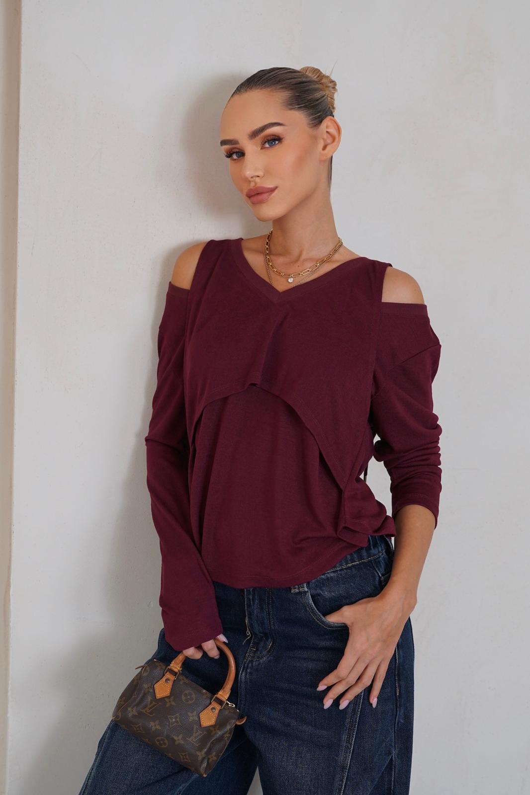 חולצה עם כתפיים חשופות מפתח וי  וכובע קפוצון, בגזרה מחמיאה ומיוחדת.
