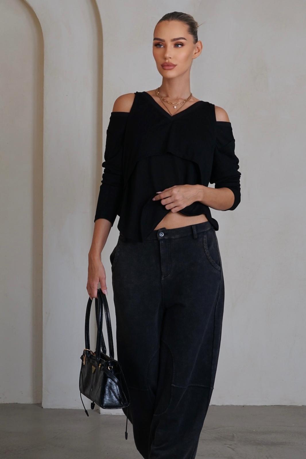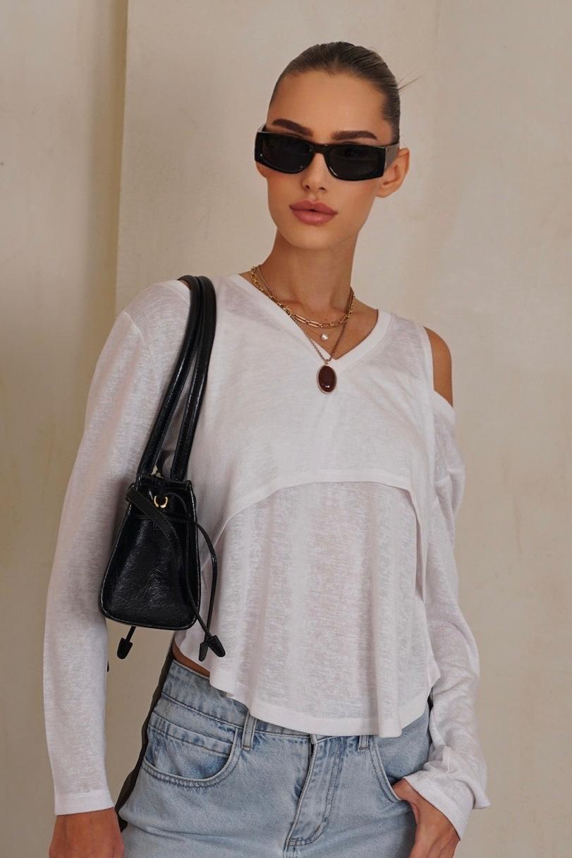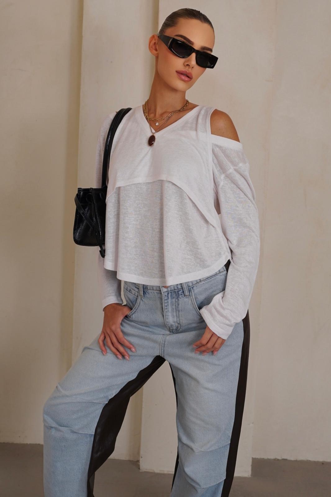 חולצה עם כתפיים חשופות מפתח וי  וכובע קפוצון, בגזרה מחמיאה ומיוחדת.