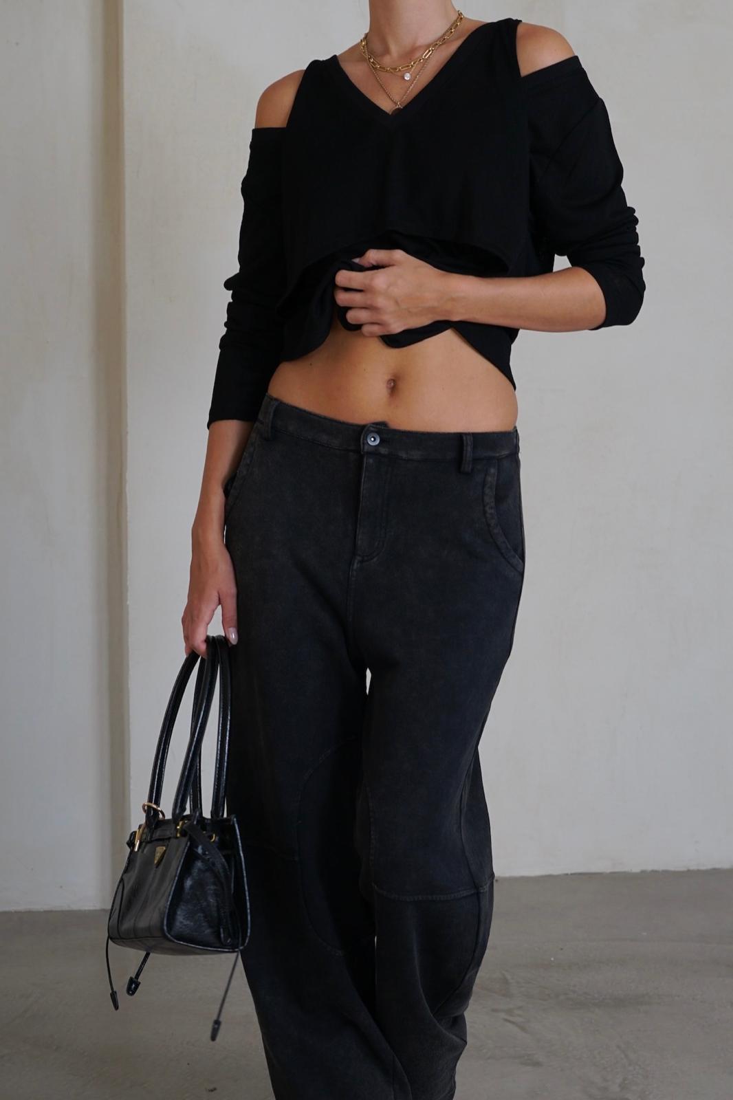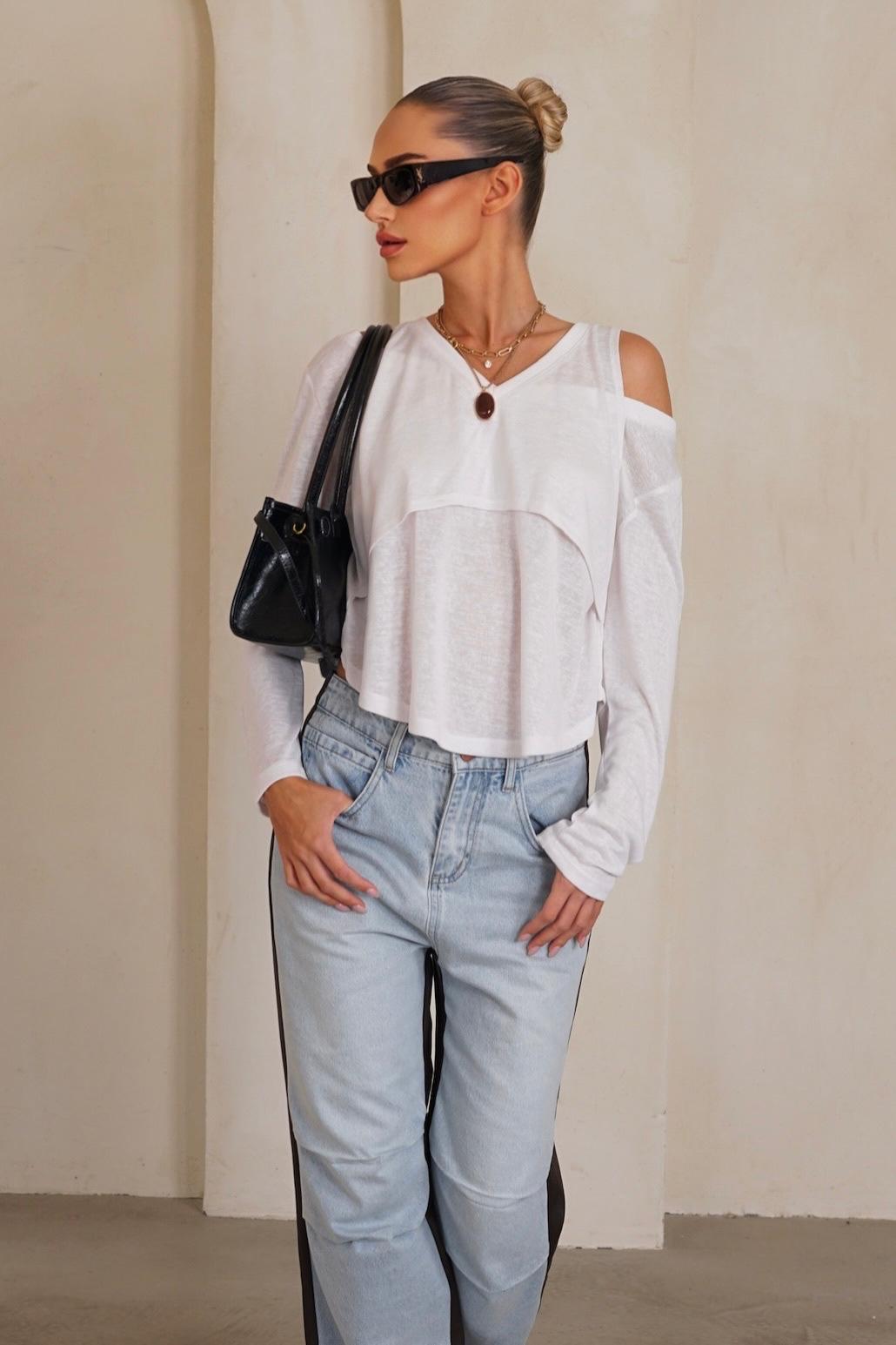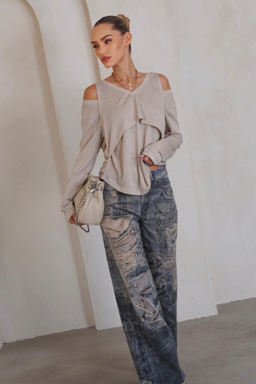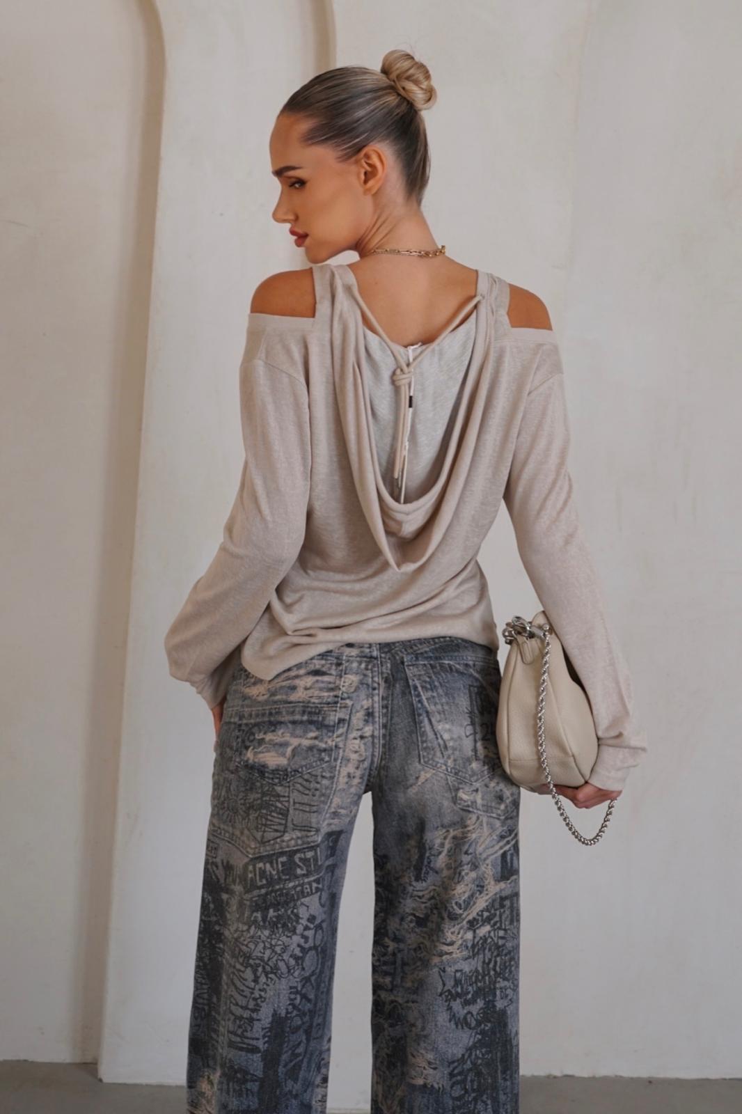 חולצה עם כתפיים חשופות מפתח וי  וכובע קפוצון, בגזרה מחמיאה ומיוחדת.