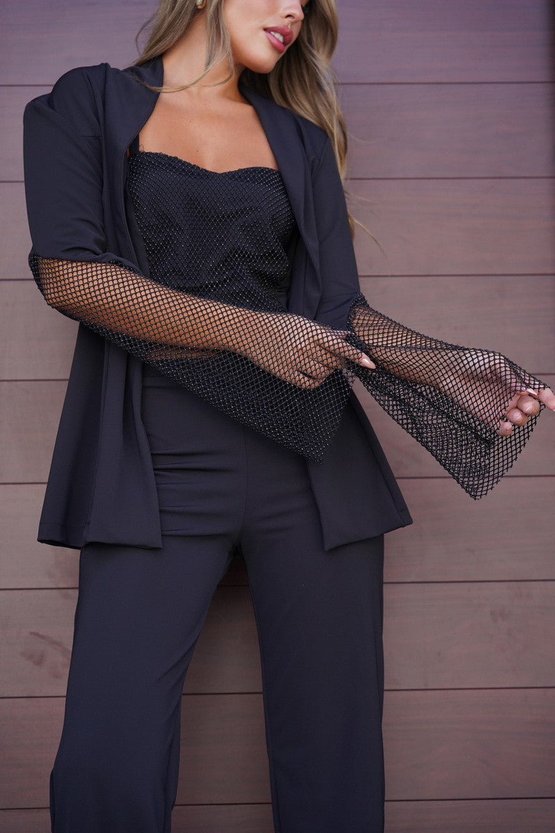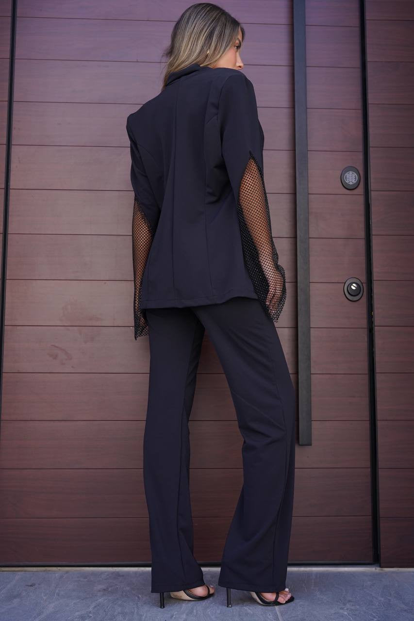 חליפת גאליס המושלמת מ- 3 חלקים: מכנס סטרצ׳י עם גומי במותן וגזרה מתרחבת, טופ בשילוב של רשת נוצצת ועליונית עם רשת בשרוולים.