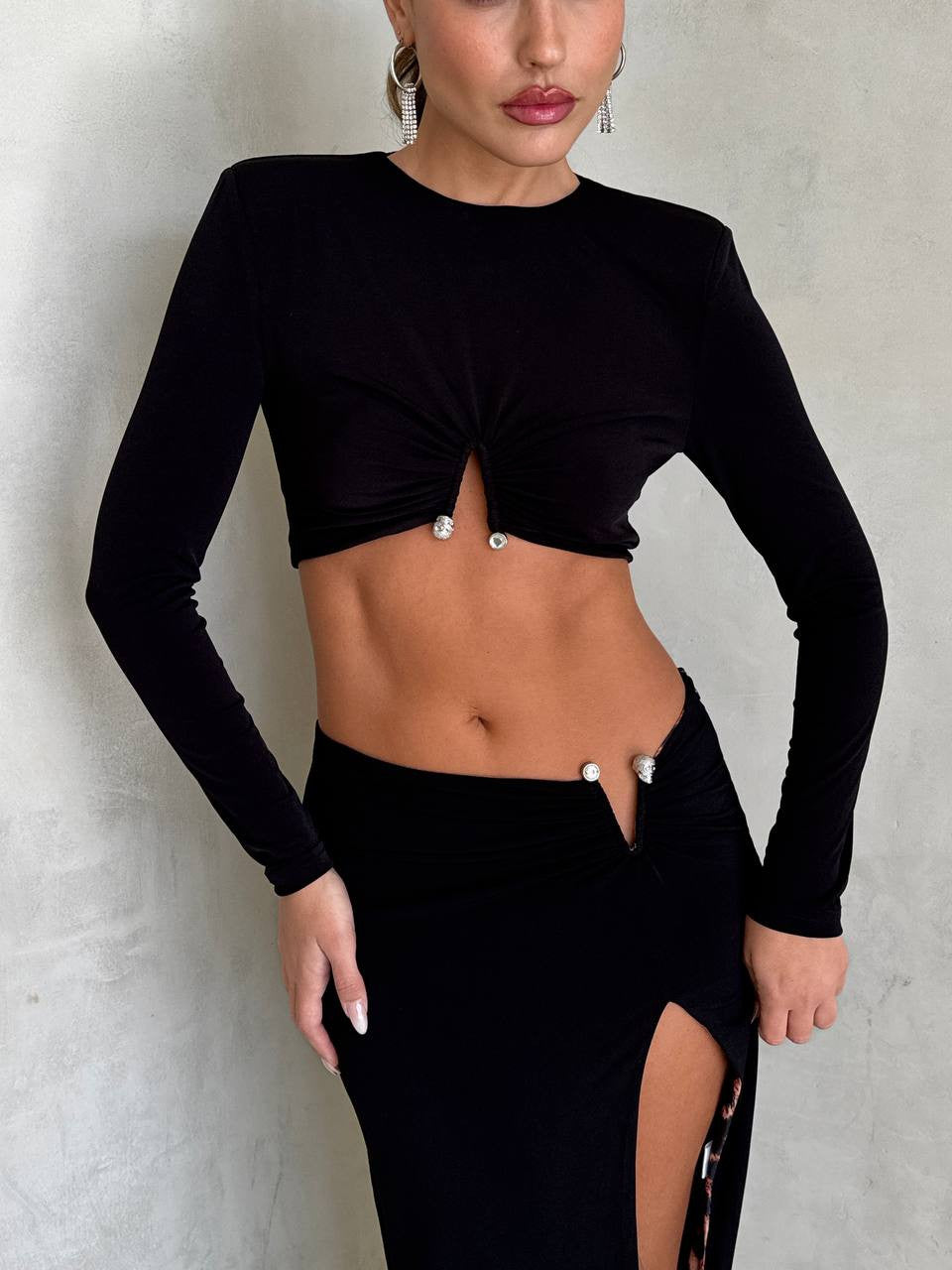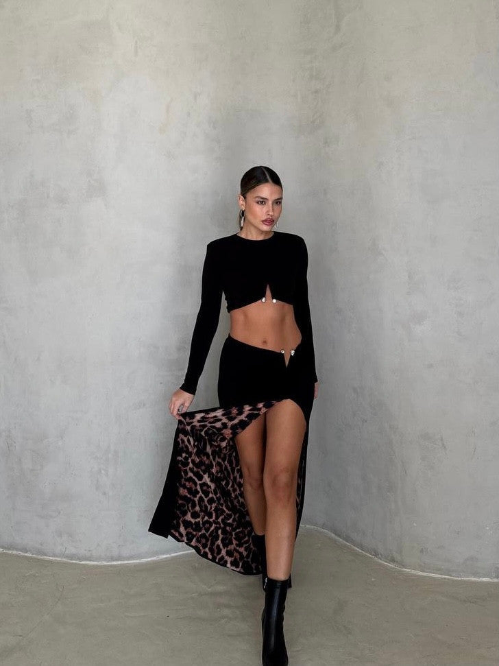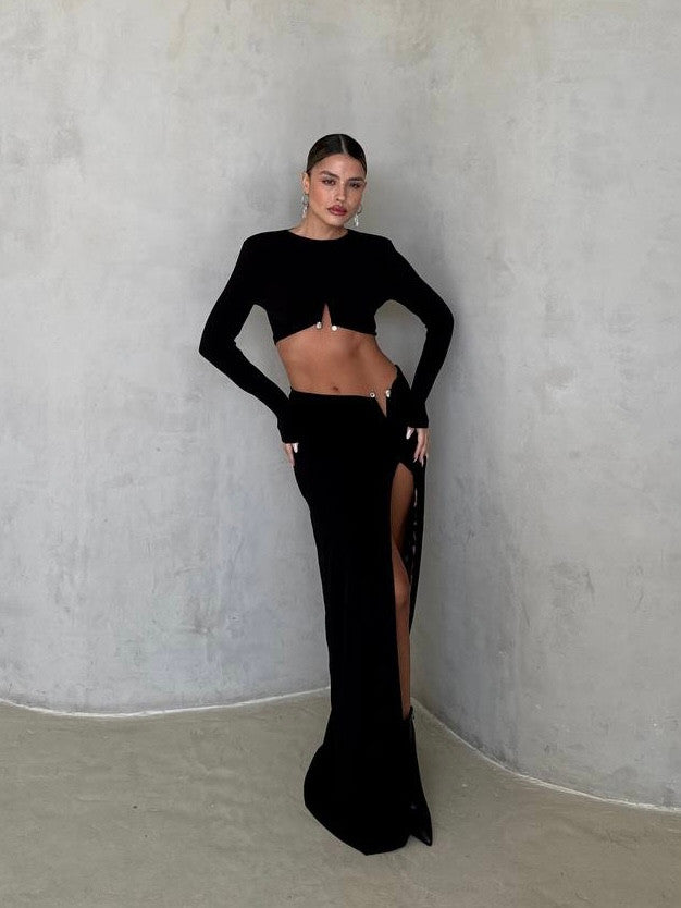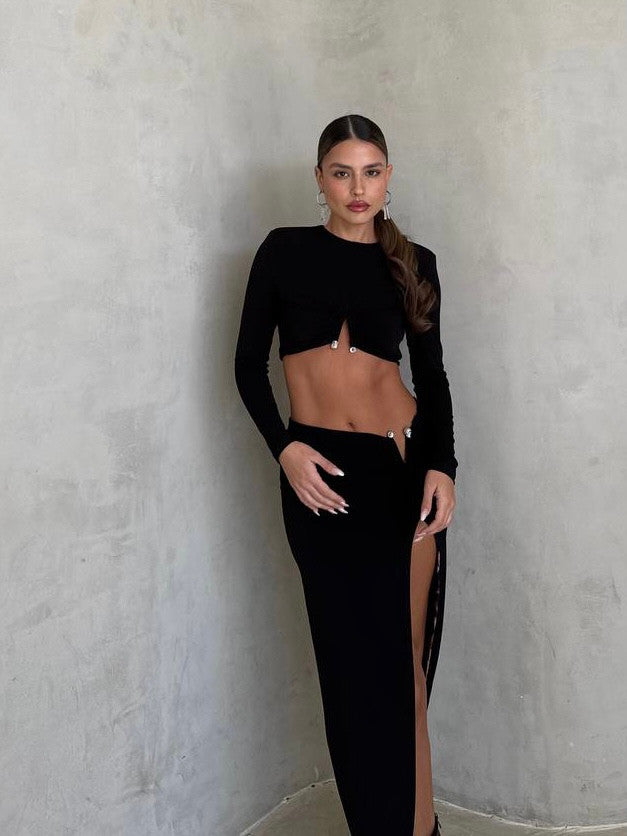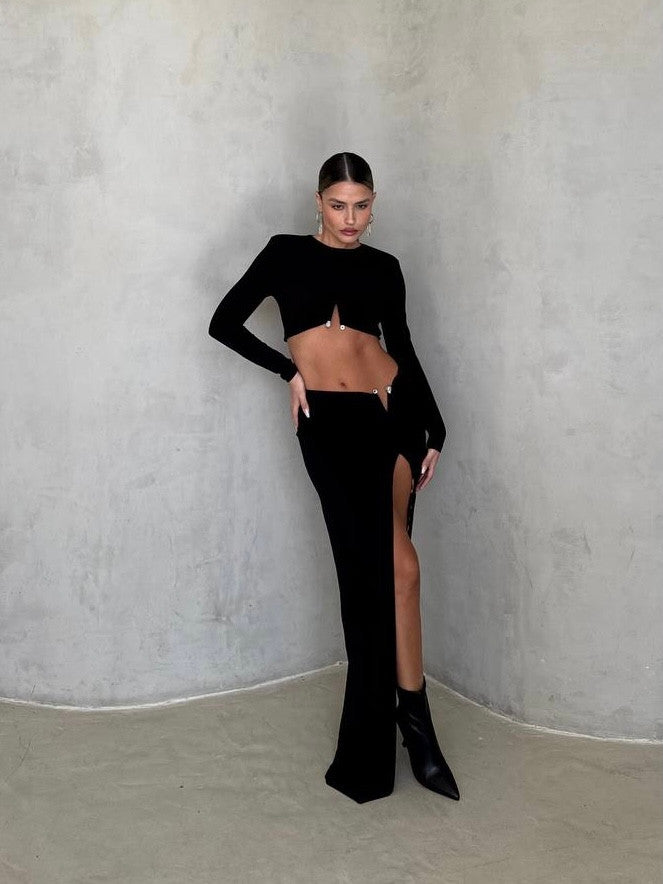 חליפה מושלמת! חולצה בגזרה קרופ עם שילוב אבזם גולגולת ,וחצאית עם אבזם ושסע עמוק .