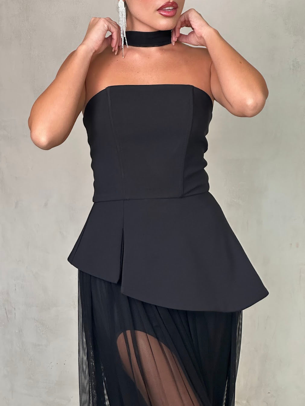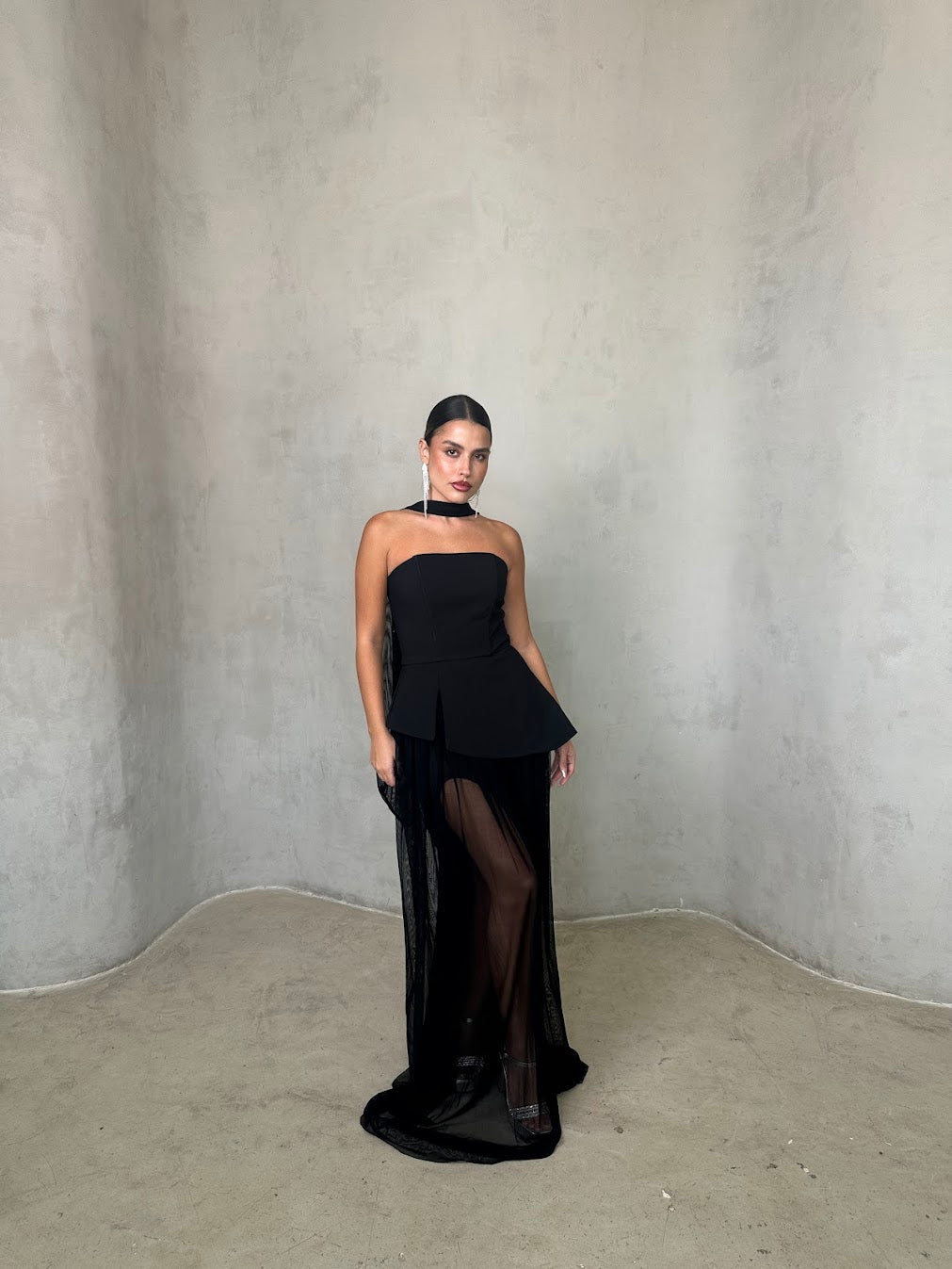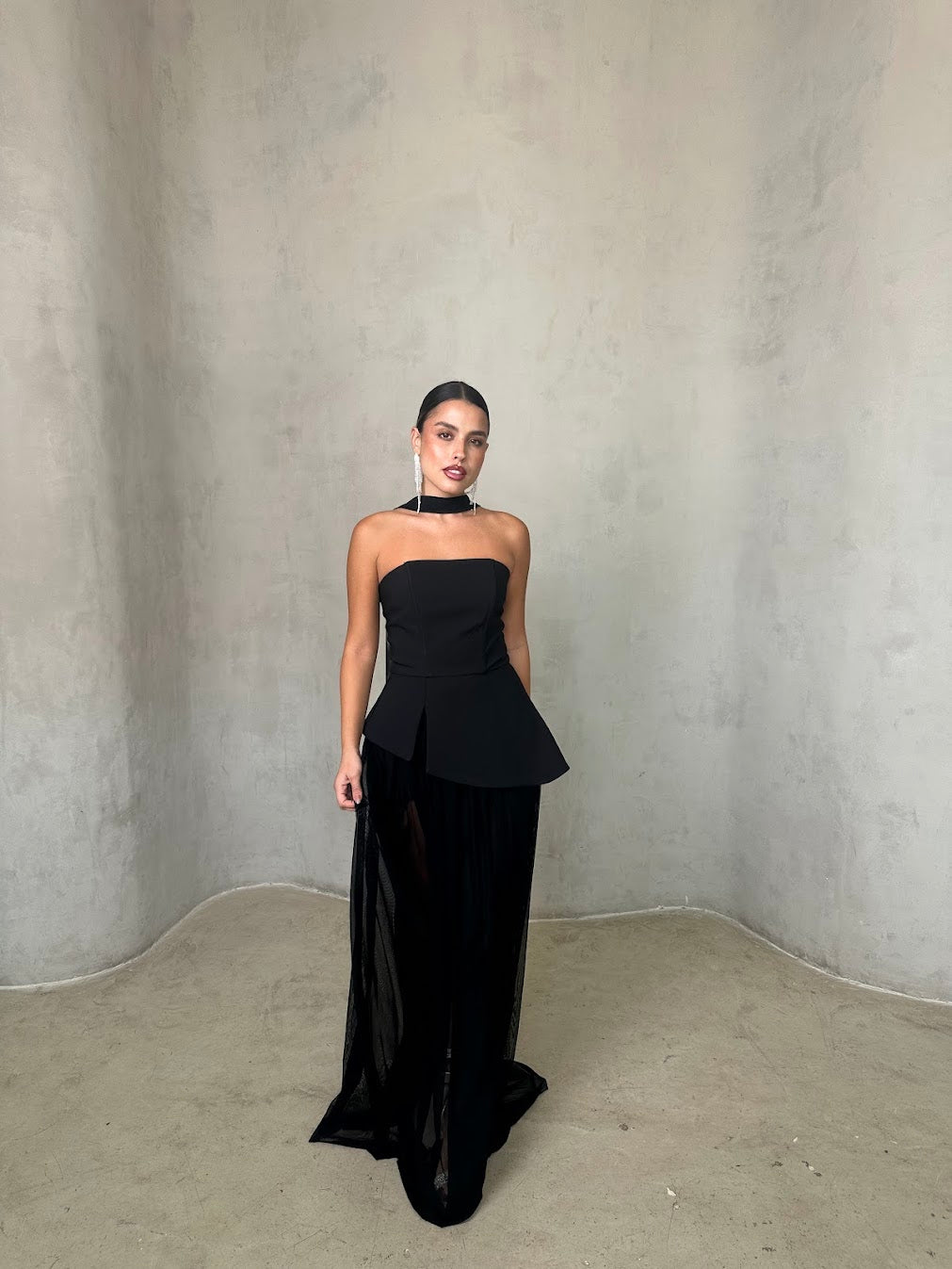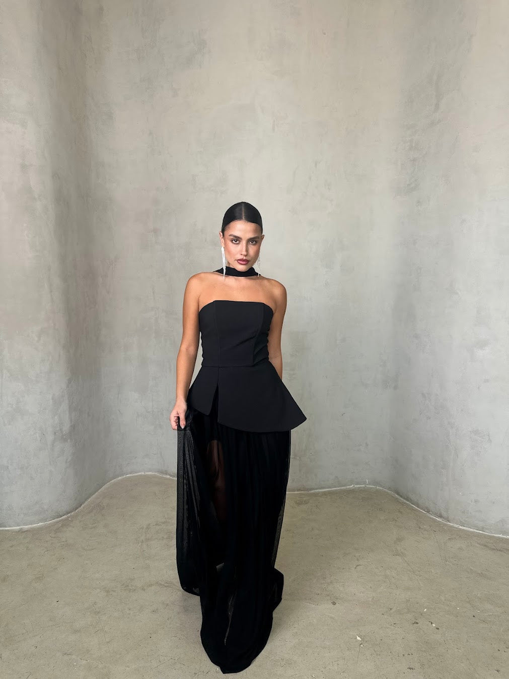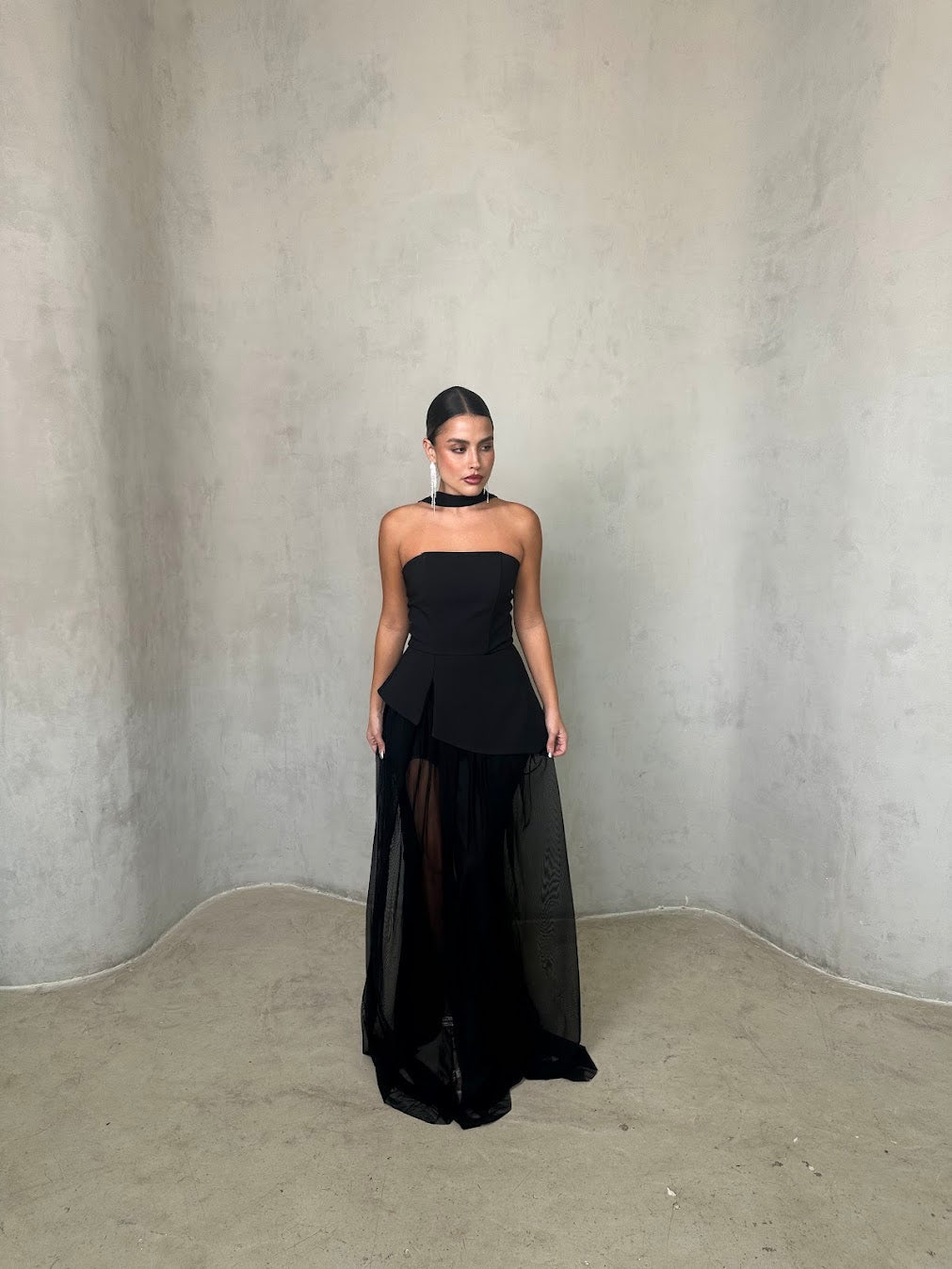 שמלה שחורה אלגנטית בשילוב חצאית שיפון שקופה בגזרה נשפכת. החלק העליון סטרפלס מחטב עם צווארון צמוד, המעניק מראה מתוחכם ועוצמתי. השילוב בין הבד האטום לשקיפות העדינה יוצר איזון מושלם בין קלאסיות לנועזות – הבחירה המושלמת לערב יוקרתי או אירוע קוקטייל.