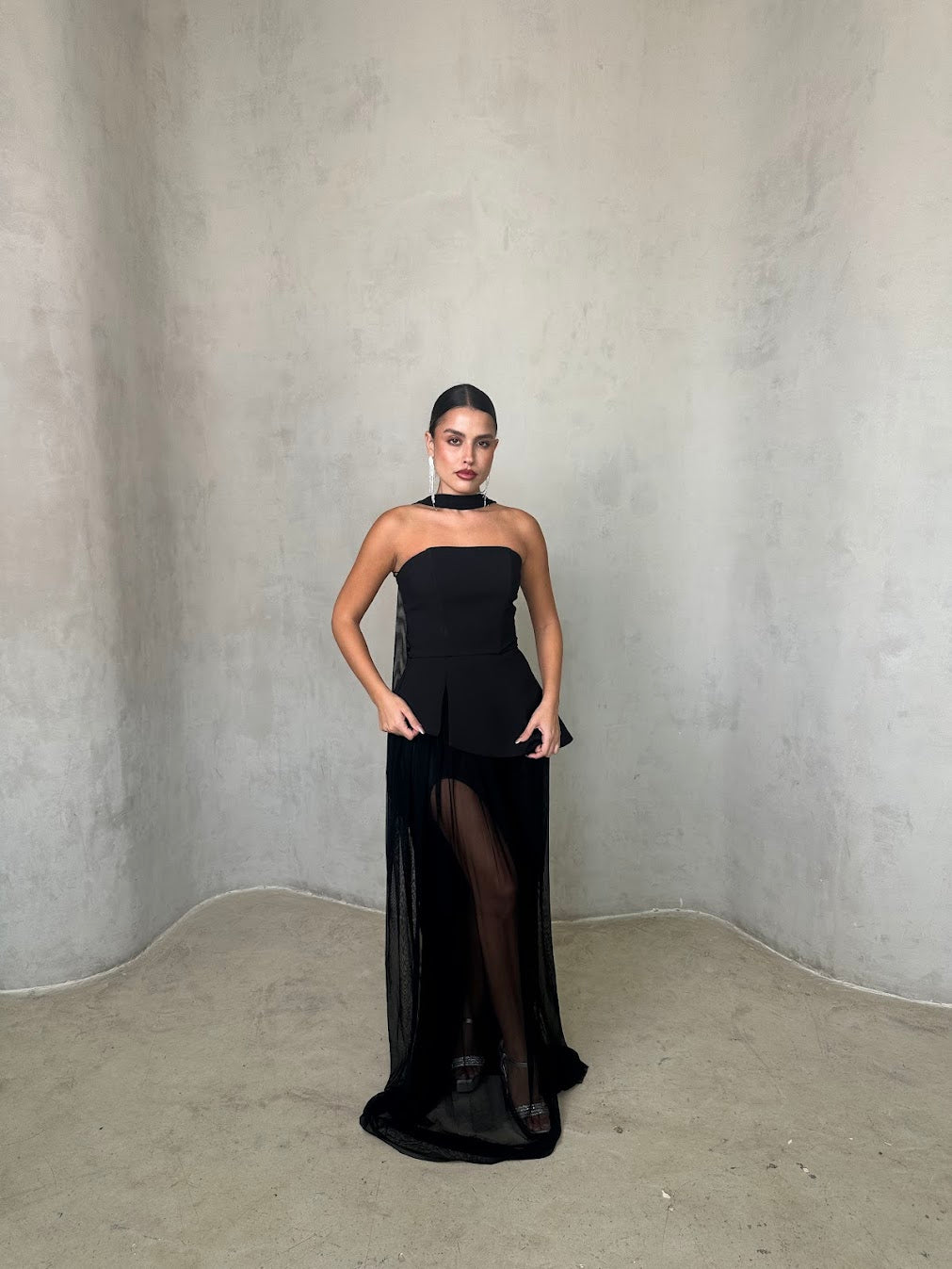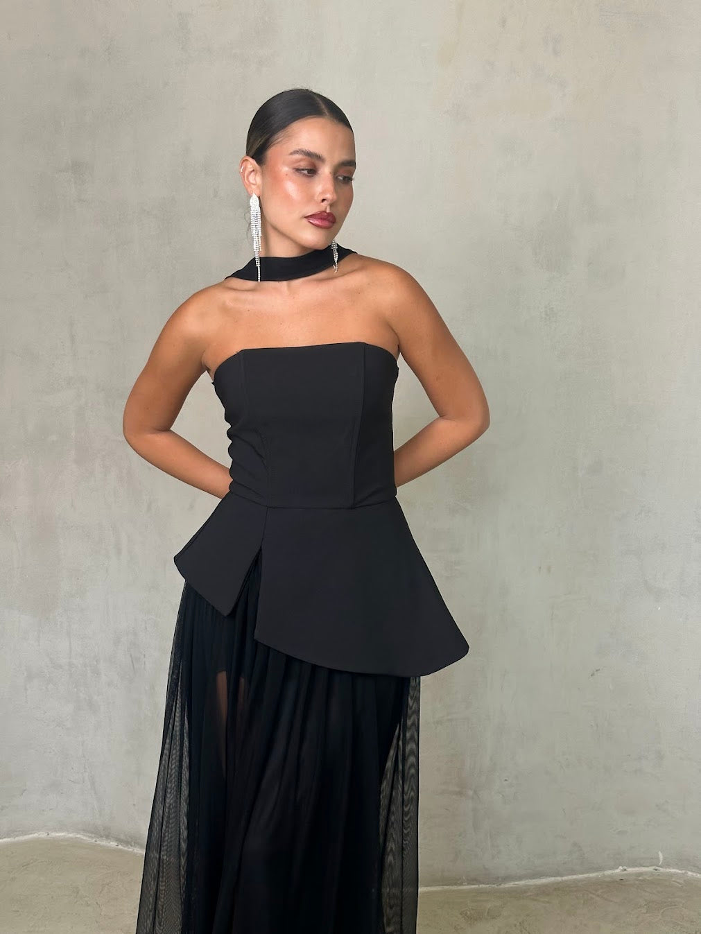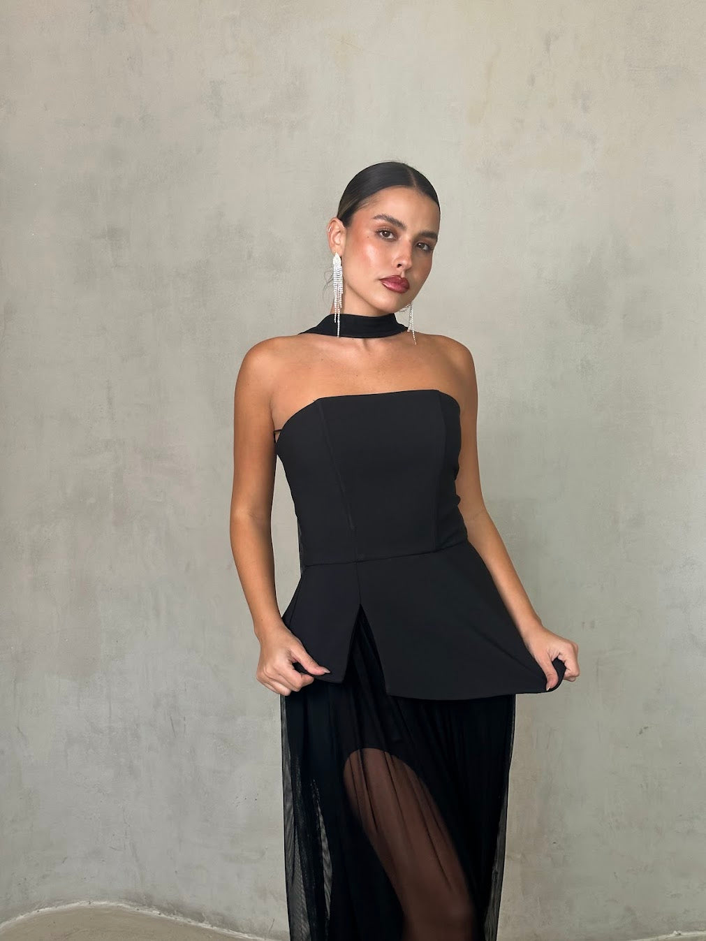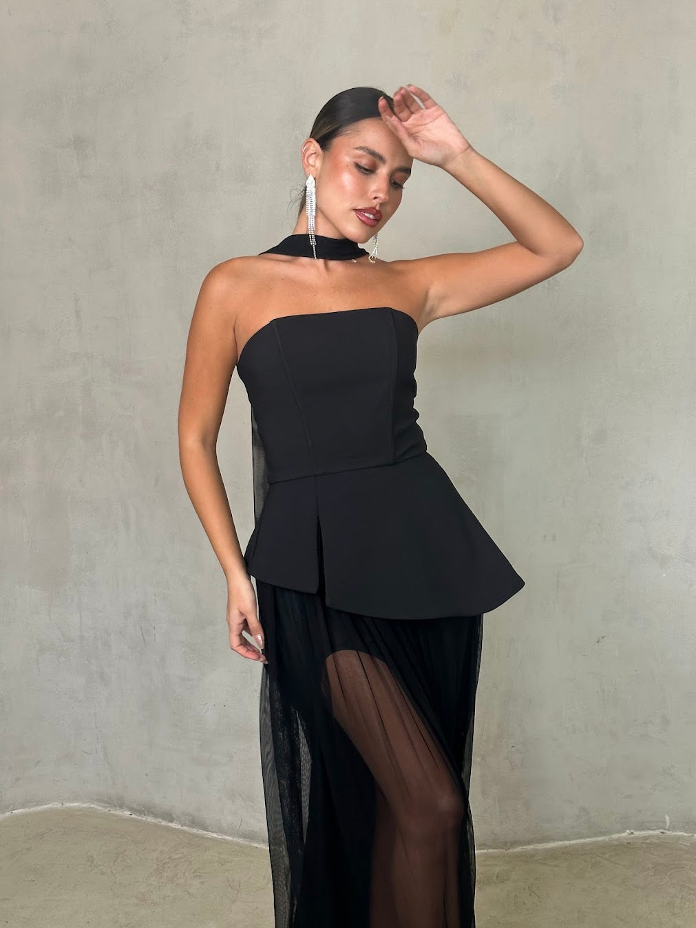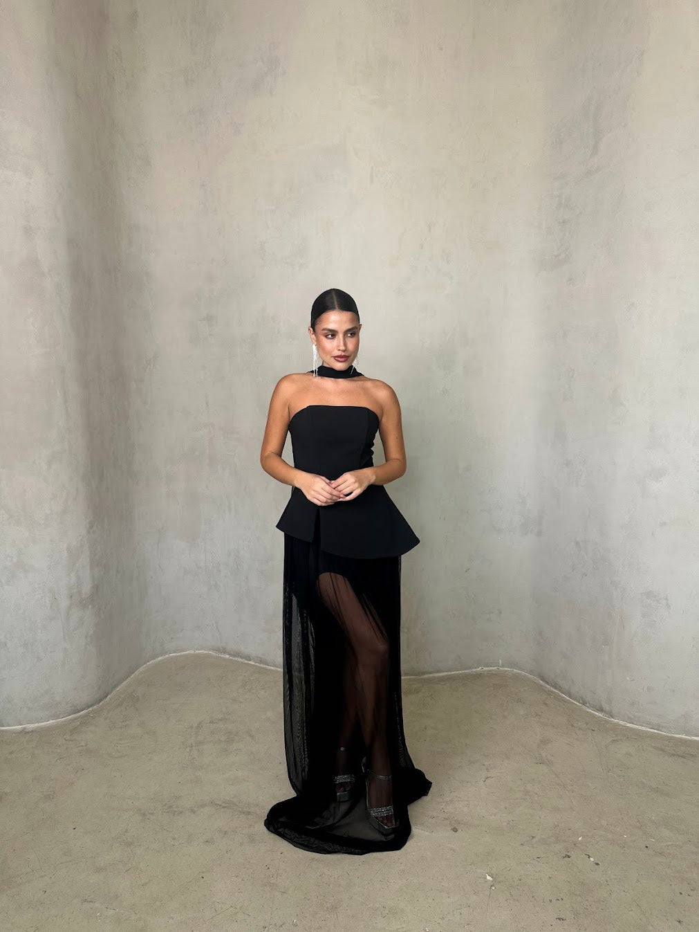 שמלה שחורה אלגנטית בשילוב חצאית שיפון שקופה בגזרה נשפכת. החלק העליון סטרפלס מחטב עם צווארון צמוד, המעניק מראה מתוחכם ועוצמתי. השילוב בין הבד האטום לשקיפות העדינה יוצר איזון מושלם בין קלאסיות לנועזות – הבחירה המושלמת לערב יוקרתי או אירוע קוקטייל.