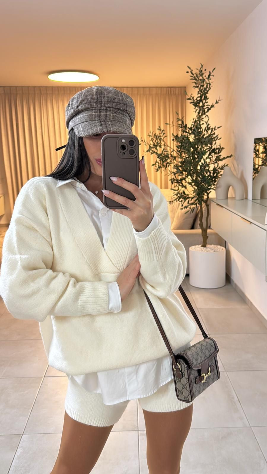סט סריג אופנתי ונוח בגזרה רפויה ומחמיאה, הכולל סוודר וי ומכנס קצר תואם. הסוודר מעוצב במפתח V מבד סריג רך ונעים למגע, ומשתלב בצורה מושלמת מעל חולצה מכופתרת ללוק שכבות טרנדי. המכנס בגזרה ישרה עם גומי נוח במותן, יוצר מראה קליל אך מוקפד.