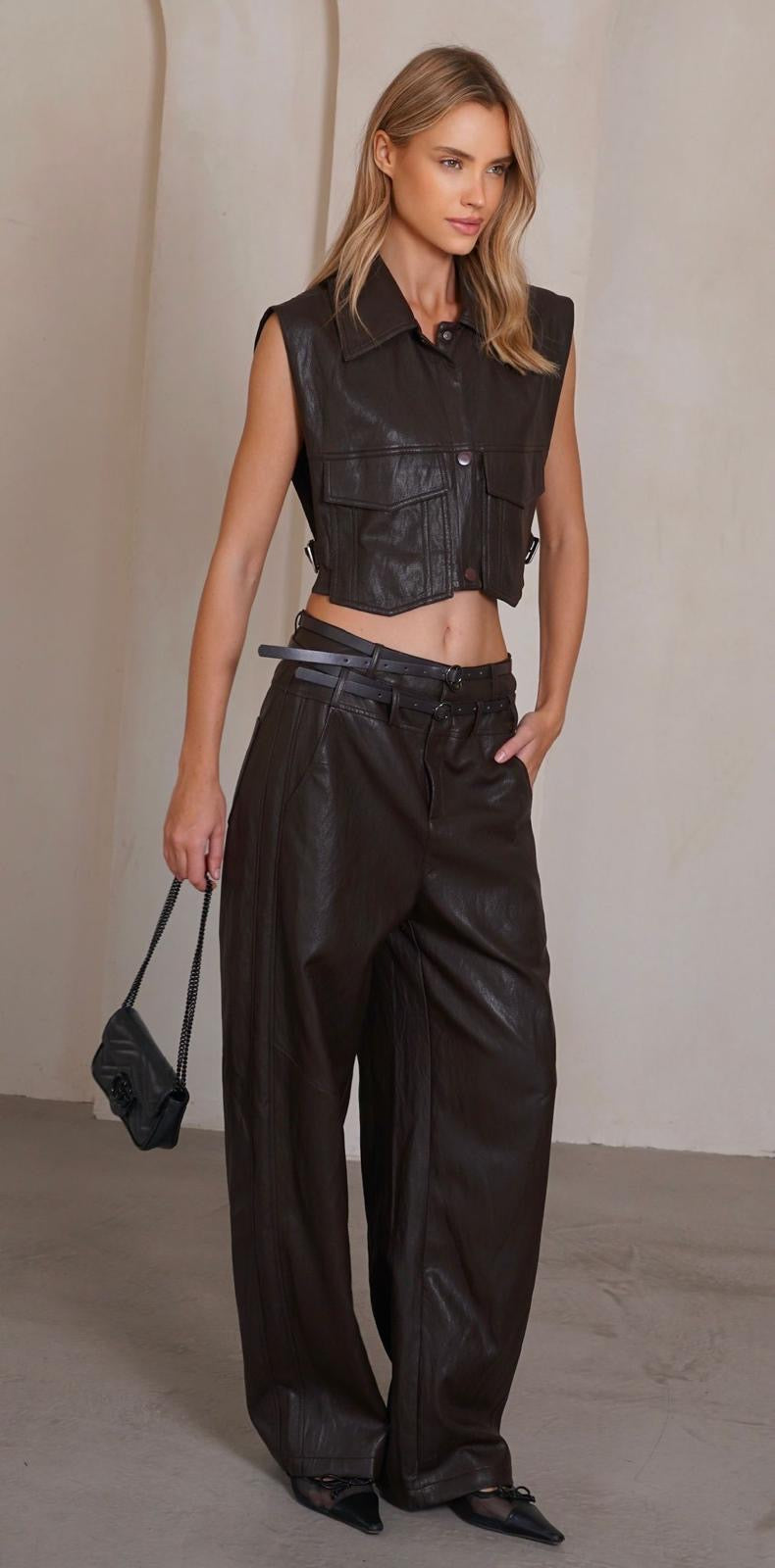 חליפת דמוי עור אלגנטית, ווסט בסגירת כפתורים משולב מכנסיים בגזרה מתרחבת עם חגורה.