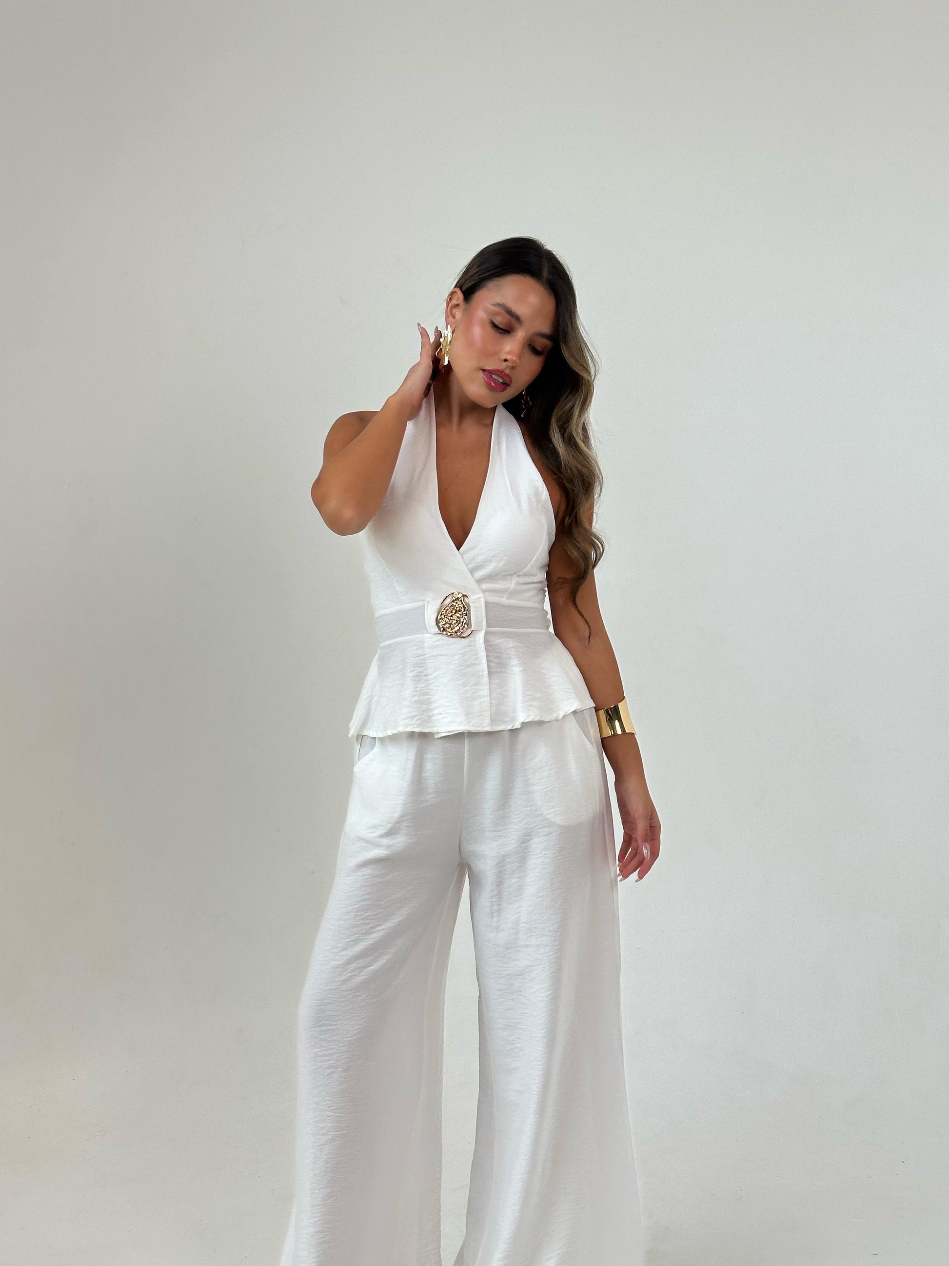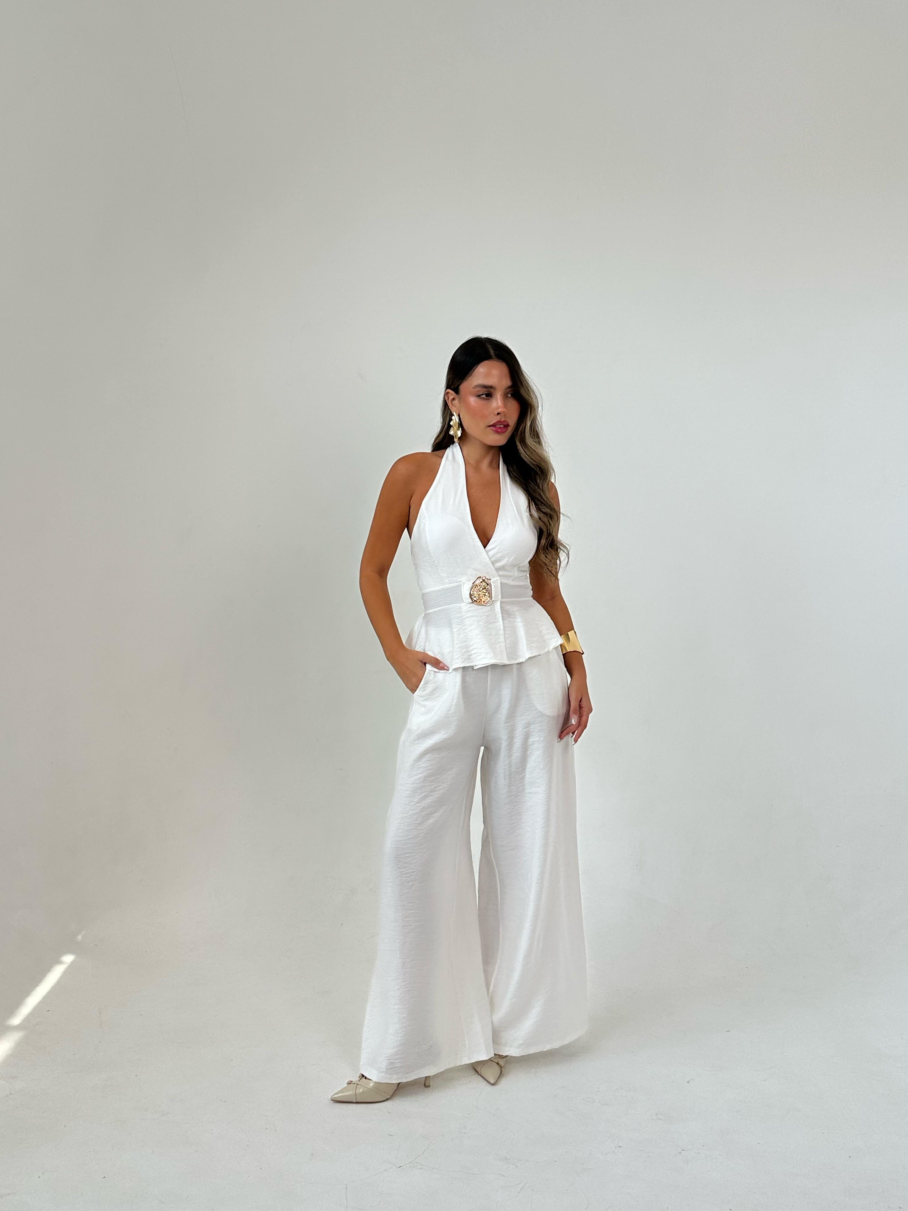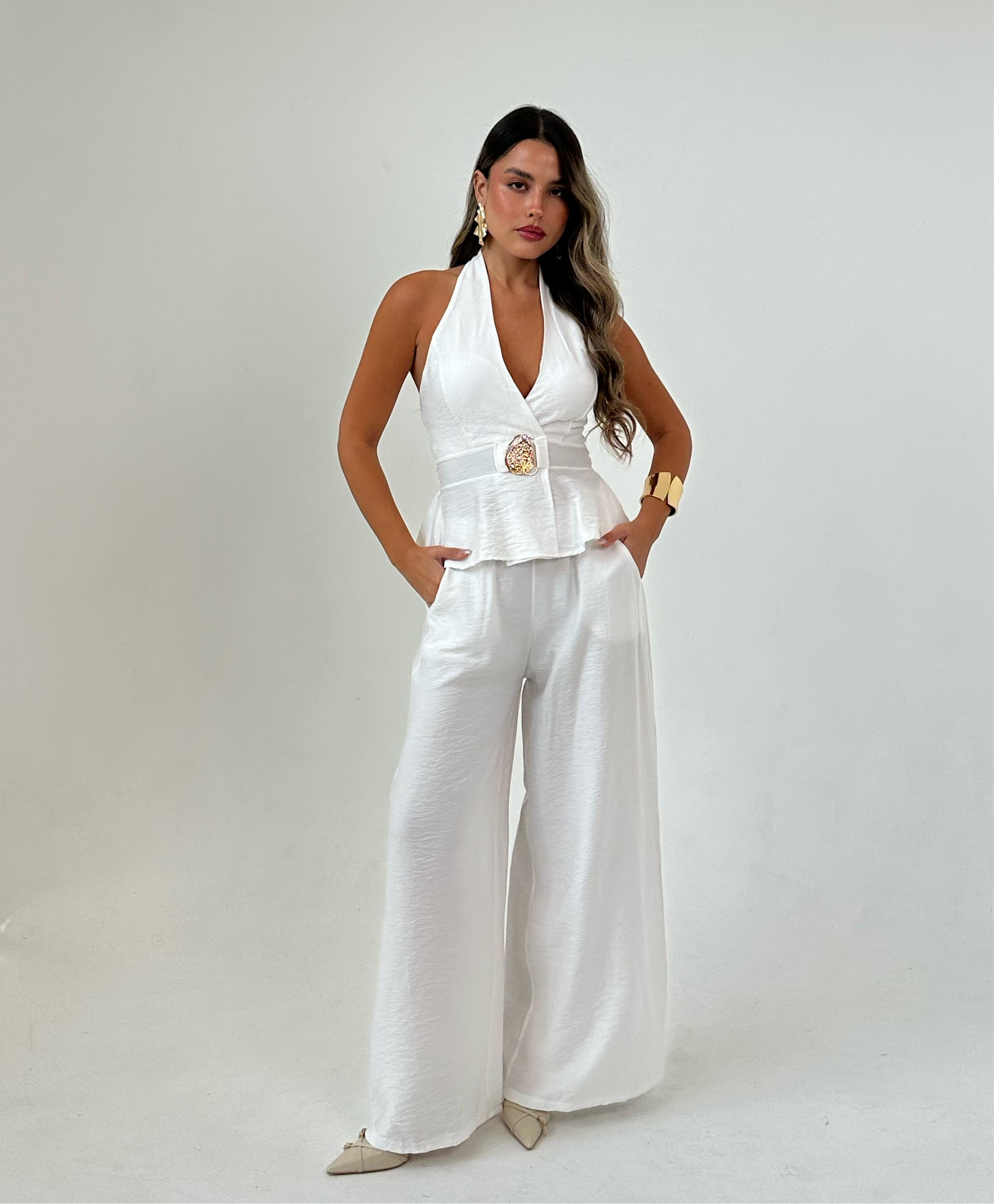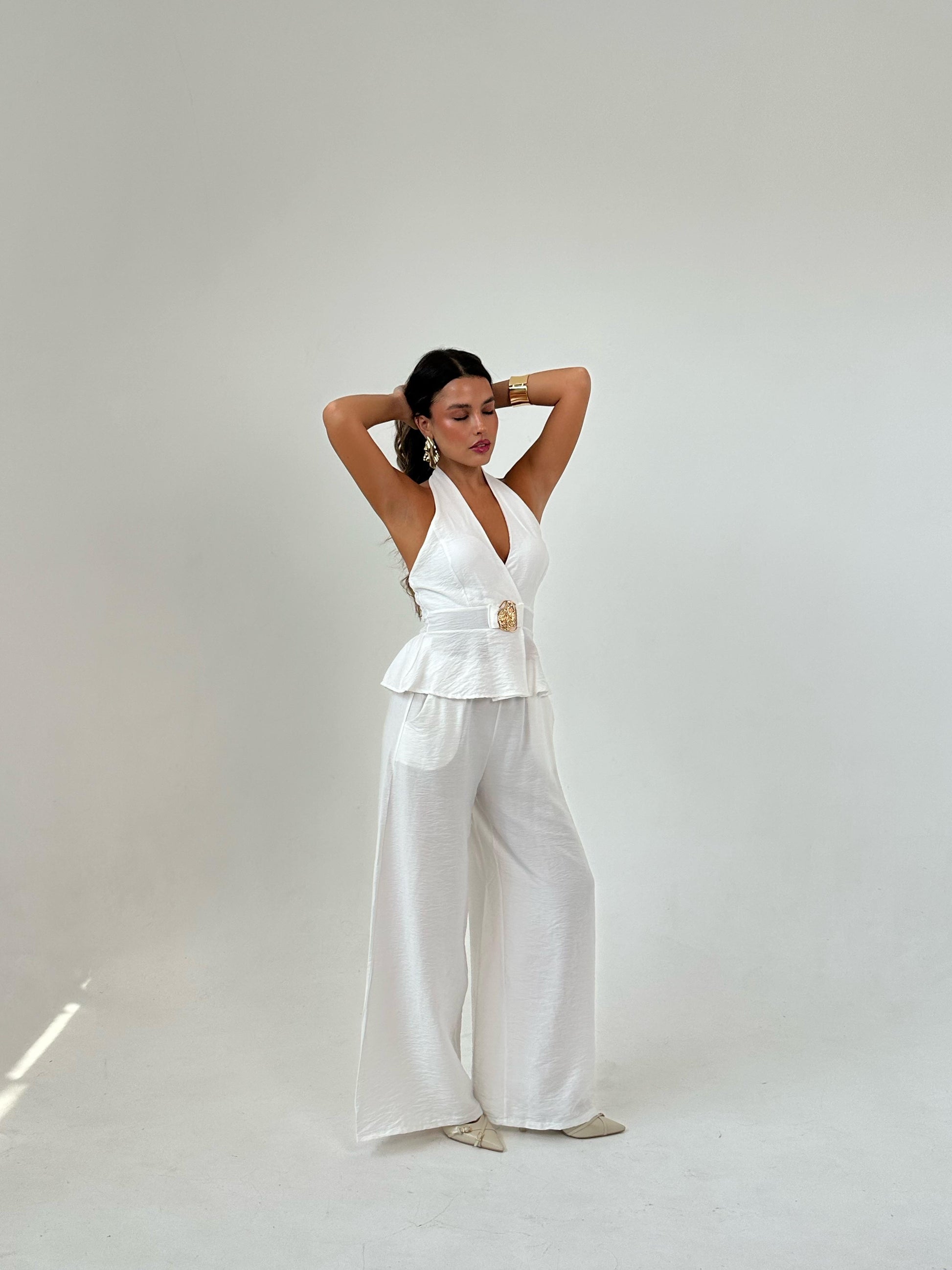 טופ הלטר עם מחשוף וי עמוק וחגורה מחמיאה עם אבזם זהב במרכז, יחד עם מכנסי פאלאצו רחבים ונשפכים שמוסיפים תנועה קלילה ומראה יוקרתי.
