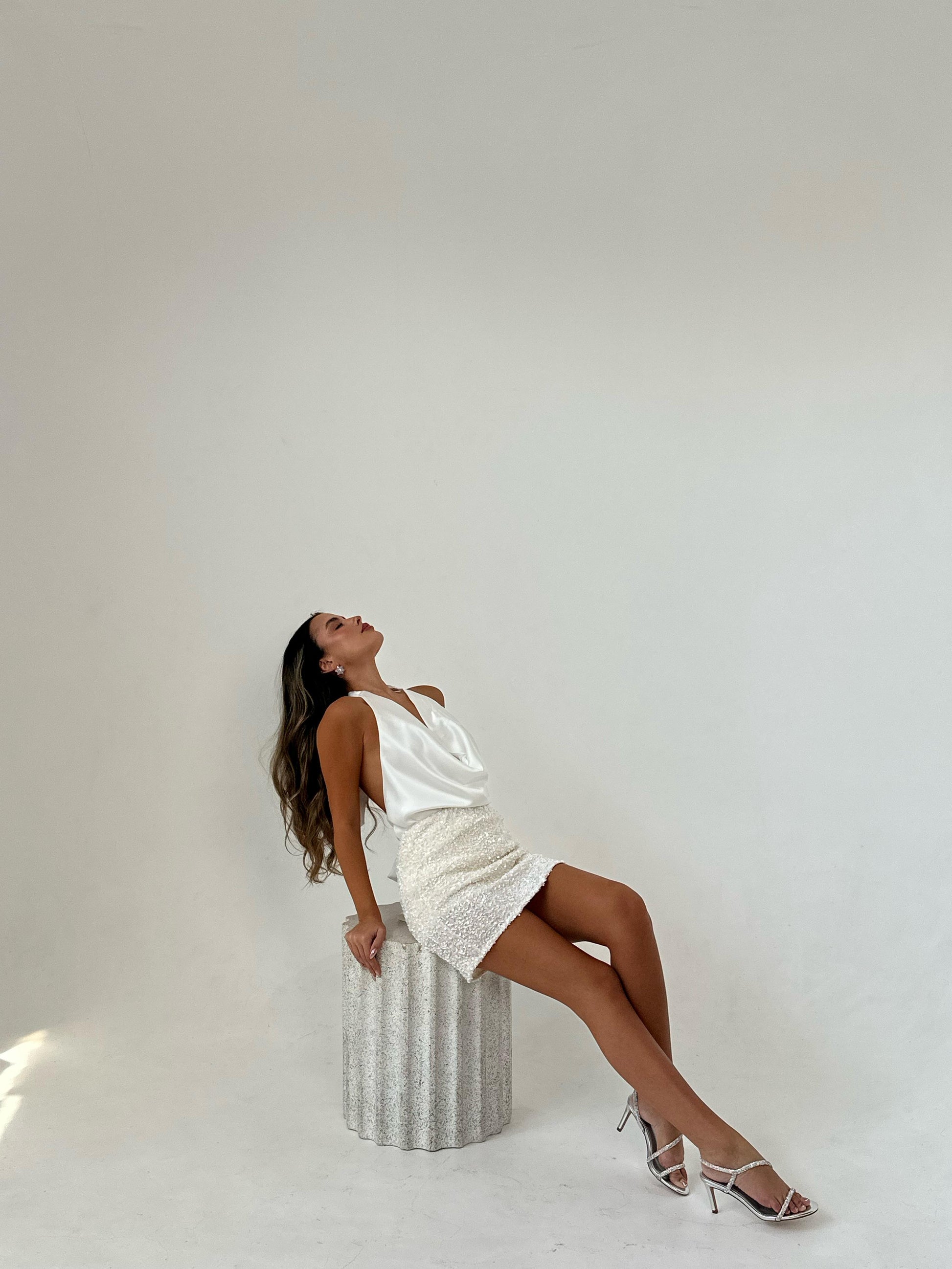 חצאית מיני בגזרה גבוהה וצמודה, עשויה בד טקסטורלי בעל מראה תלת־ממדי שמעניק לה נוכחות ייחודית.