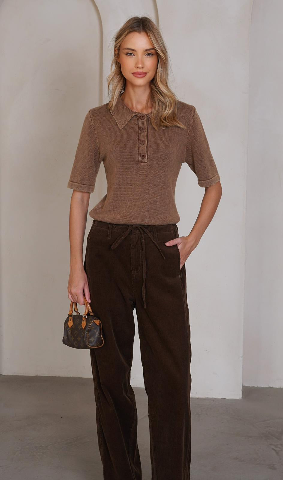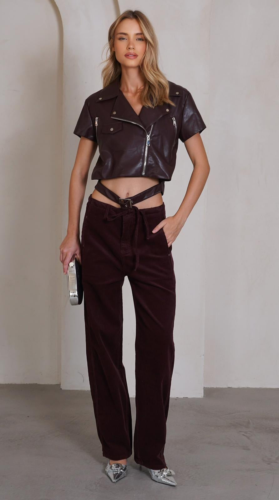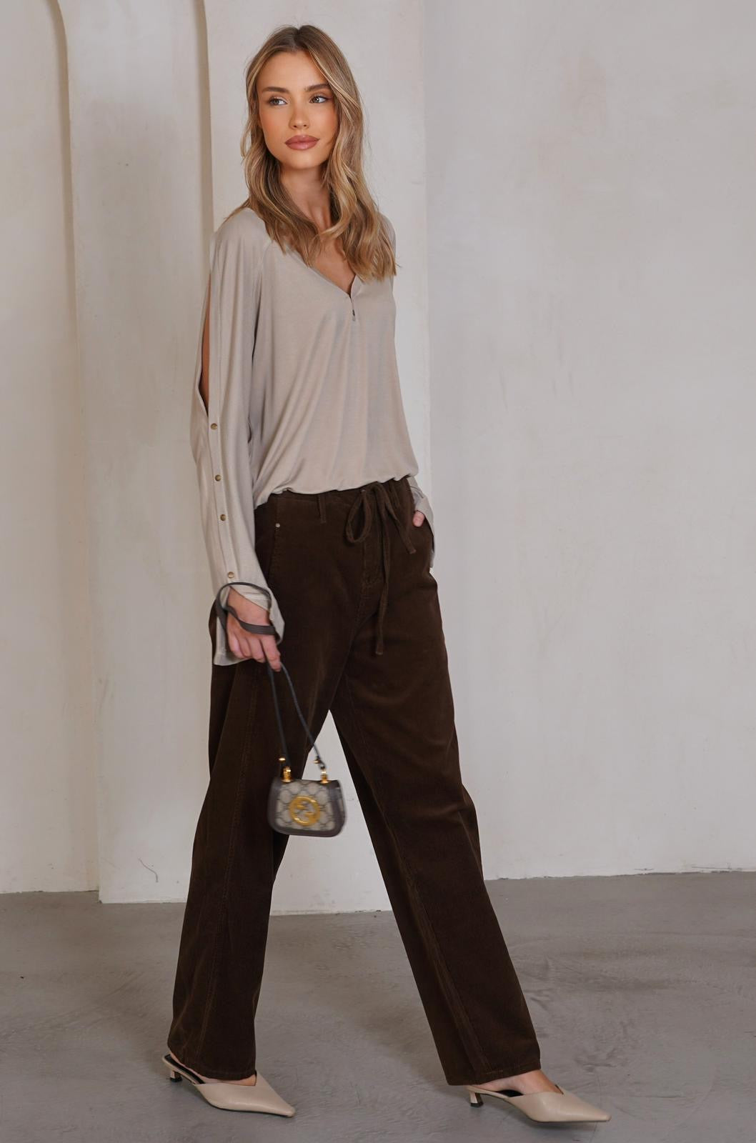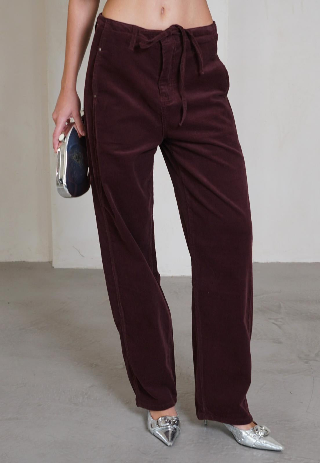 מכנסי קודרוי בגזרה ישרה ורחבה,הדגם כולל קשירת שרוך במותן, סגירה עם כפתור ורוכסן, ושילוב לולאות לחגורה. גימור חלק ונעים למגע, מתאים ללוק יום־יומי מוקפד או לשילוב ערב אלגנטי.