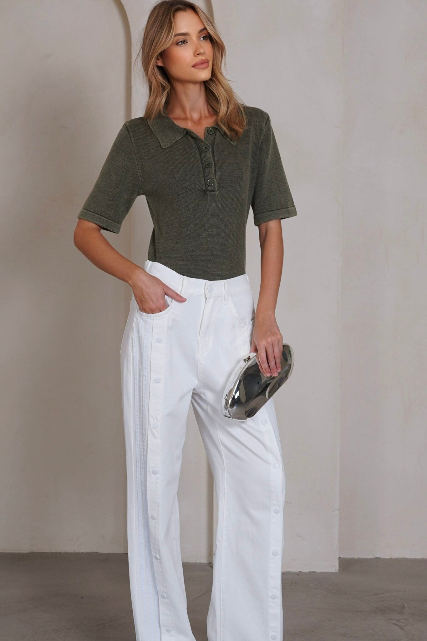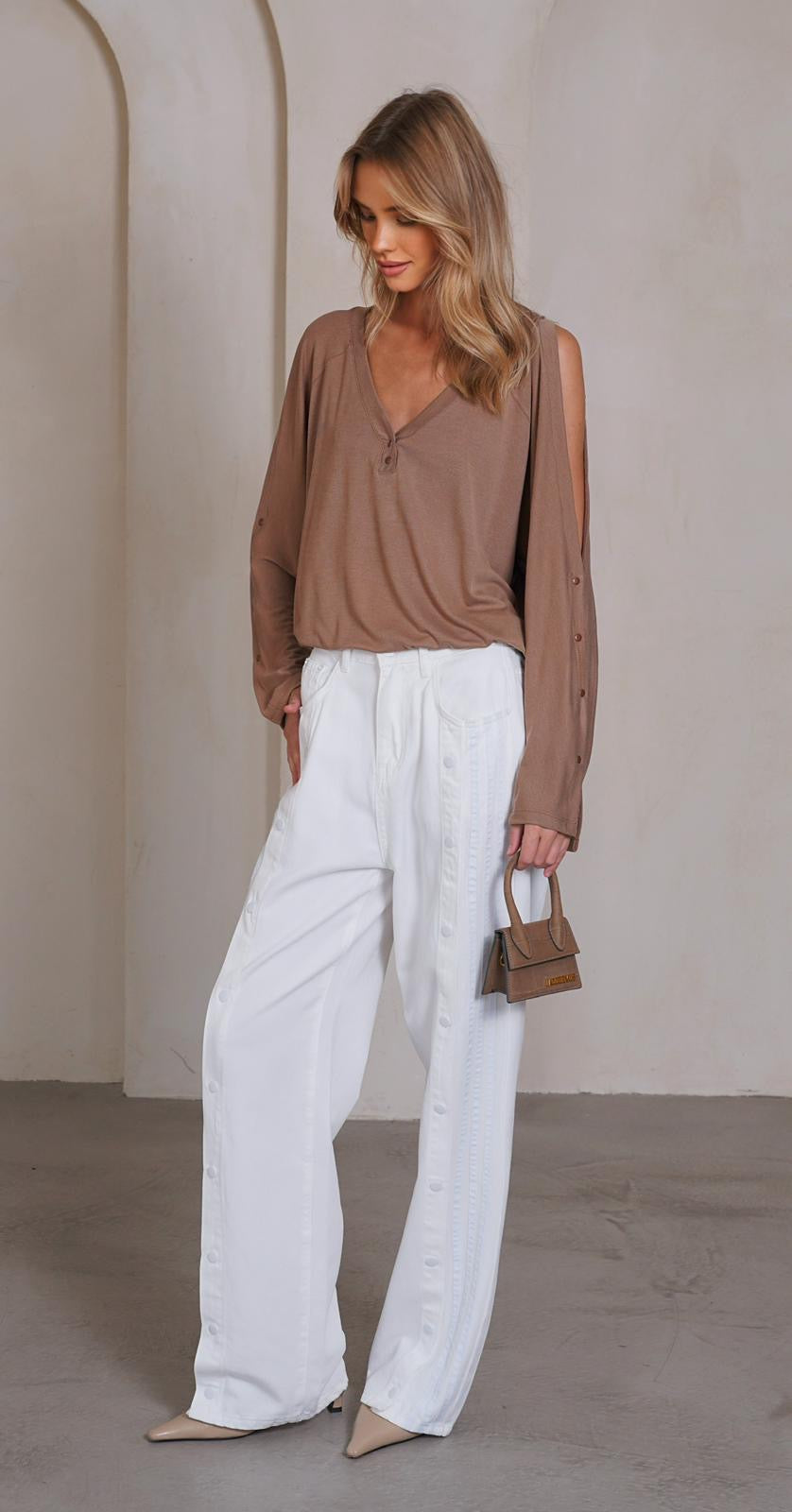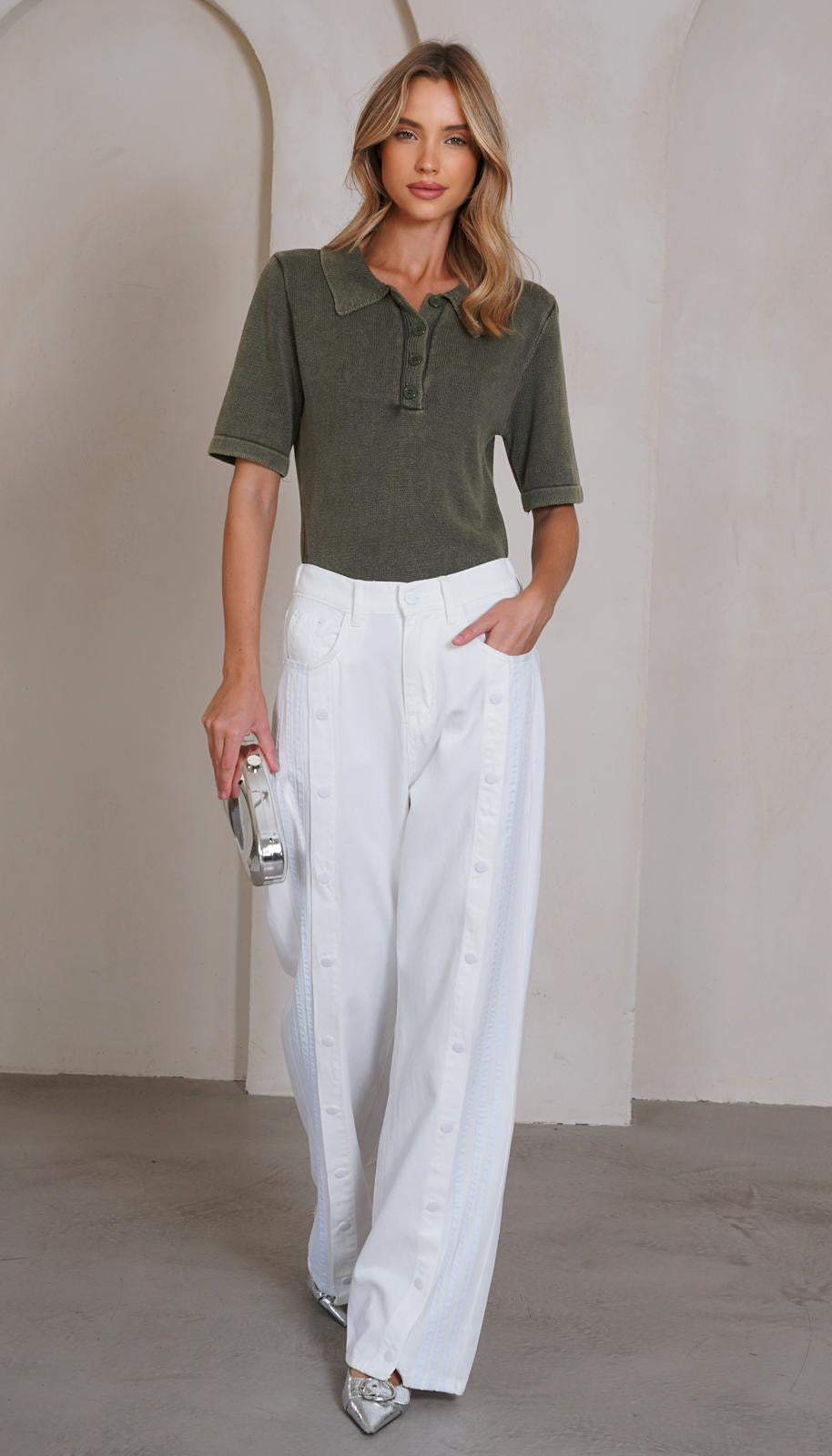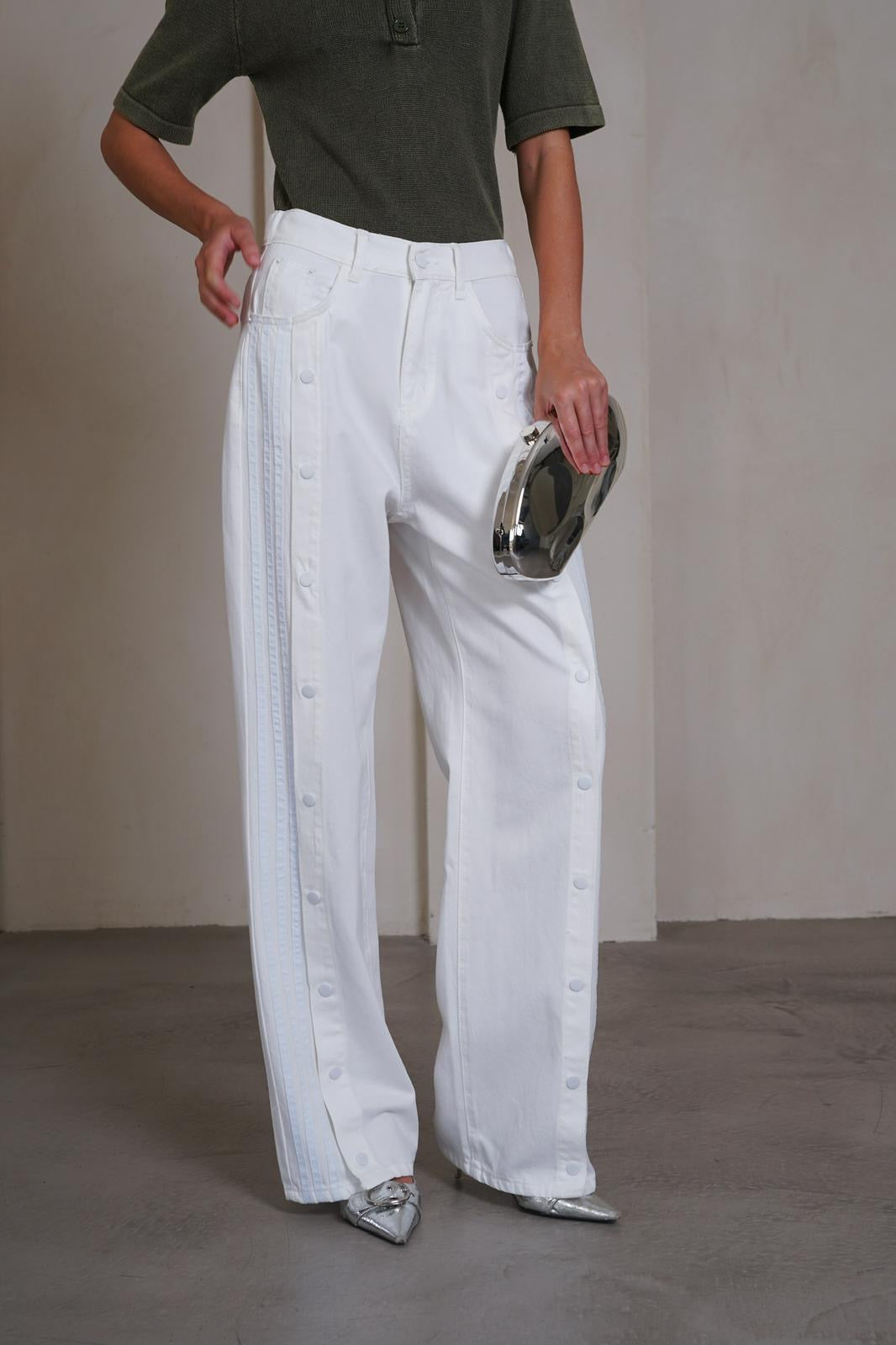 מכנס מבד נעים בשילוב תיקתקים עם רכיסת כפתור וכיסים, סיומת רחבה.