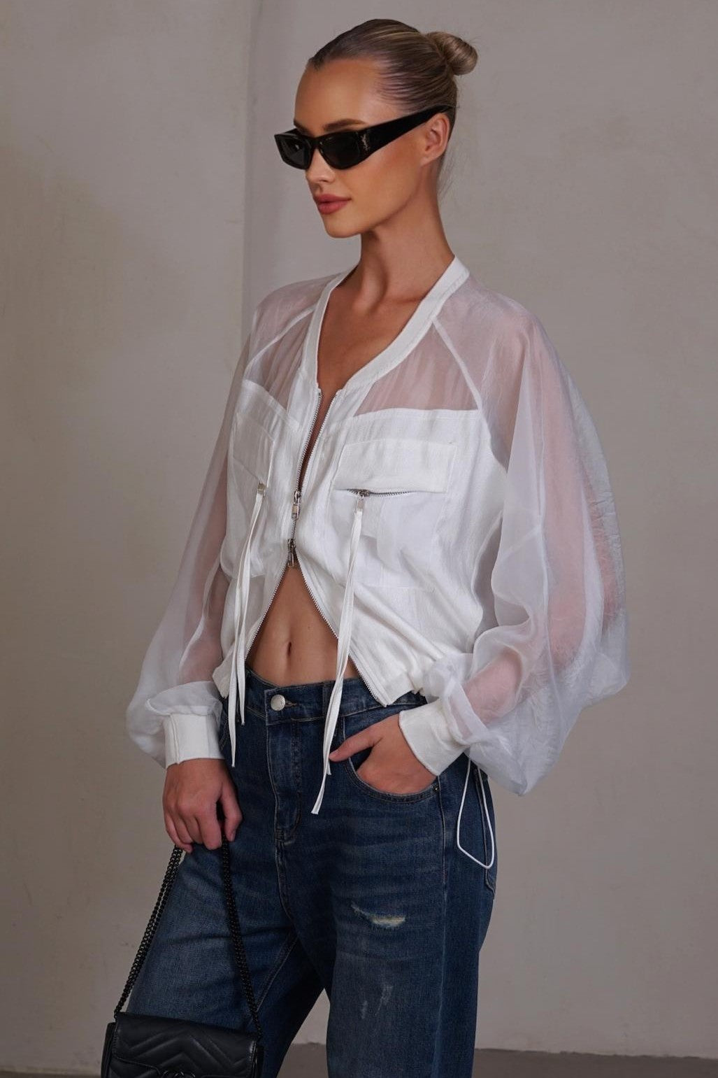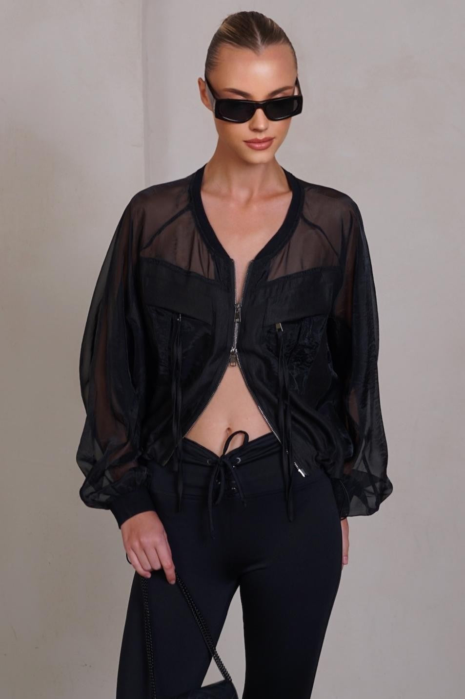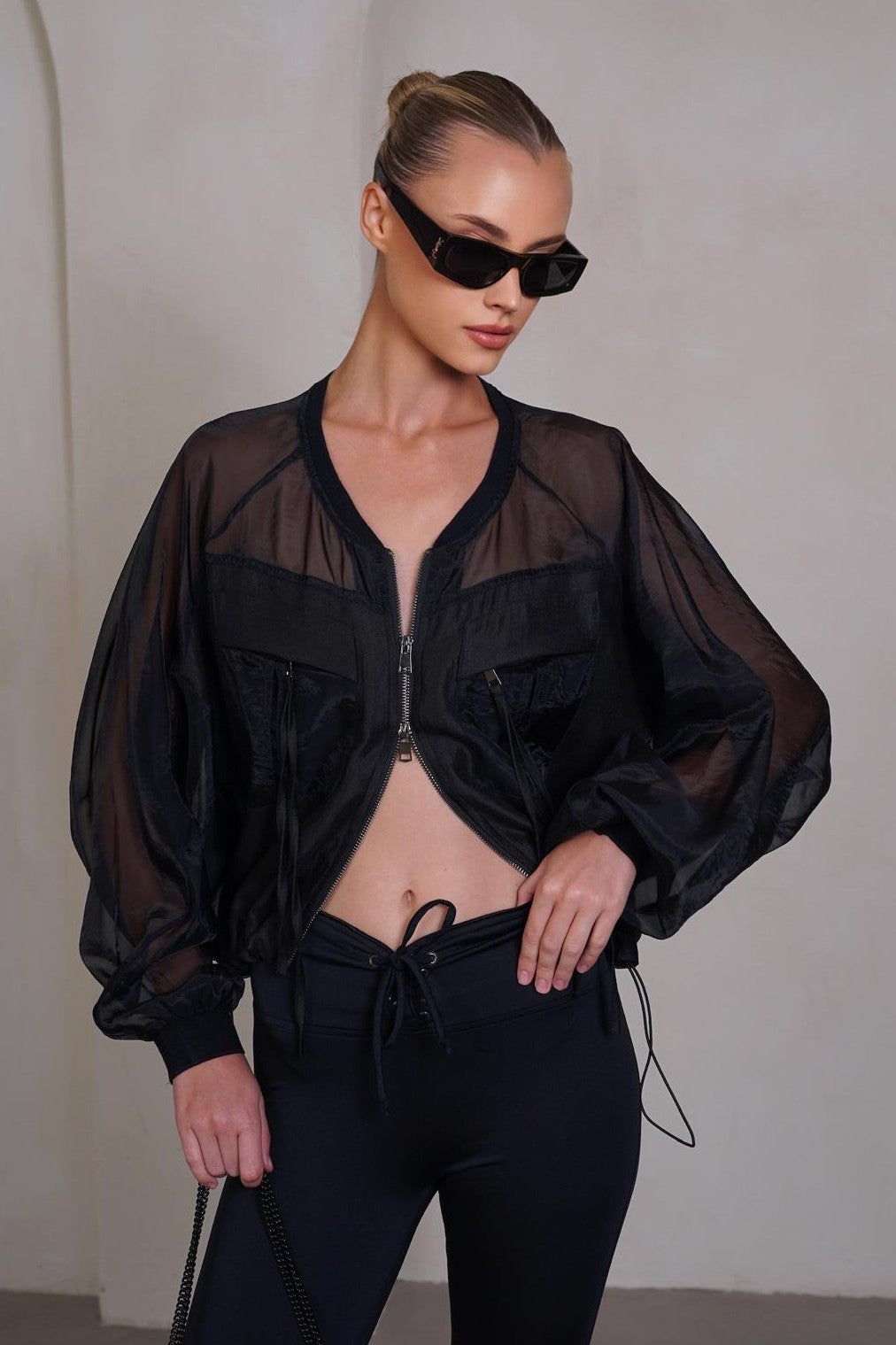 עליונית עם כיסים וסגירת רוכסן מקדימה, משולבת בד שקוף בשרוולים.
