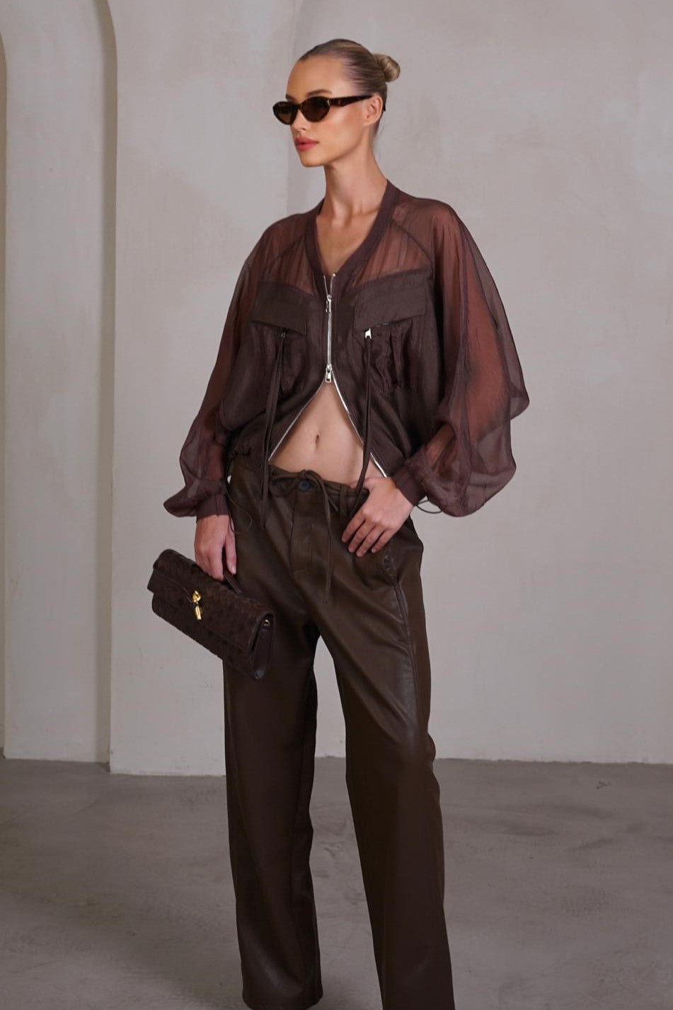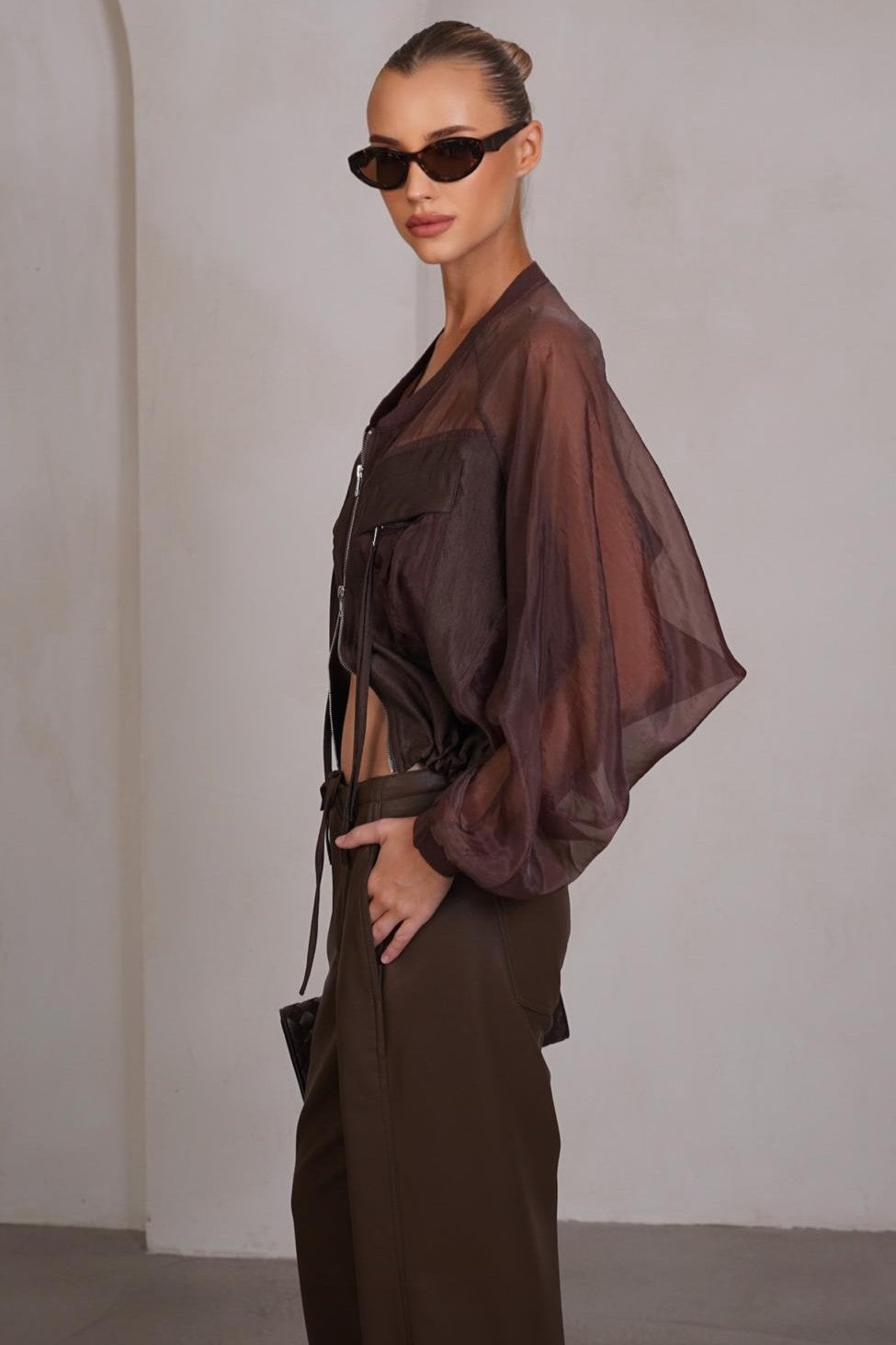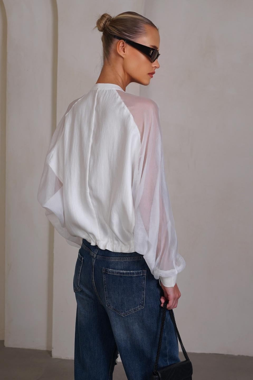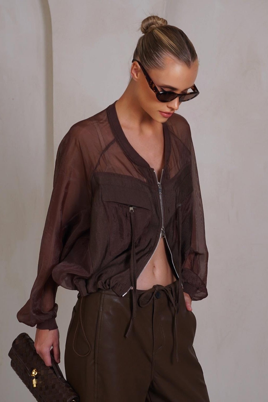 עליונית עם כיסים וסגירת רוכסן מקדימה, משולבת בד שקוף בשרוולים.