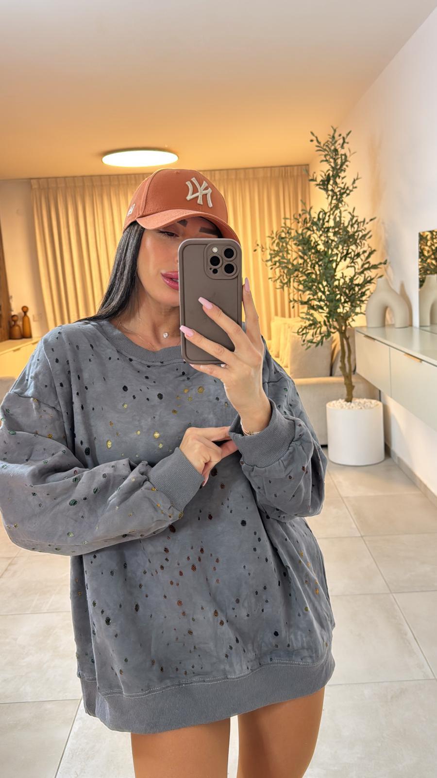 סווטשירט אוברסייז בגוון אפור עם נקודות צבע עדינות שמוסיפות עניין וסטייל.