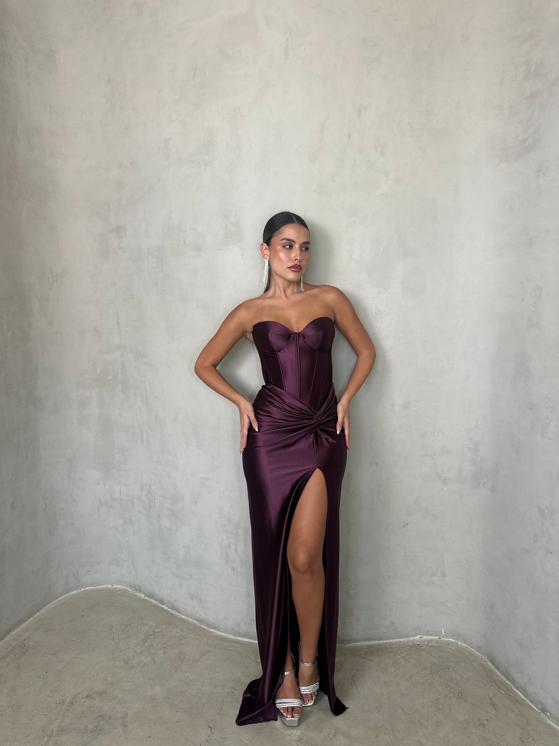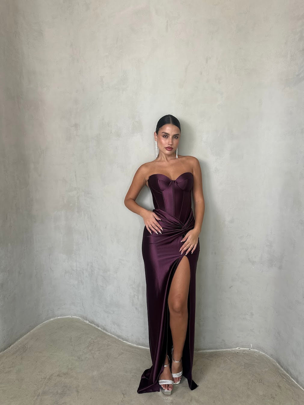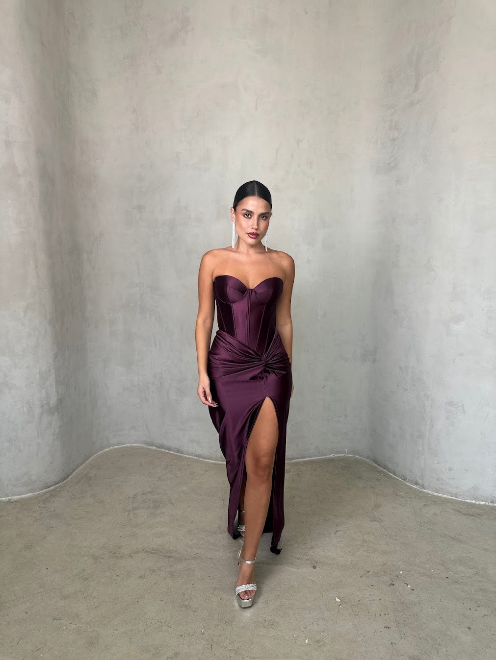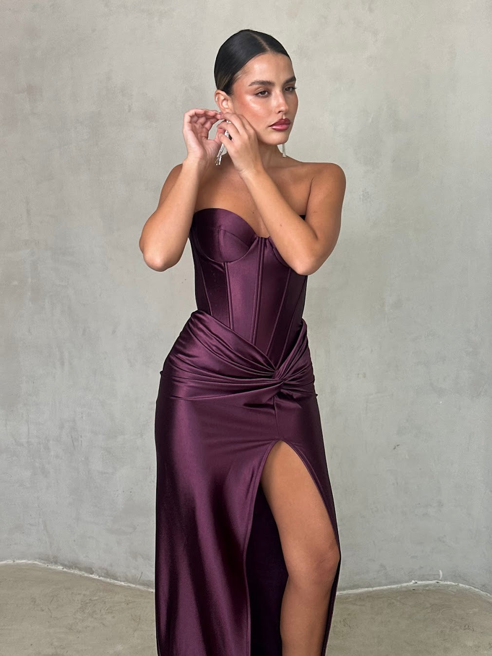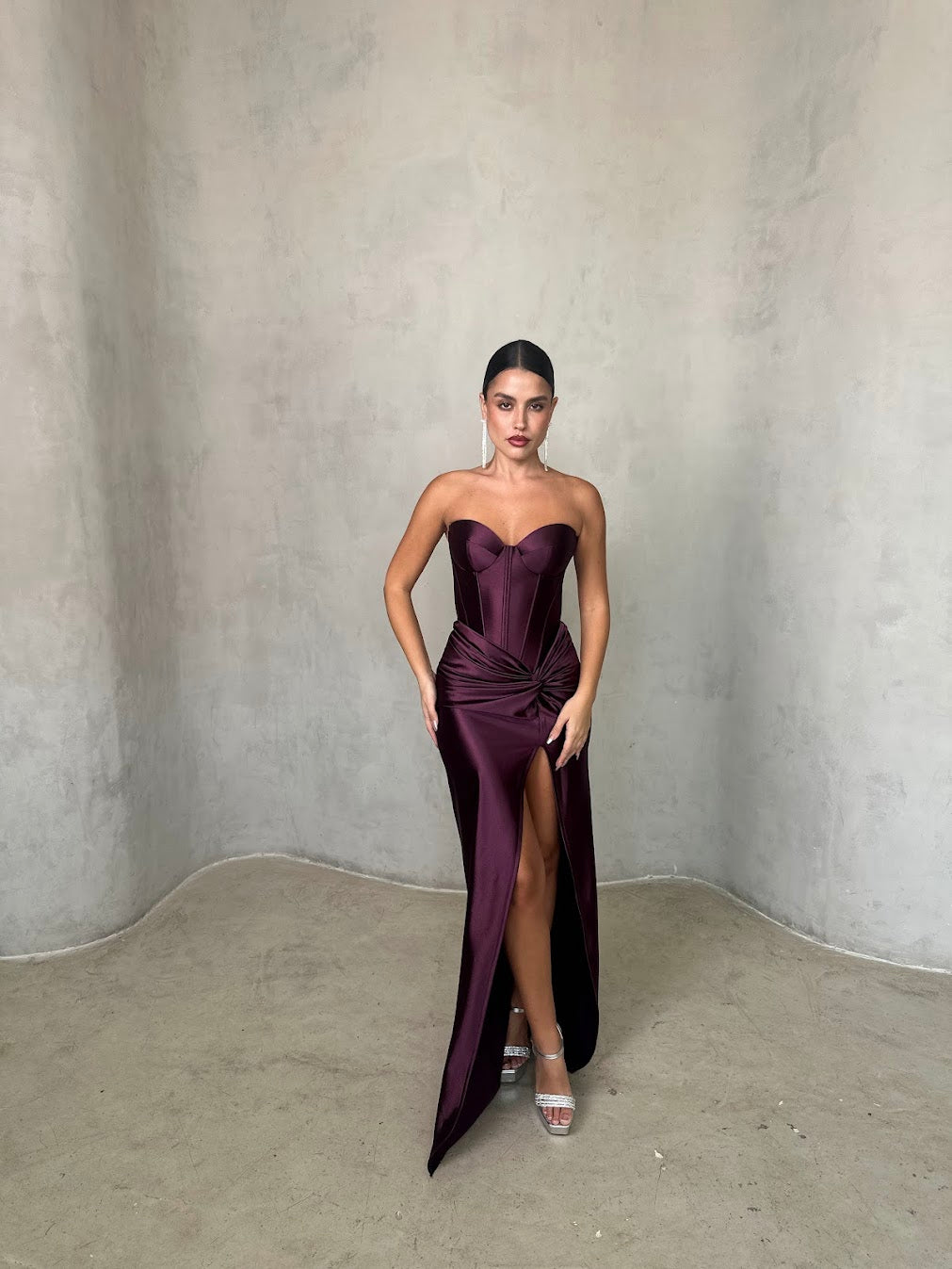 שמלת ערב סאטן עמוק עם מחוך מובנה המחטב את הגוף ומדגיש את המותן. בד מבריק ונשפך עם שסע קדמי גבוה מעניקים מראה יוקרתי ונשי, המשלב אלגנטיות עם נוכחות עוצמתית — מושלמת לאירוע ערב, נשף או חתונה.