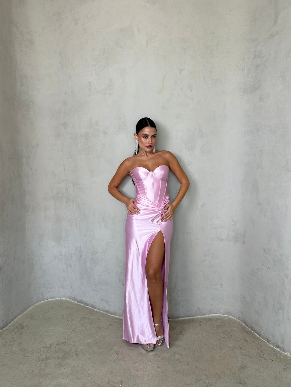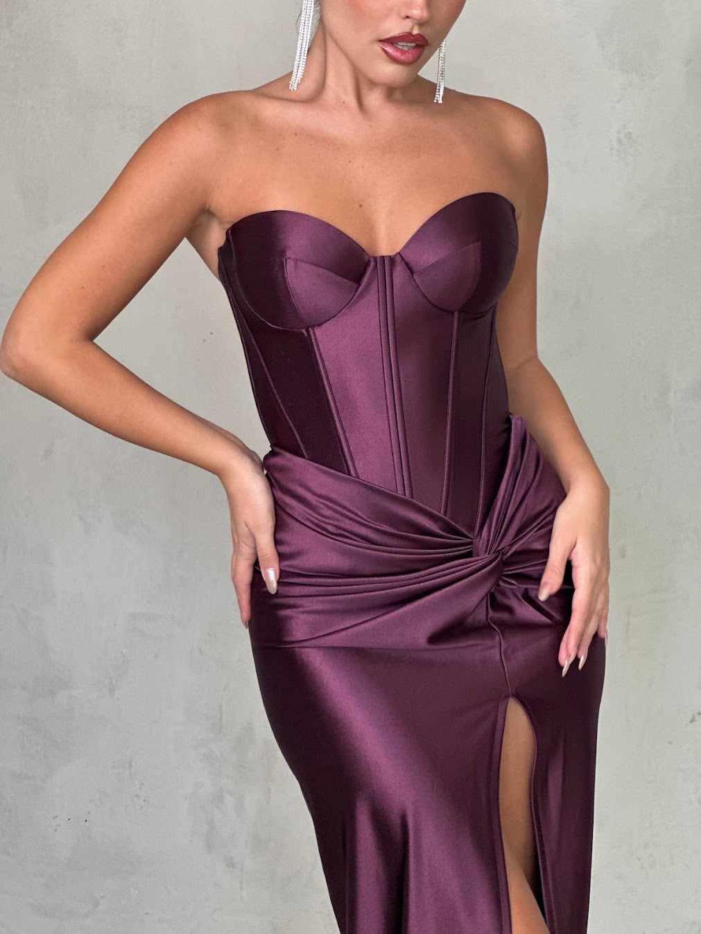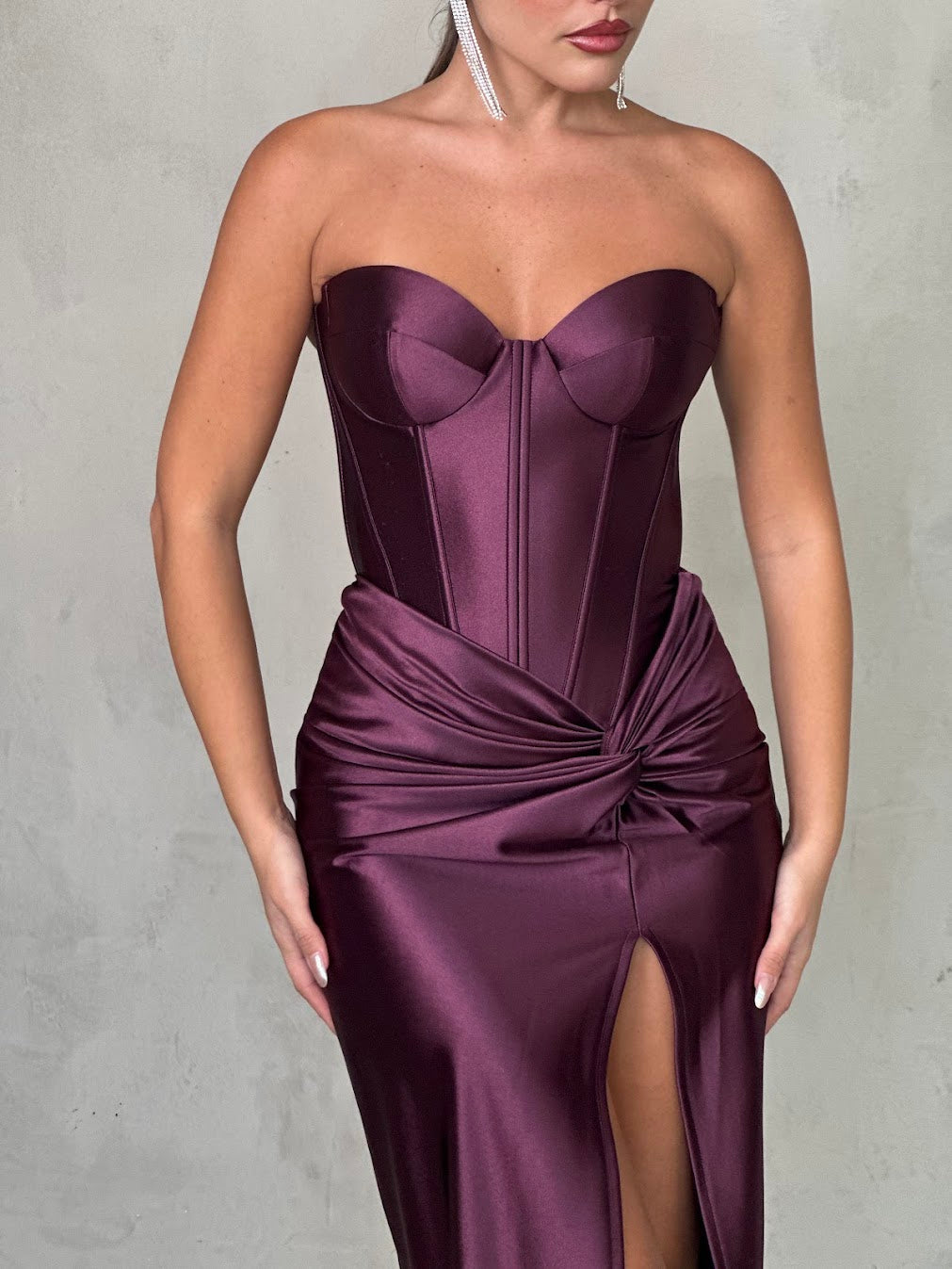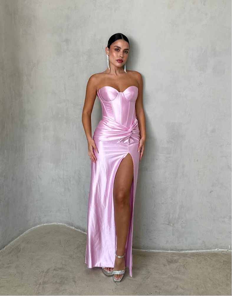 שמלת ערב סאטן עמוק עם מחוך מובנה המחטב את הגוף ומדגיש את המותן. בד מבריק ונשפך עם שסע קדמי גבוה מעניקים מראה יוקרתי ונשי, המשלב אלגנטיות עם נוכחות עוצמתית — מושלמת לאירוע ערב, נשף או חתונה.