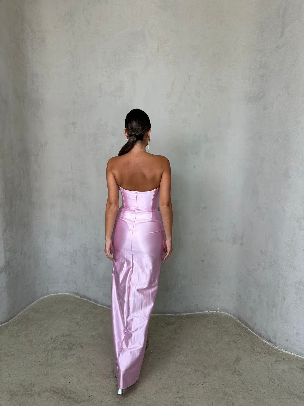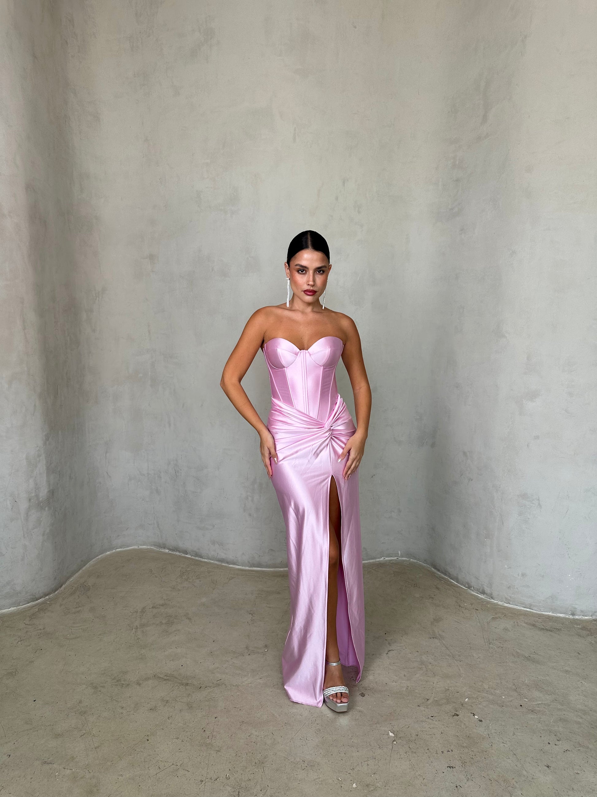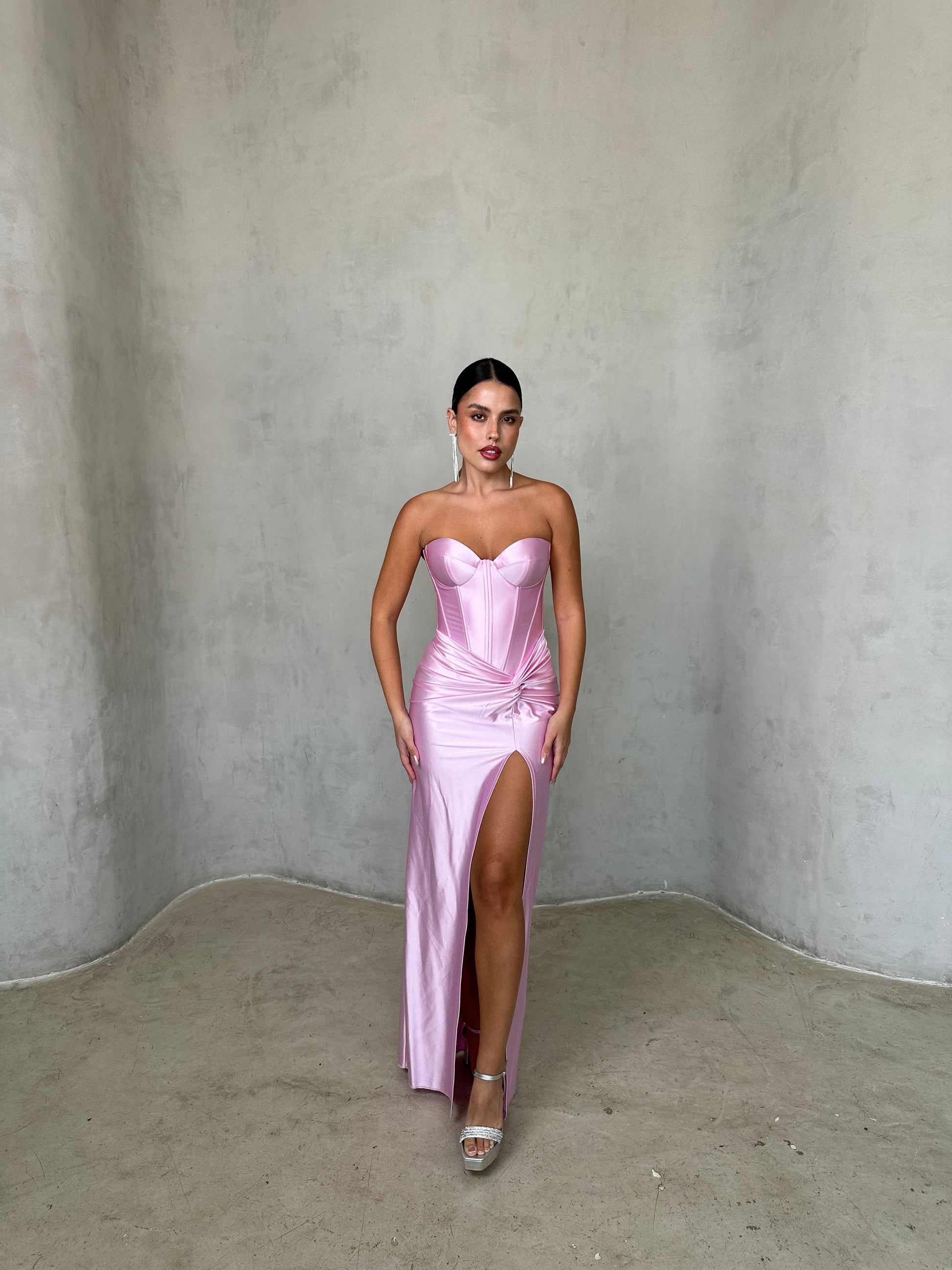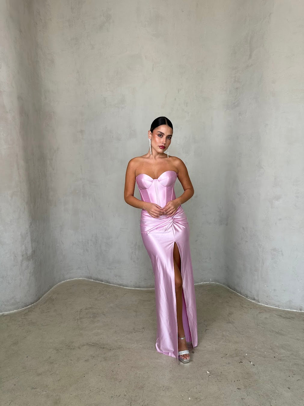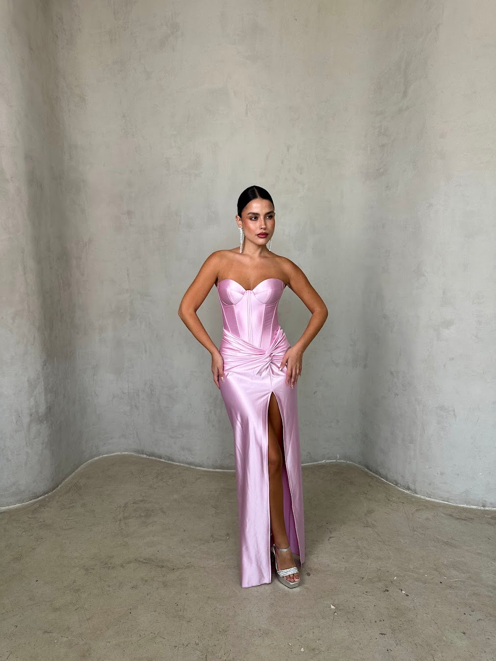שמלת ערב סאטן עמוק עם מחוך מובנה המחטב את הגוף ומדגיש את המותן. בד מבריק ונשפך עם שסע קדמי גבוה מעניקים מראה יוקרתי ונשי, המשלב אלגנטיות עם נוכחות עוצמתית — מושלמת לאירוע ערב, נשף או חתונה.