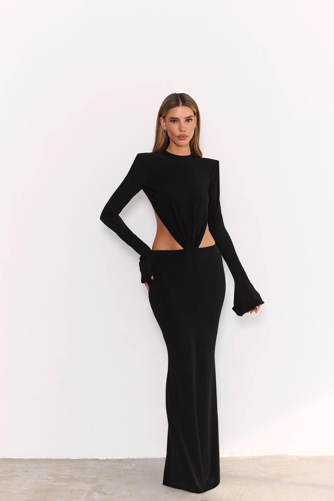 דגם נועז, מחטב ומלא סטייל – שמלת מקסי שחורה בעיצוב מודרני שמבליט את הגוף בדיוק במקומות הנכונים.