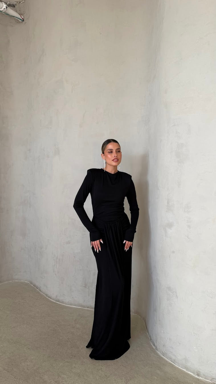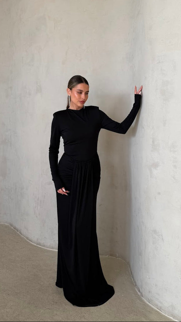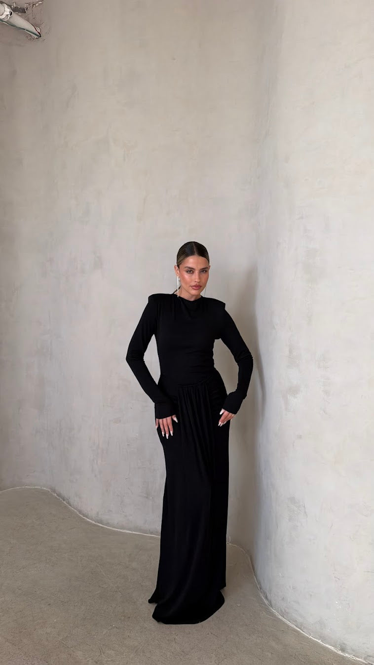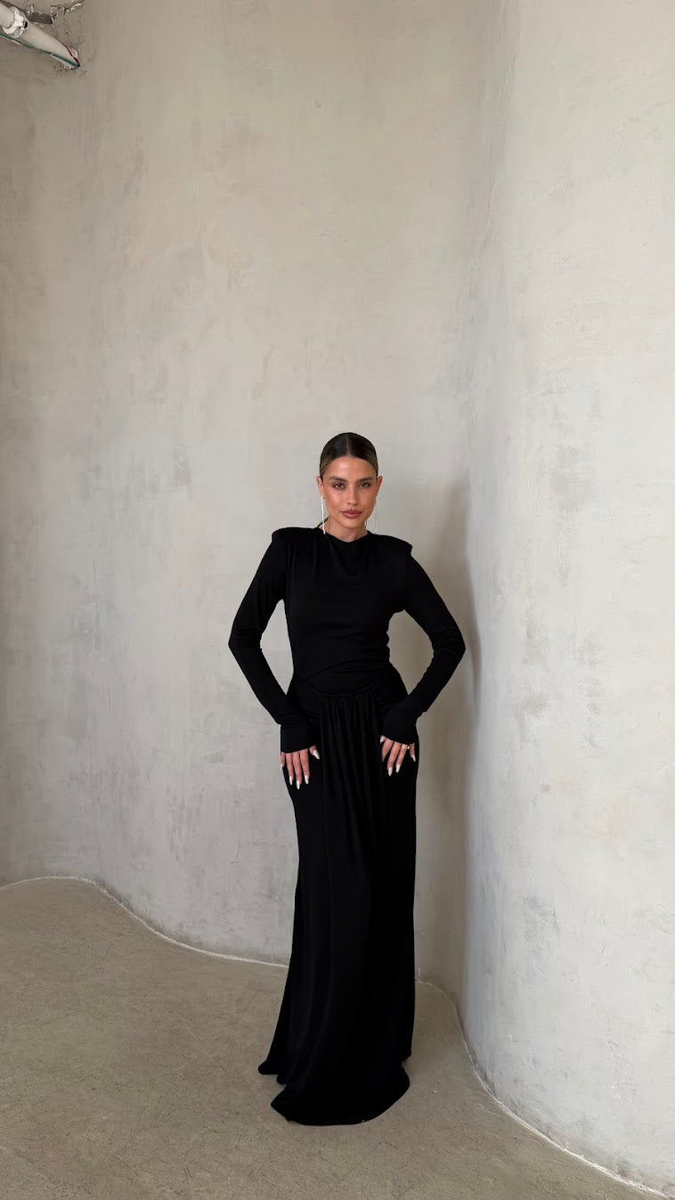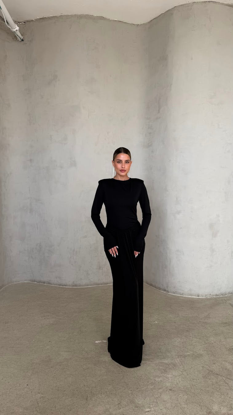 שמלת מקסי בגזרה מחטבת עם כתפיים מודגשות וסילואטה נשית ונקייה.