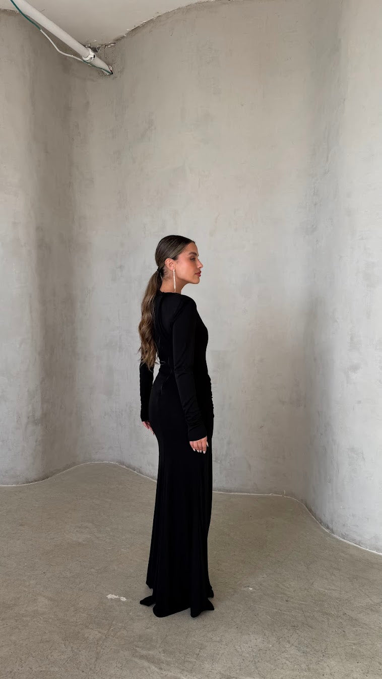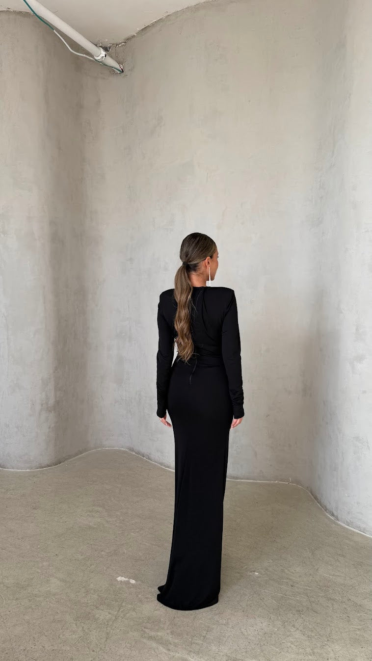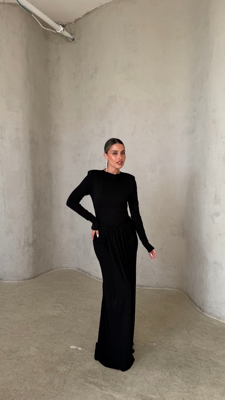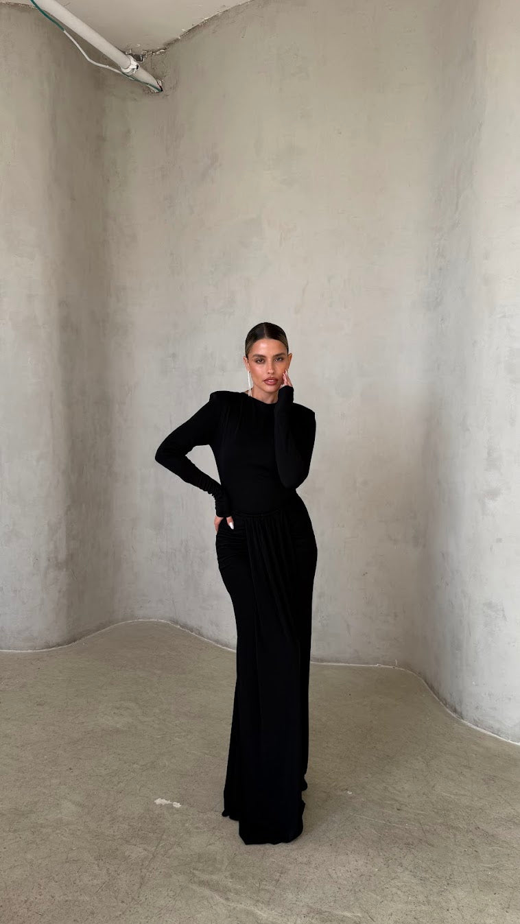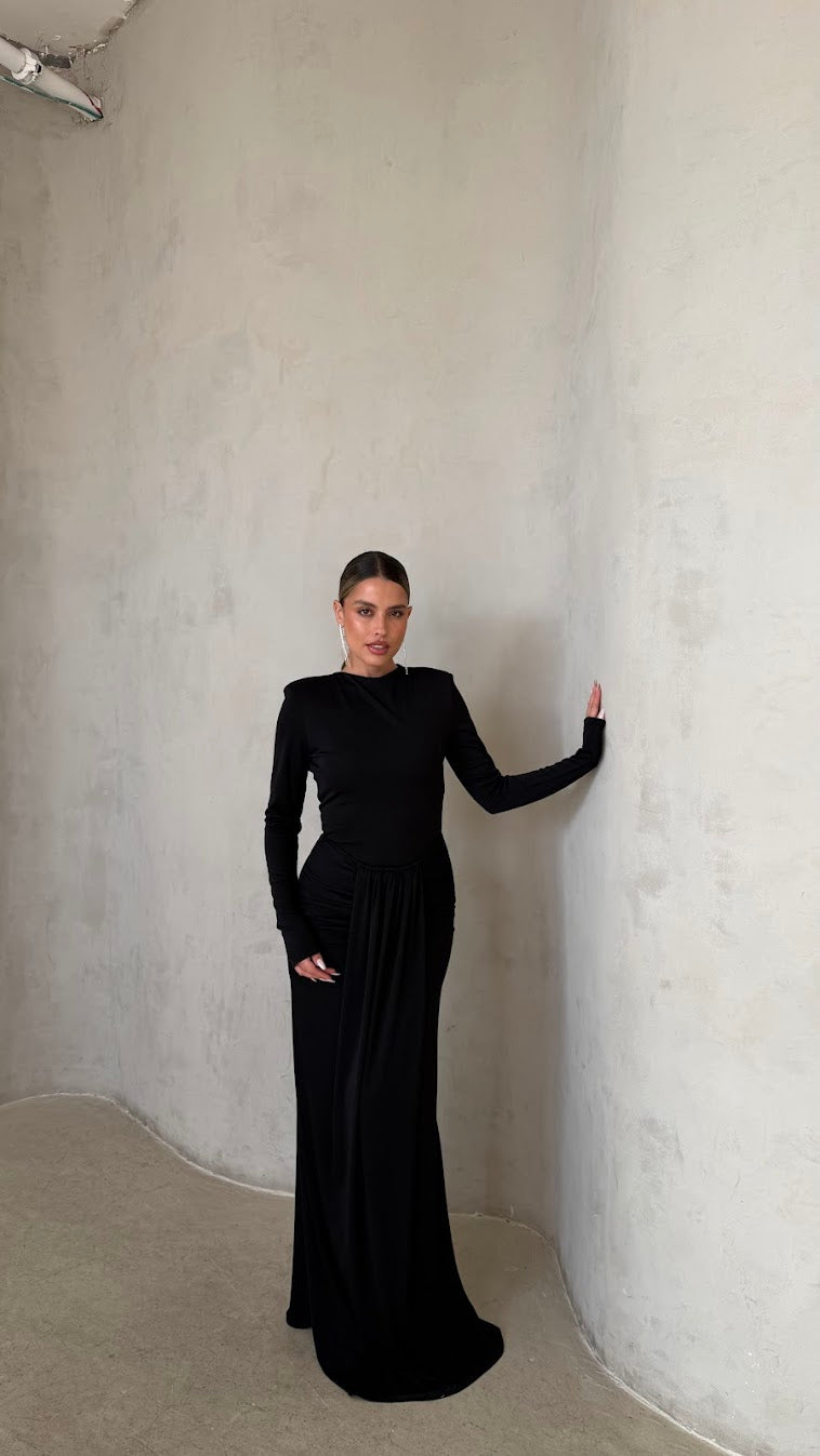 שמלת מקסי בגזרה מחטבת עם כתפיים מודגשות וסילואטה נשית ונקייה.