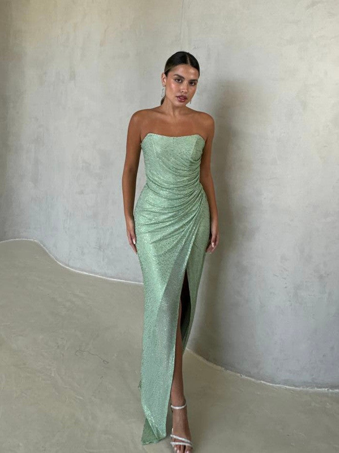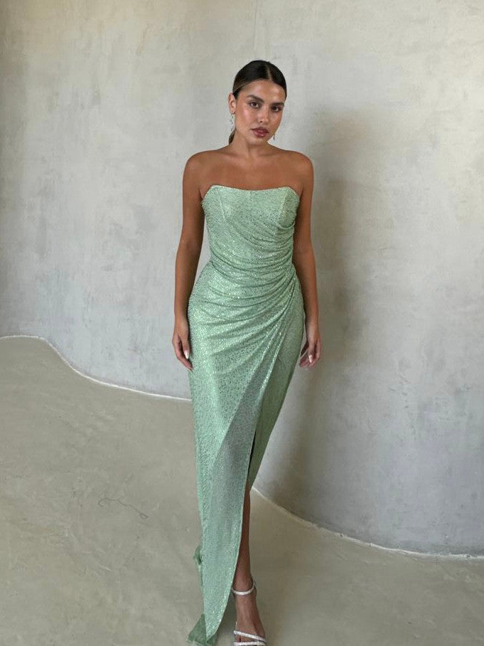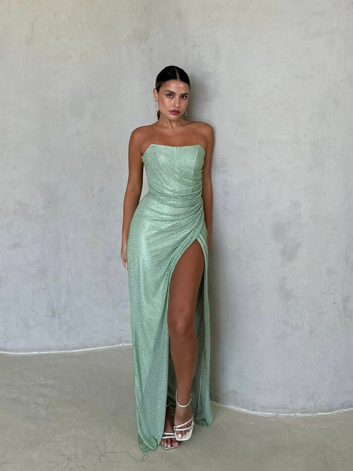 שמלת מקסי עם מחוך , שסע מעטפה ,עשירה מאוד מבד אבני סברובסקי מנצנץ , בקיצור השמלה הכי יוקרתית שתהיה לך בארון.
