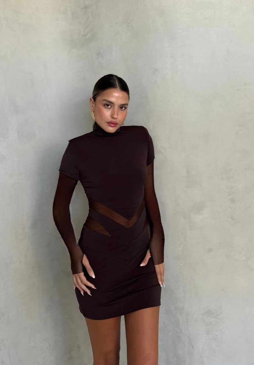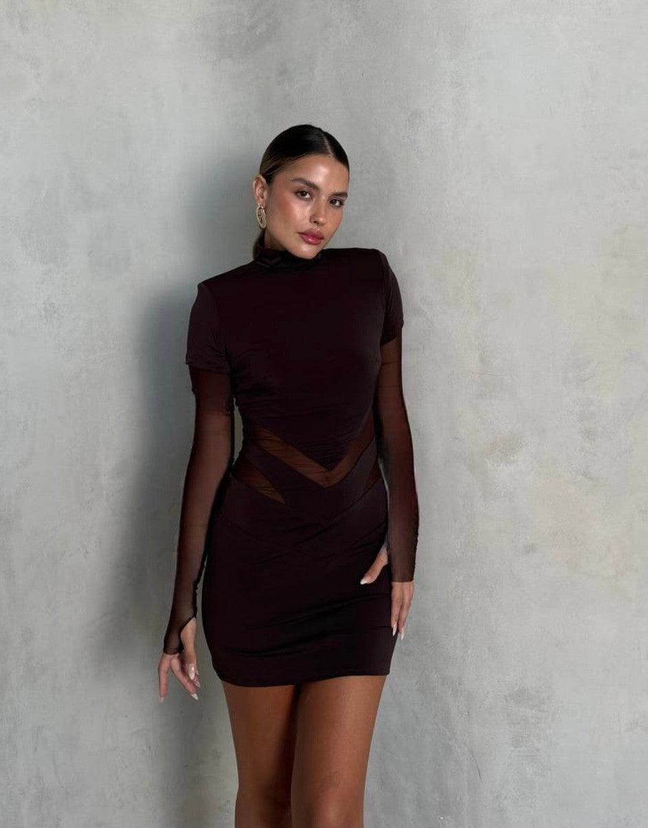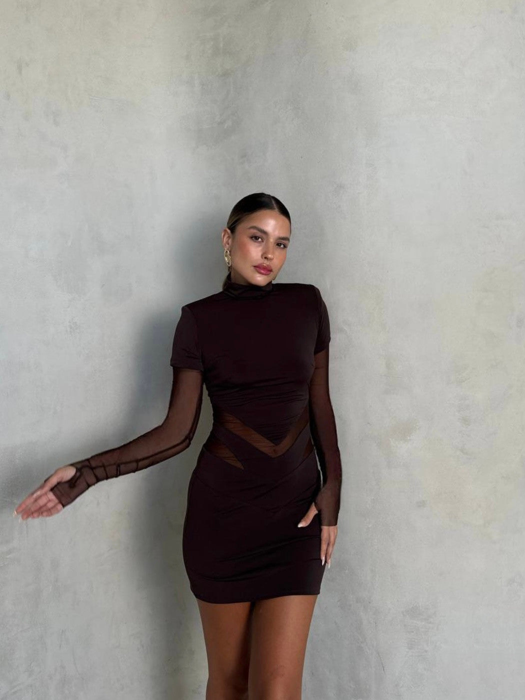 שמלת מיני גולף | בגזרה צמודה על הגוף , משולבת עם שני סוגי בד , בד נאון נמתח וחזק על הגוף ותחתית שיפון בשרוולים,משולב עם פתחים בבטן משיפון , עם כריות בכתפיים .