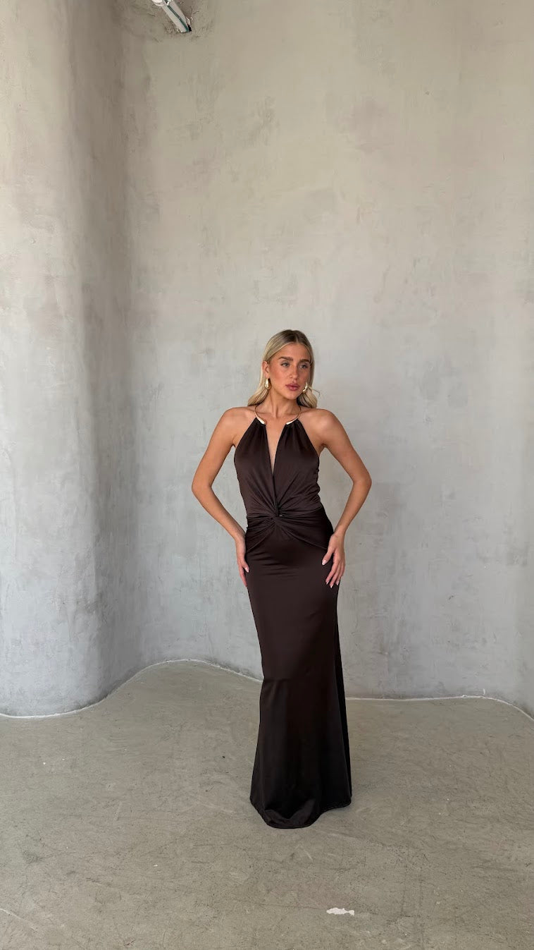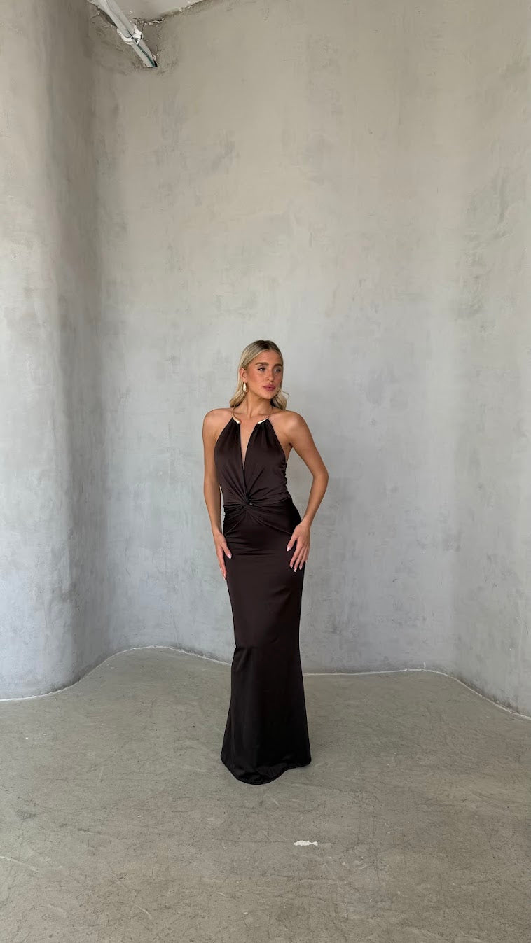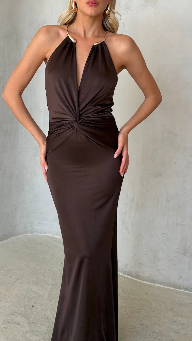 שמלת ערב אלגנטית ונשית, בעיצוב מחמיא ועל־זמני. השמלה מעוצבת בגזרת קולר עם מחשוף וי עמוק המודגש באמצעות תכשיט מתכתי עדין המשולב באזור הצוואר, המוסיף טאץ’ יוקרתי וייחודי ומשמש כאלמנט עיצובי מרכזי. החלק העליון מעוצב בקפלים מחטבים באזור החזה והמותן, היוצרים סילואטה נשית וזורמת.