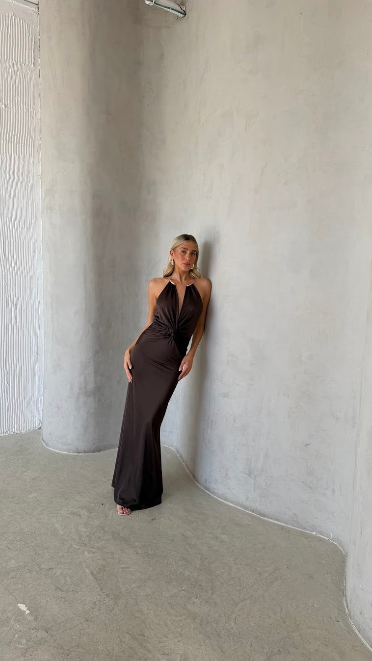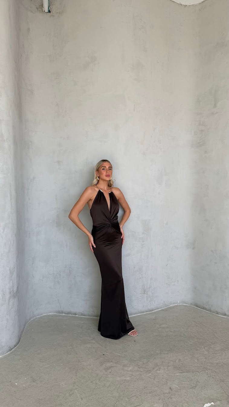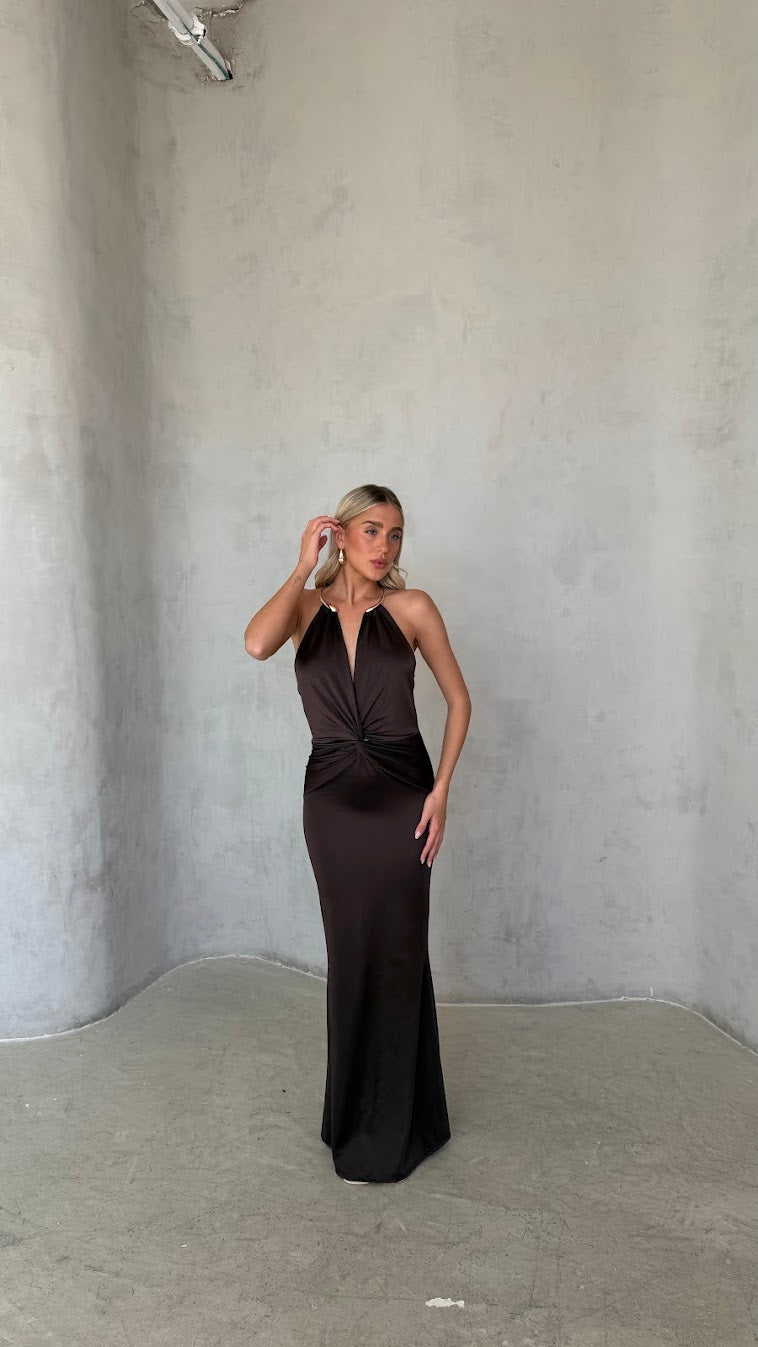 שמלת ערב אלגנטית ונשית, בעיצוב מחמיא ועל־זמני. השמלה מעוצבת בגזרת קולר עם מחשוף וי עמוק המודגש באמצעות תכשיט מתכתי עדין המשולב באזור הצוואר, המוסיף טאץ’ יוקרתי וייחודי ומשמש כאלמנט עיצובי מרכזי. החלק העליון מעוצב בקפלים מחטבים באזור החזה והמותן, היוצרים סילואטה נשית וזורמת.