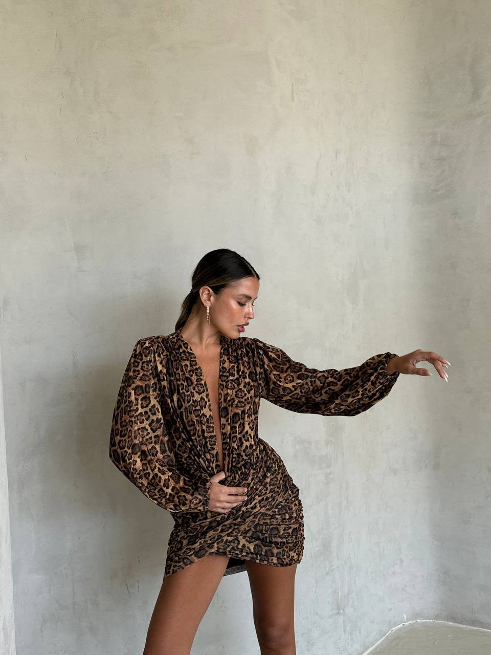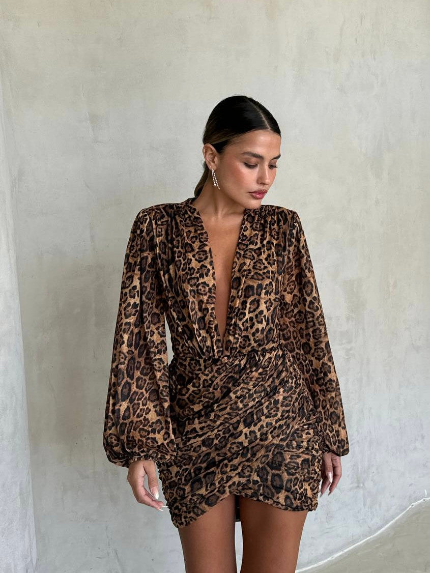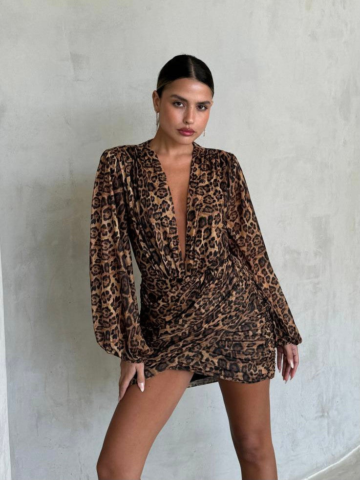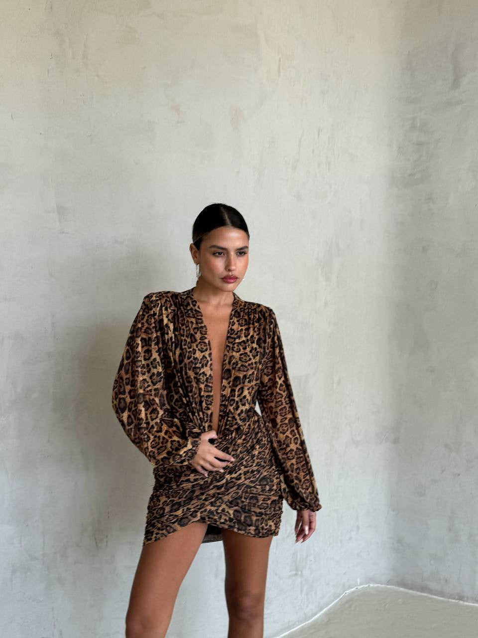 שמלת מיני מבד שיפון לייקרה ,מפתח עמוק בחזה בשילוב מעטפת בחצאית הדפס מנומר.