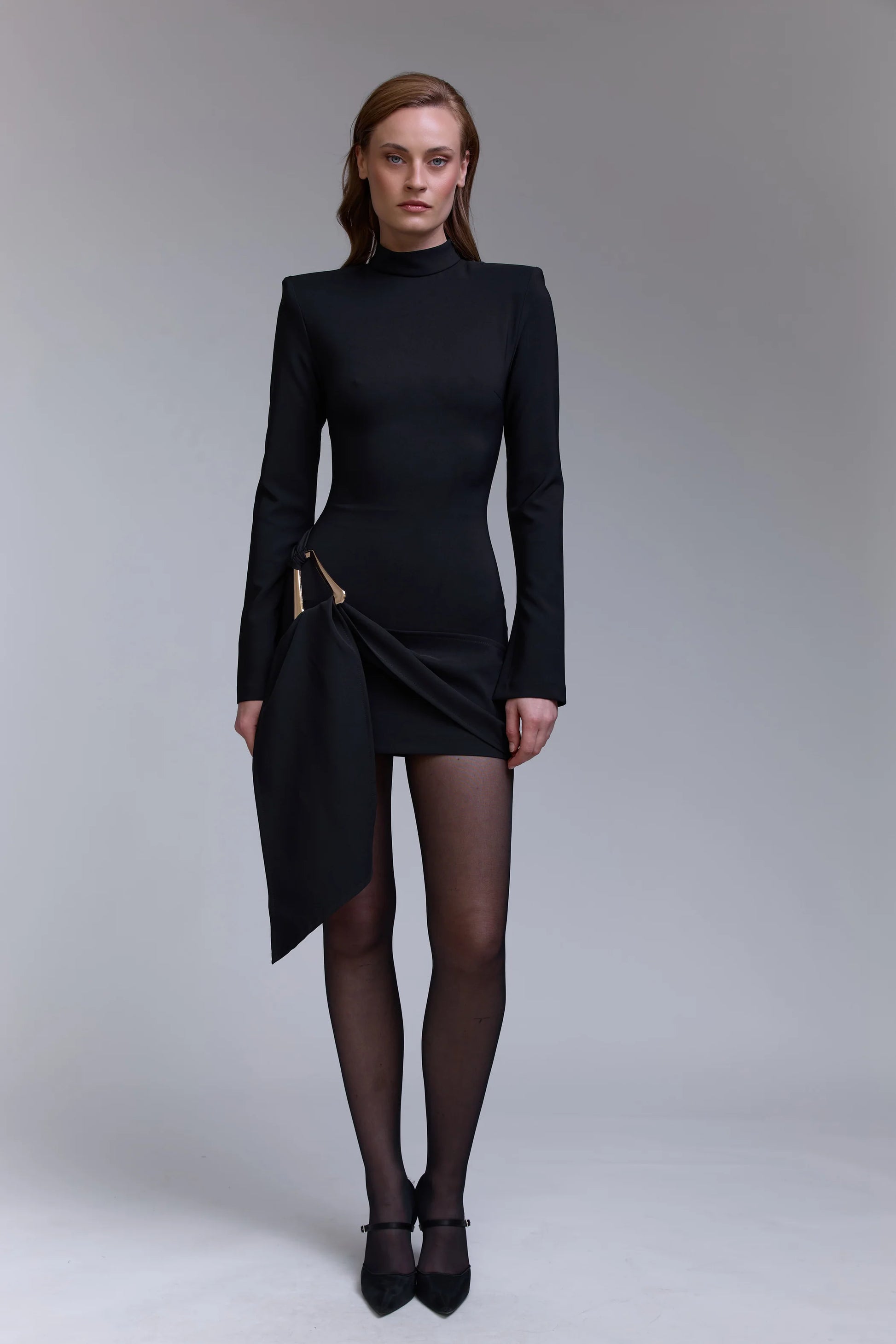 שמלה מיני בגזרת גולף אלגנטית ומחמיאה , עם שרוולים ארוכים ושסע עדין בסיומת . בחלק הקדמי של השמלה ישנה רצועת בד ייחודית שמשלבת אלמנט טרפז מוזהב להשלמת הלוק , נסגרת בגב עם רוכסן נסתר למראה נקי ומוקפד. מושלמת לאירוע ערב או לדייט נייט מגניב.