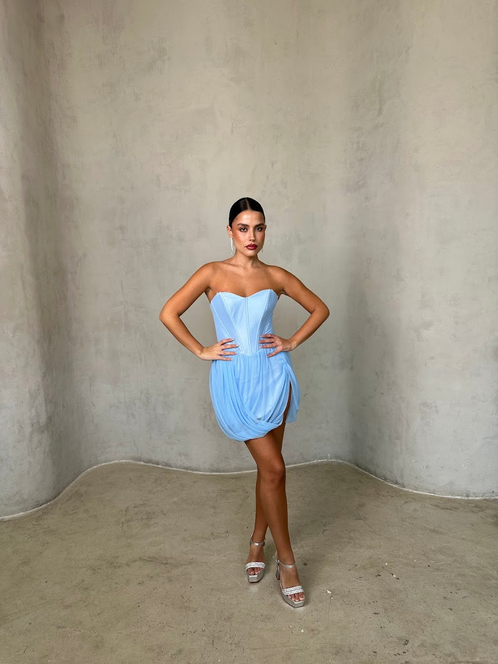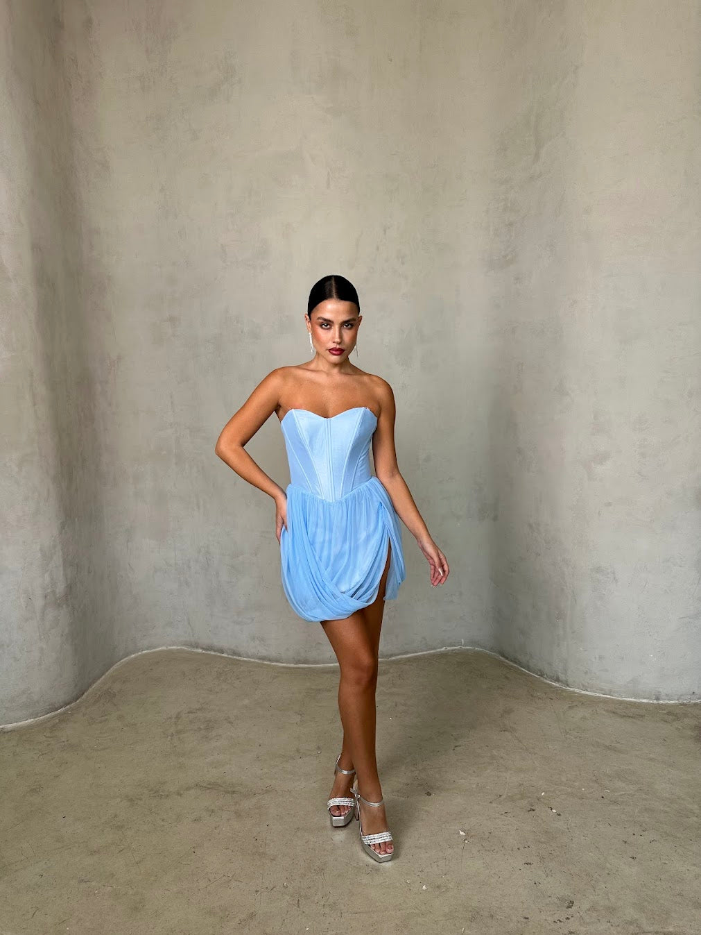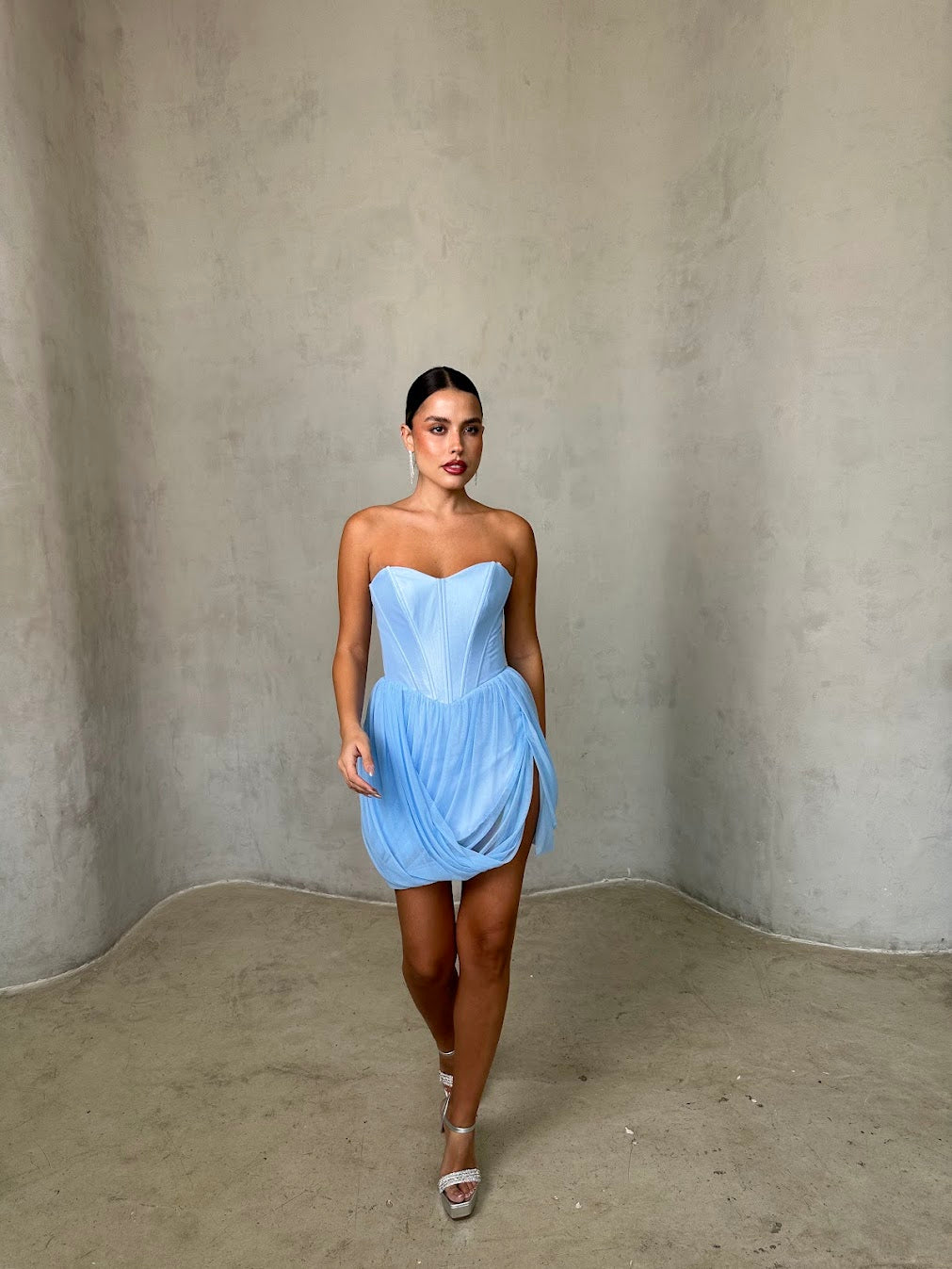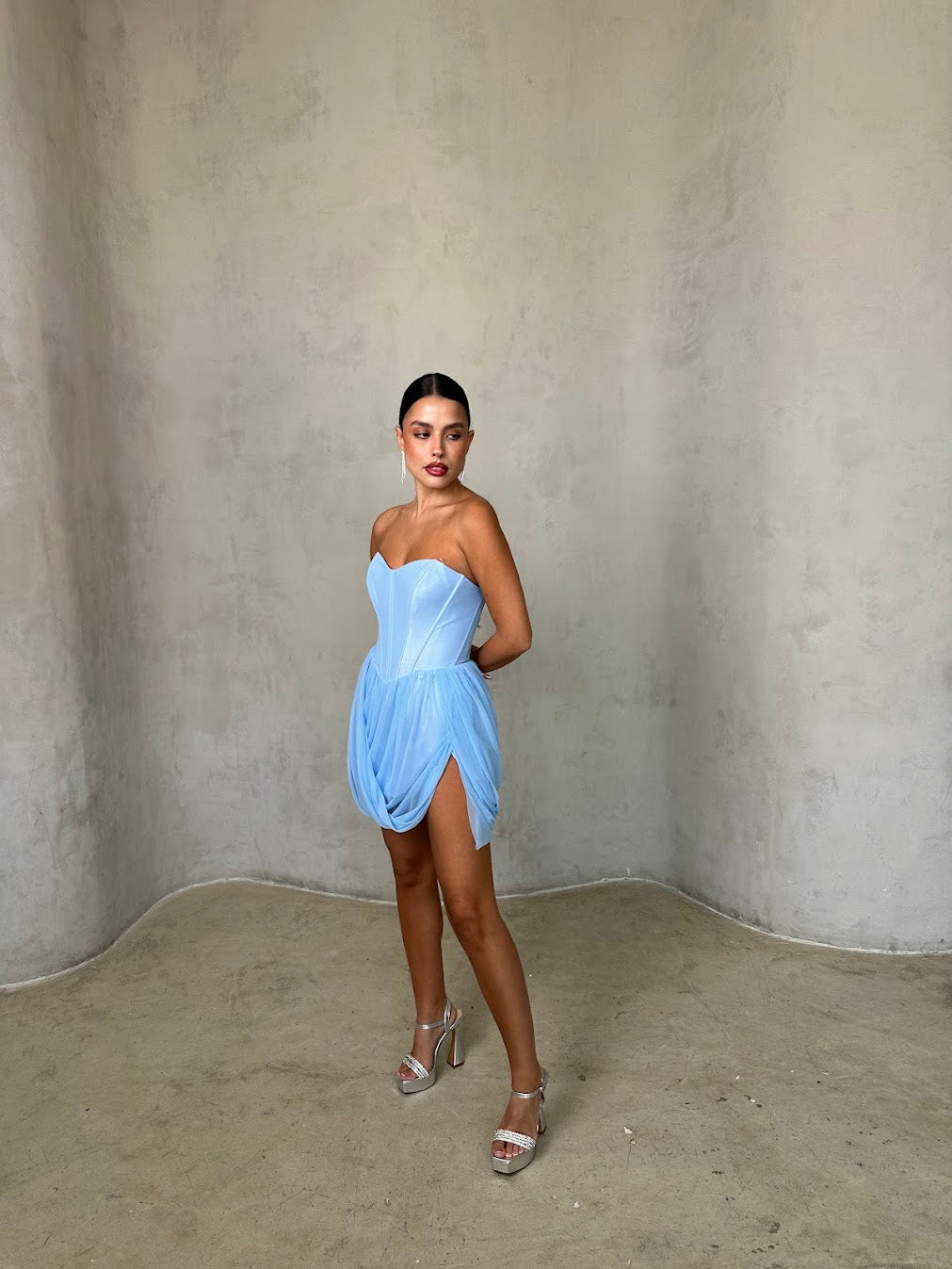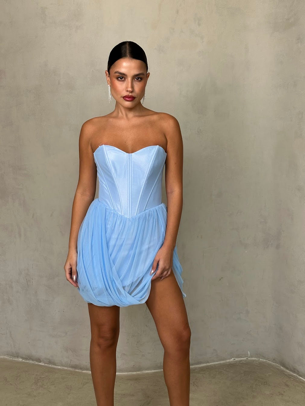שמלת מיני בגזרת מחוך עם חצאית טול קלילה. שילוב של יוקרה ורכות שמעניק לוק נשי, מרשים ובלתי נשכח.
