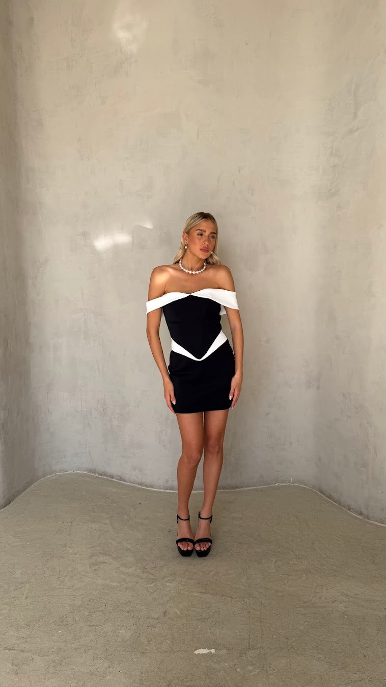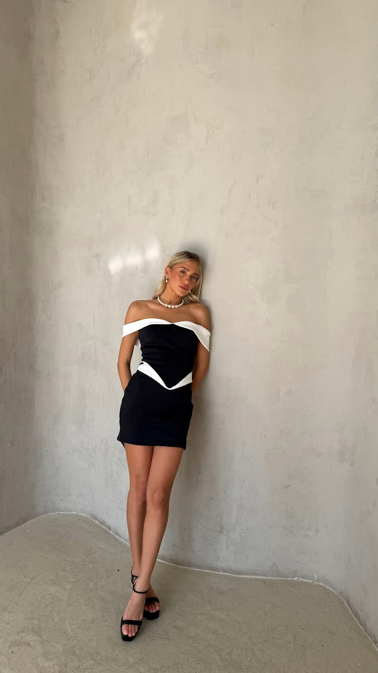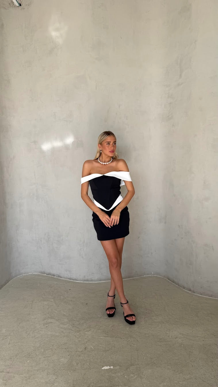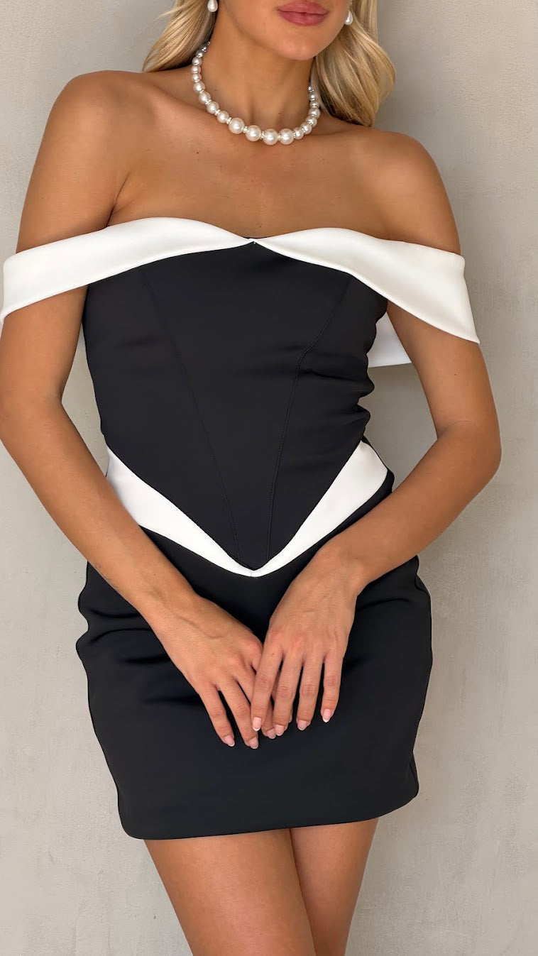 שמלת מיני אלגנטית ונשית בעיצוב סטרפלס עם שילוב צבעים קלאסי של שחור ולבן. החלק העליון מעוצב כמחוך מובנה המדגיש את קו המותן והחזה, עם חיתוכים גיאומטריים מדויקים היוצרים מראה מחטב ויוקרתי. האלמנט הלבן ממשיך בקו נקי גם באזור הכתפיים החשופות ומוסיף קונטרסט חד ומודרני.