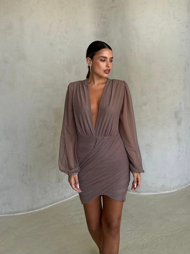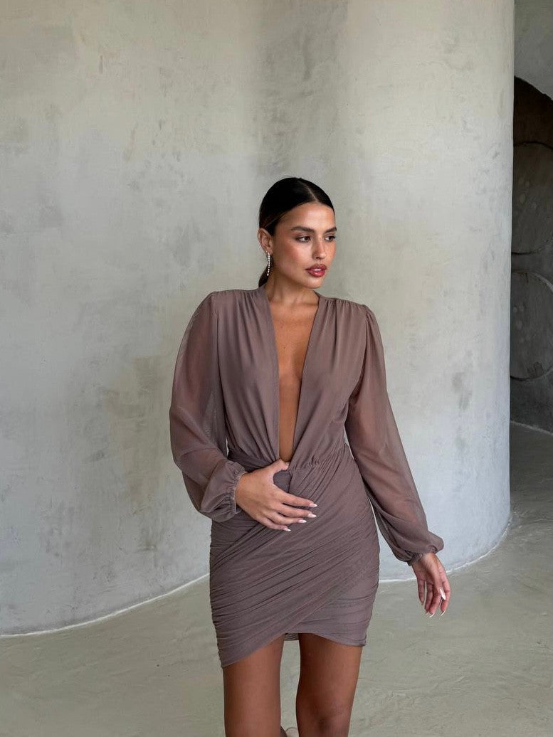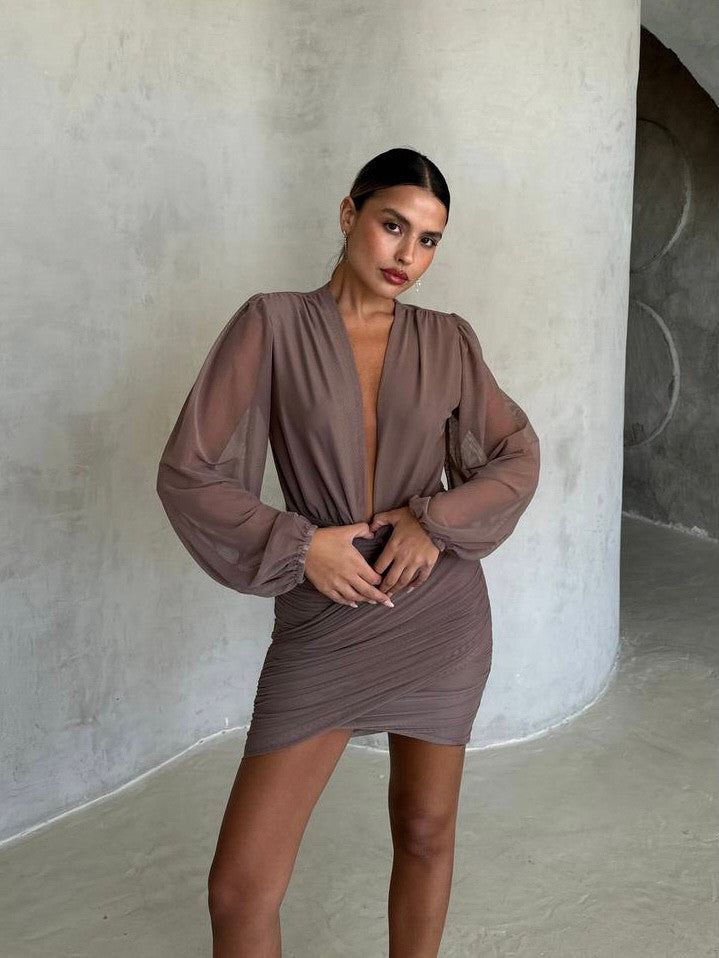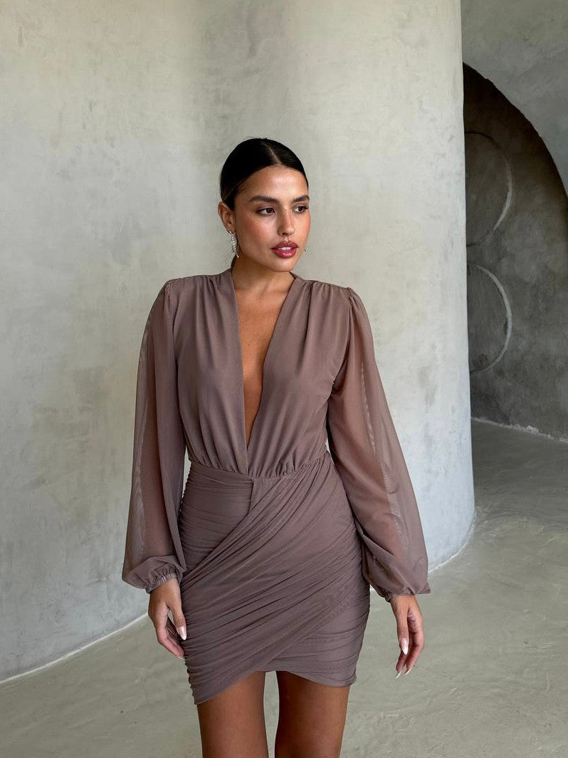 שמלת מיני מבד שיפון לייקרה ,מפתח עמוק בחזה בשילוב מעטפת בחצאית וכיווצים .