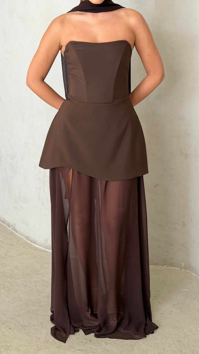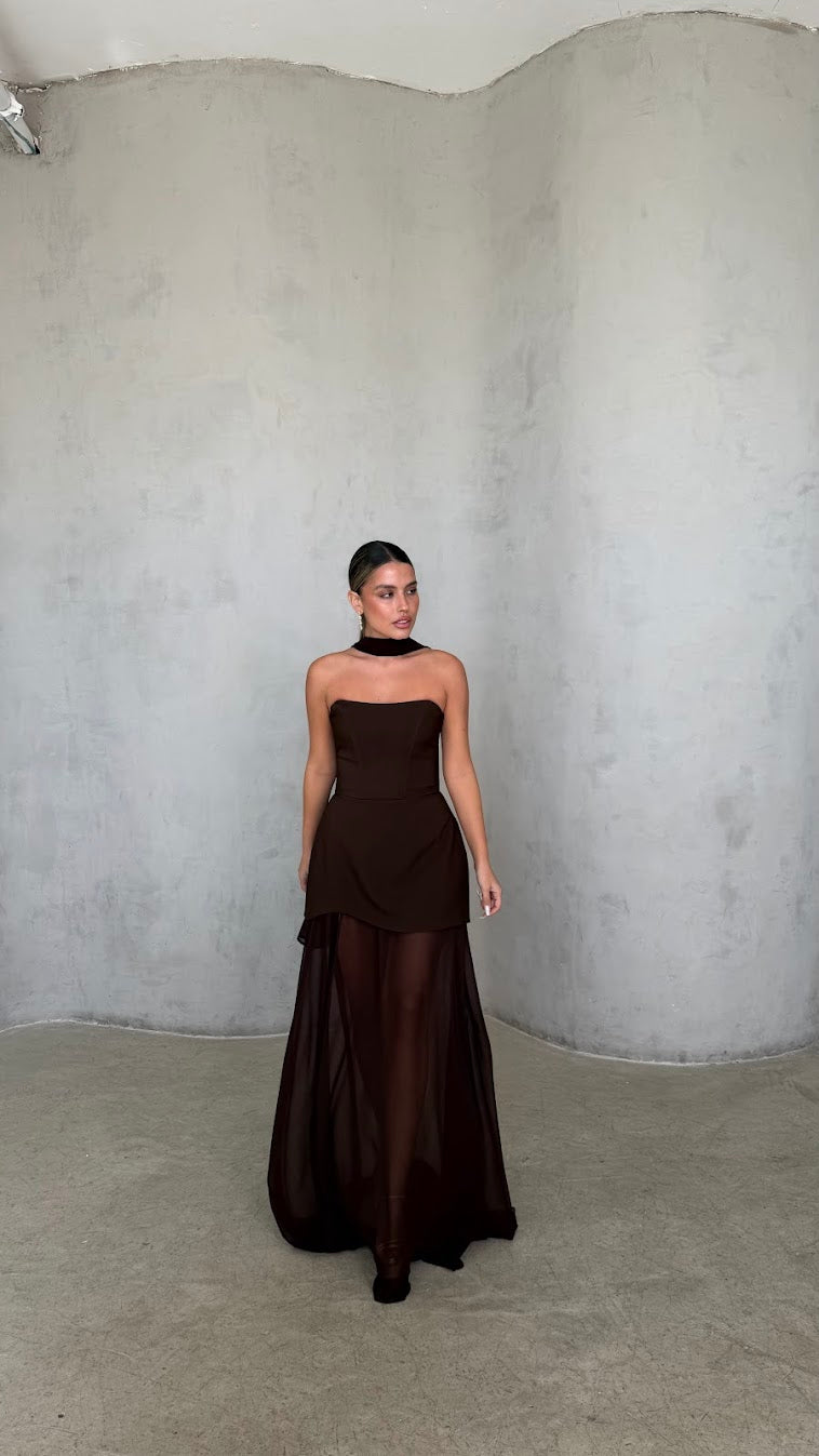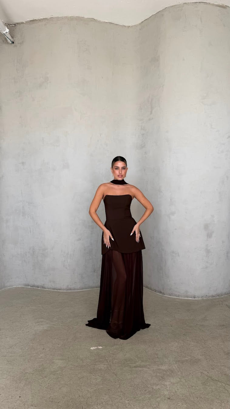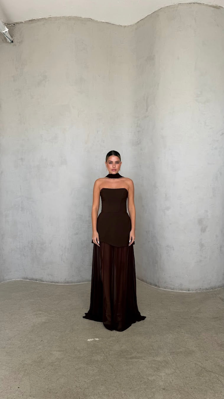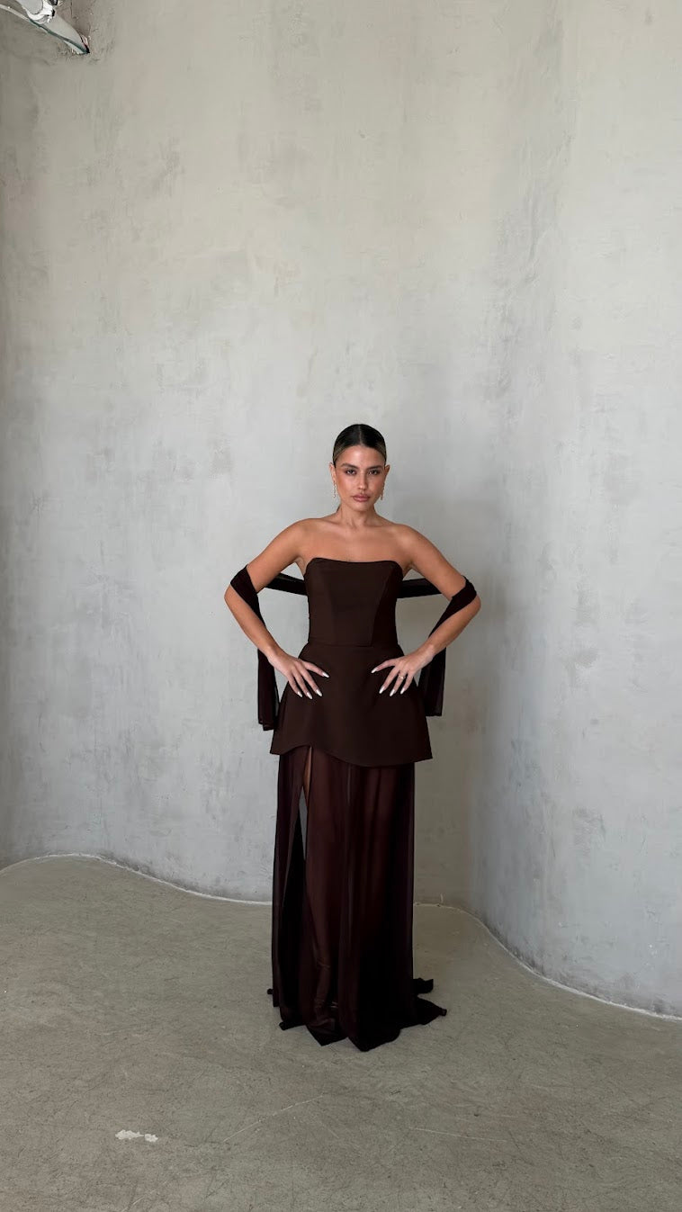 שמלת מקסי סטרפלס בגזרה מחטבת עם חלק עליון נקי ומדויק שמדגיש את קו הכתפיים והמחשוף.