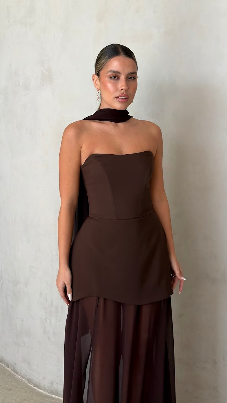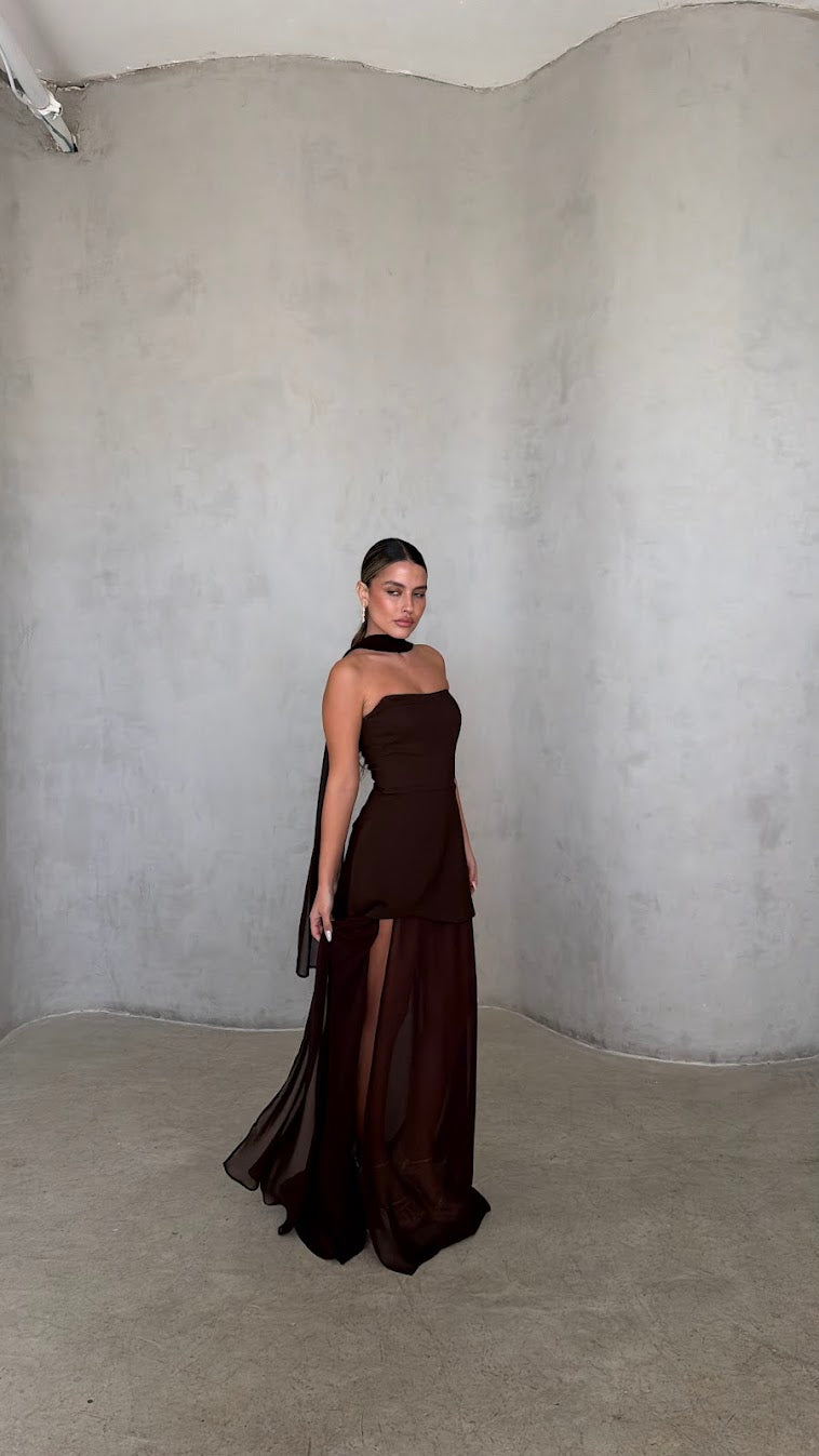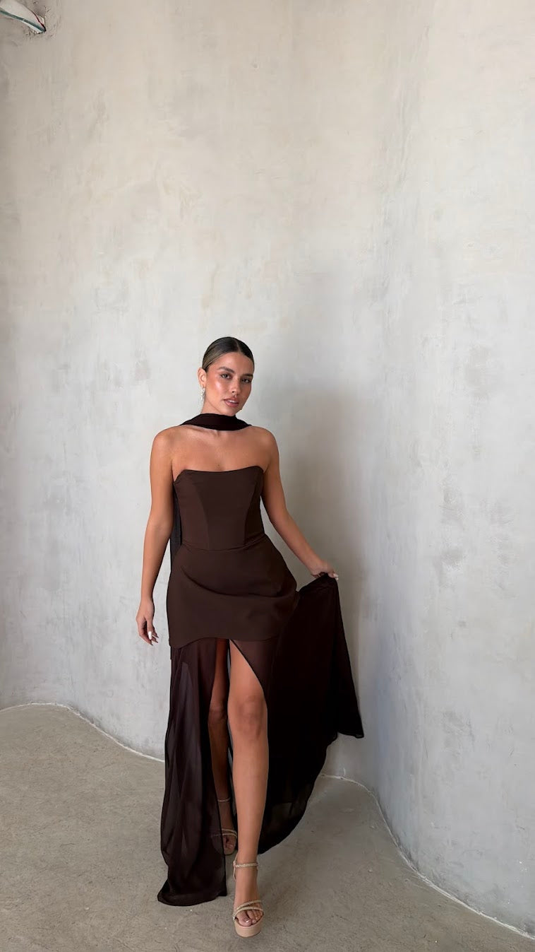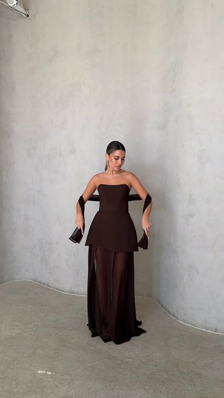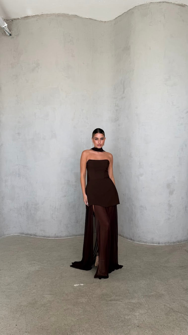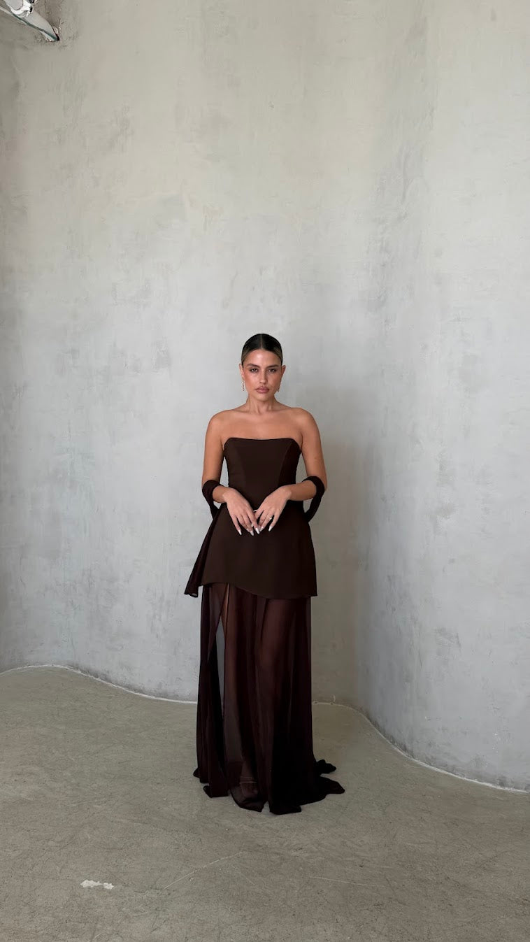 שמלת מקסי סטרפלס בגזרה מחטבת עם חלק עליון נקי ומדויק שמדגיש את קו הכתפיים והמחשוף.