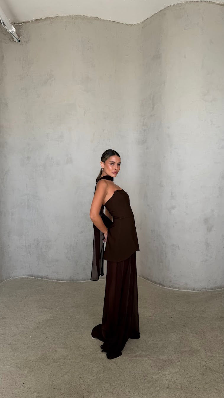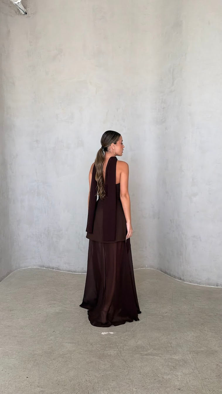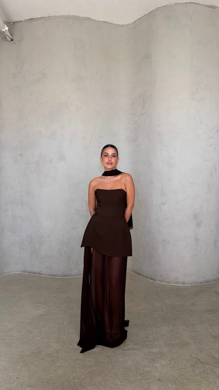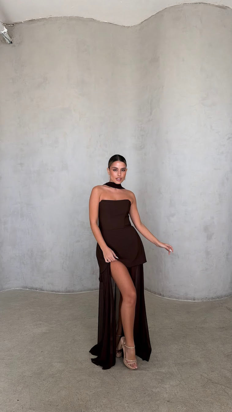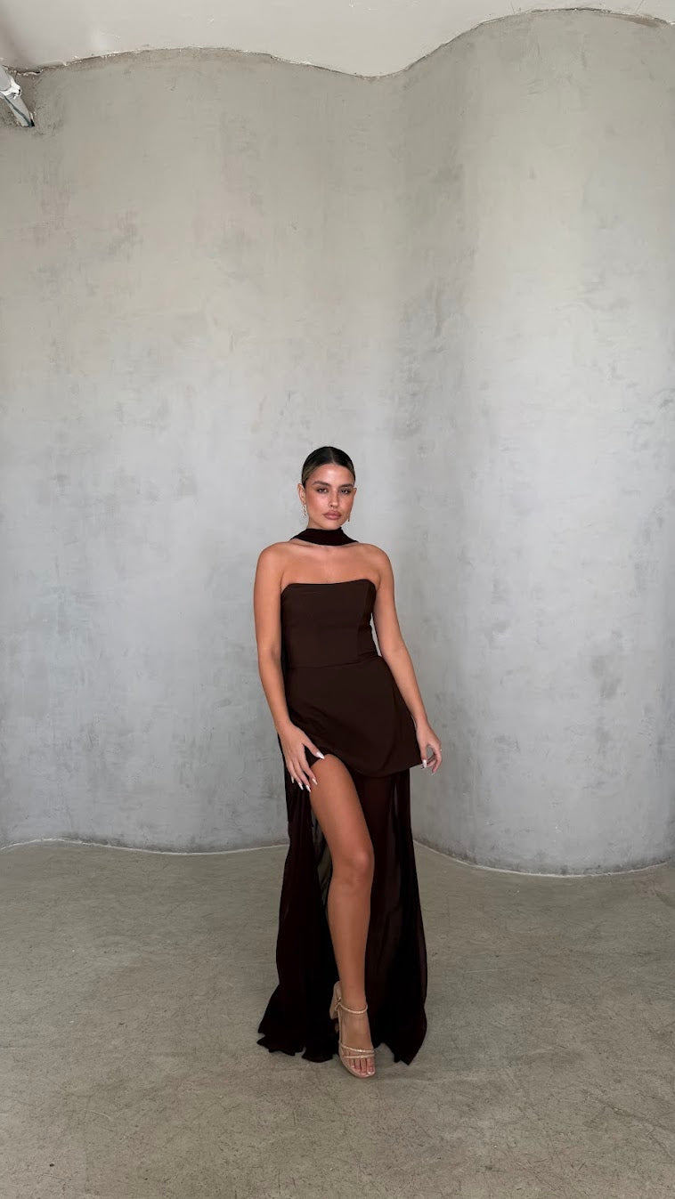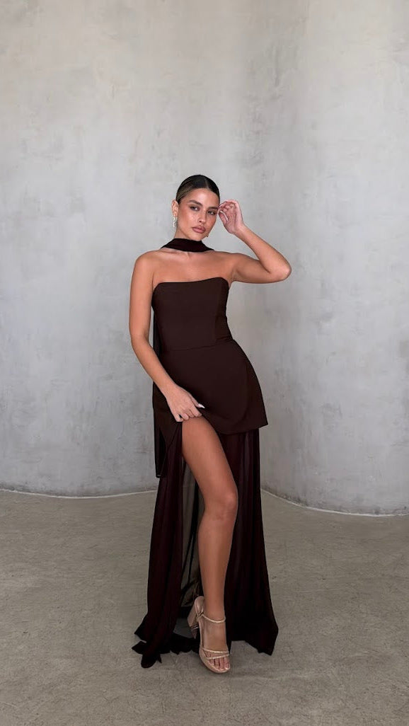 העיצוב משלב חצאית קצרה מובנית בחלק הקדמי עם שכבת בד ארוכה ונשפכת היוצרת מראה מקסי דרמטי ותנועתי.