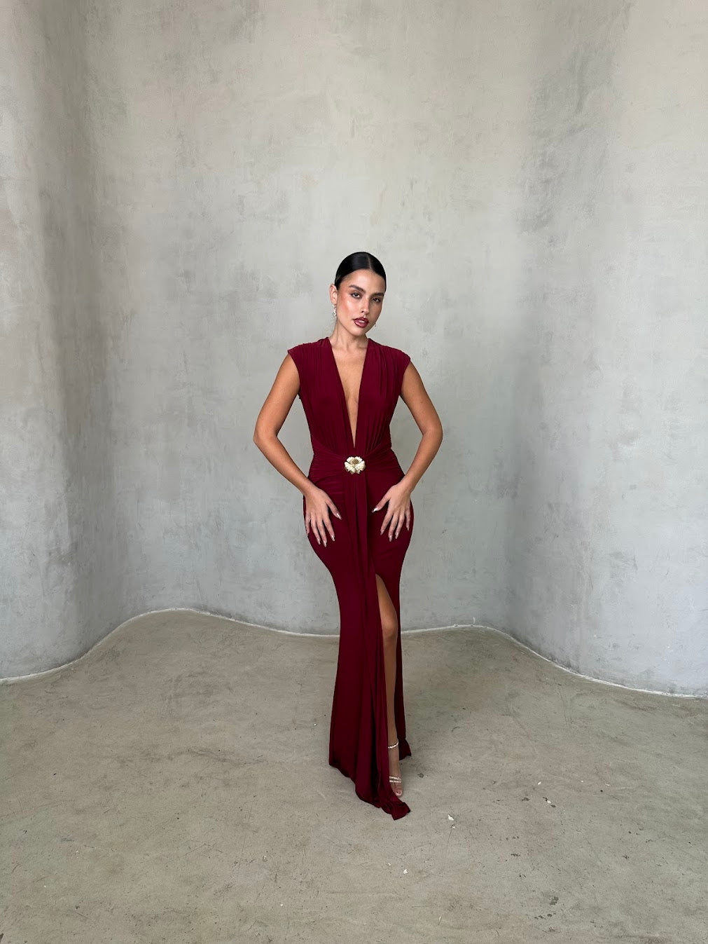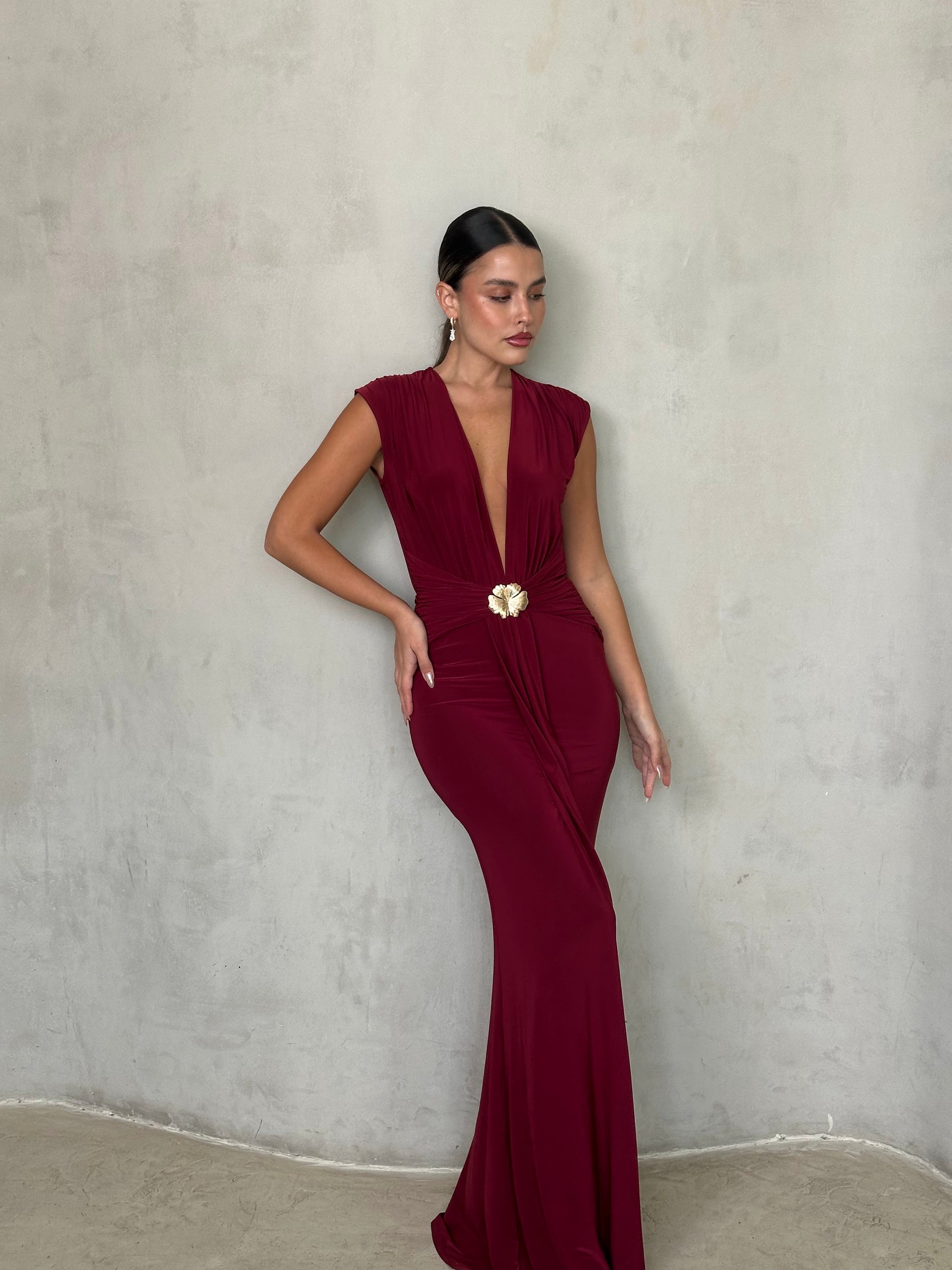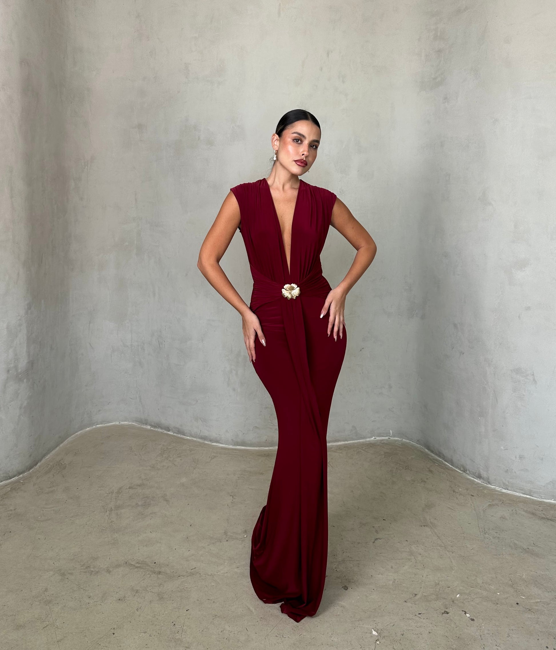 שמלת ערב אלגנטית עמוק עם מחשוף וי מודגש וגזרה מחטבת ונשפכת. במרכז המותן חגורה עדינה עם אבזם זהב שמוסיפה נגיעה יוקרתית ונשית. בד רך ונעים למגע, נמתח ומחמיא לגוף — מושלמת לאירוע ערב, חתונה או אירוע קלאסי ומלא סטייל.