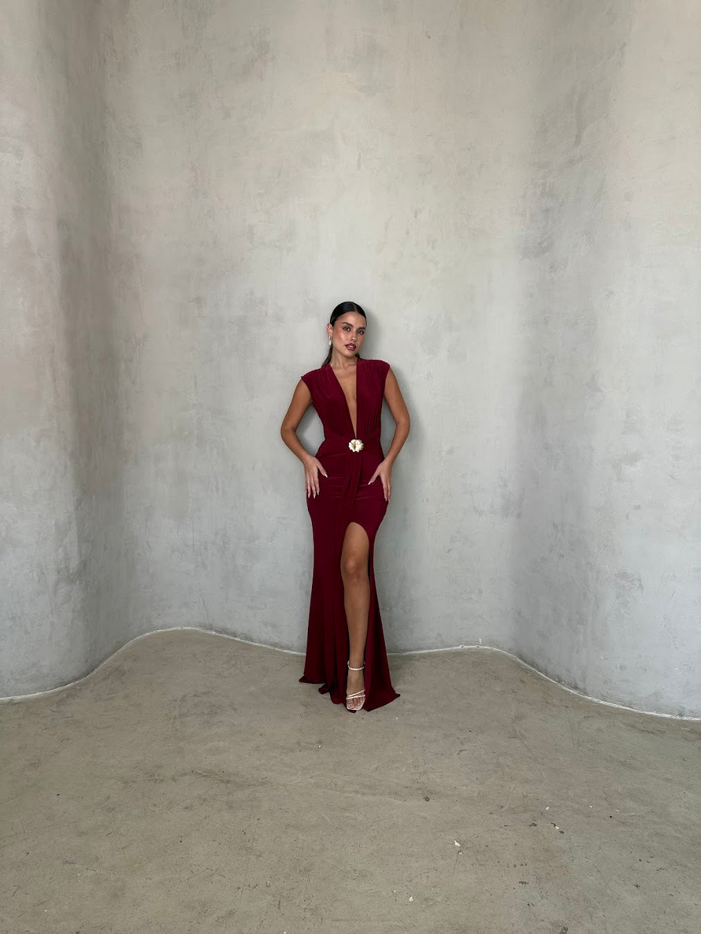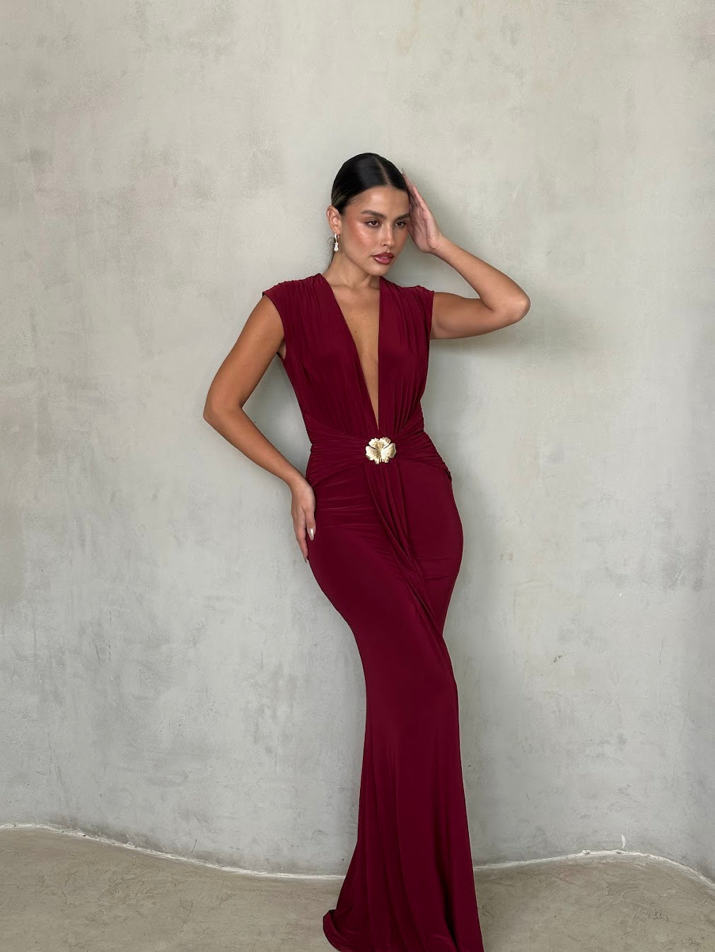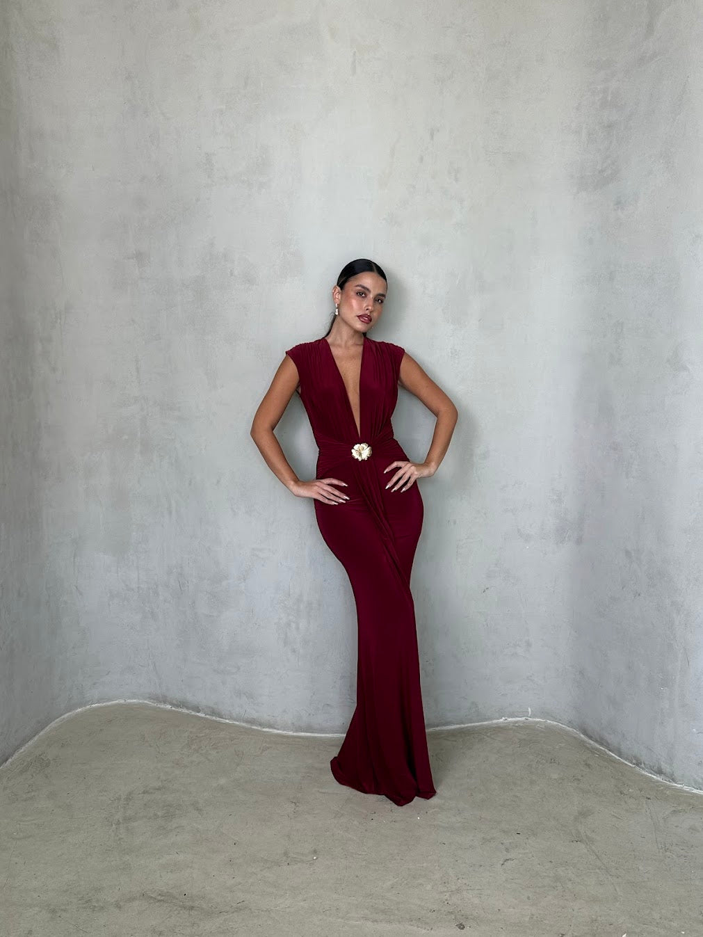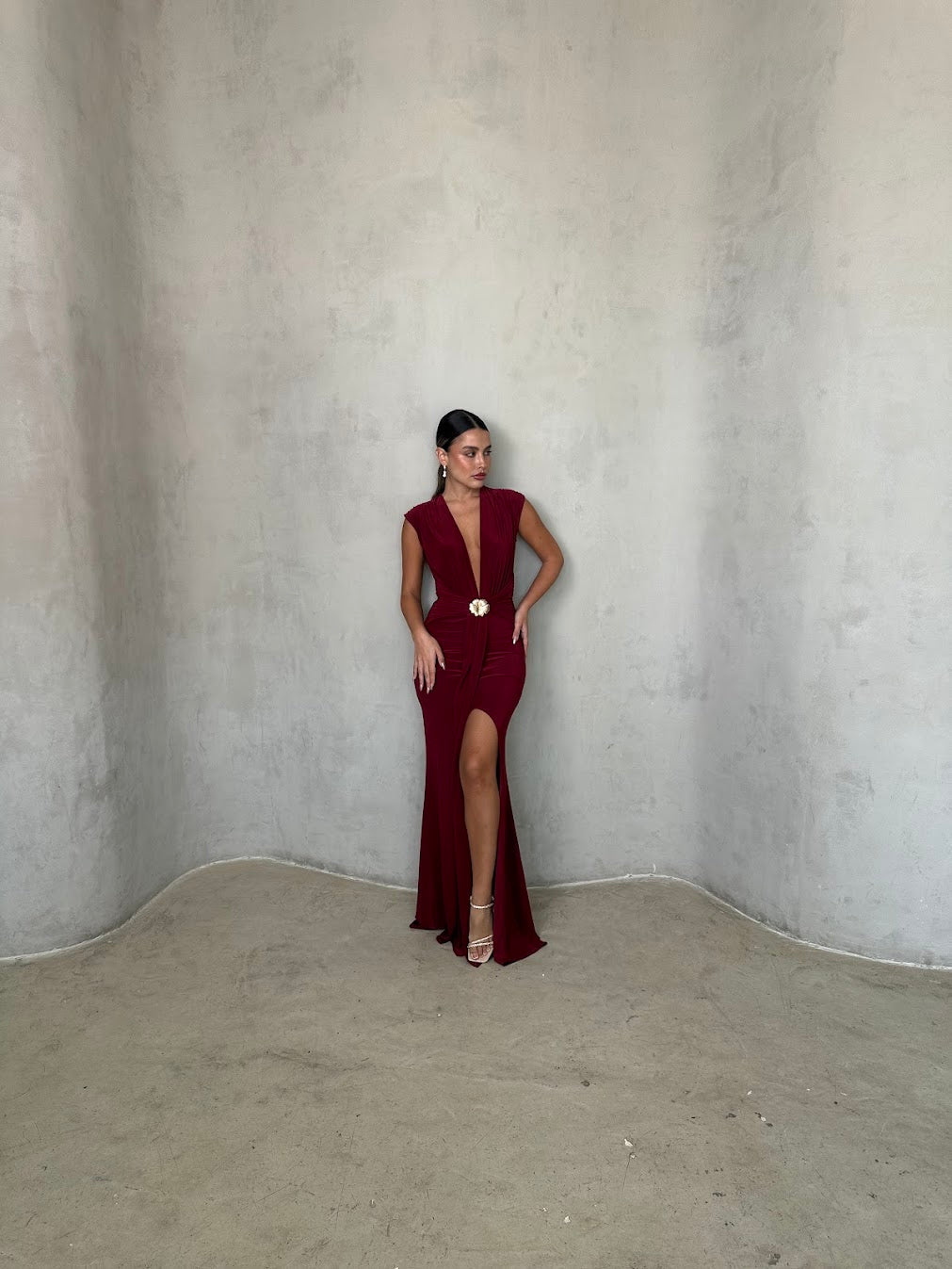 שמלת ערב אלגנטית עמוק עם מחשוף וי מודגש וגזרה מחטבת ונשפכת. במרכז המותן חגורה עדינה עם אבזם זהב שמוסיפה נגיעה יוקרתית ונשית. בד רך ונעים למגע, נמתח ומחמיא לגוף — מושלמת לאירוע ערב, חתונה או אירוע קלאסי ומלא סטייל.