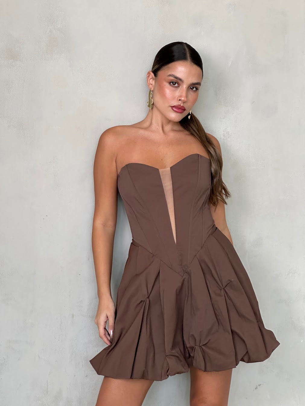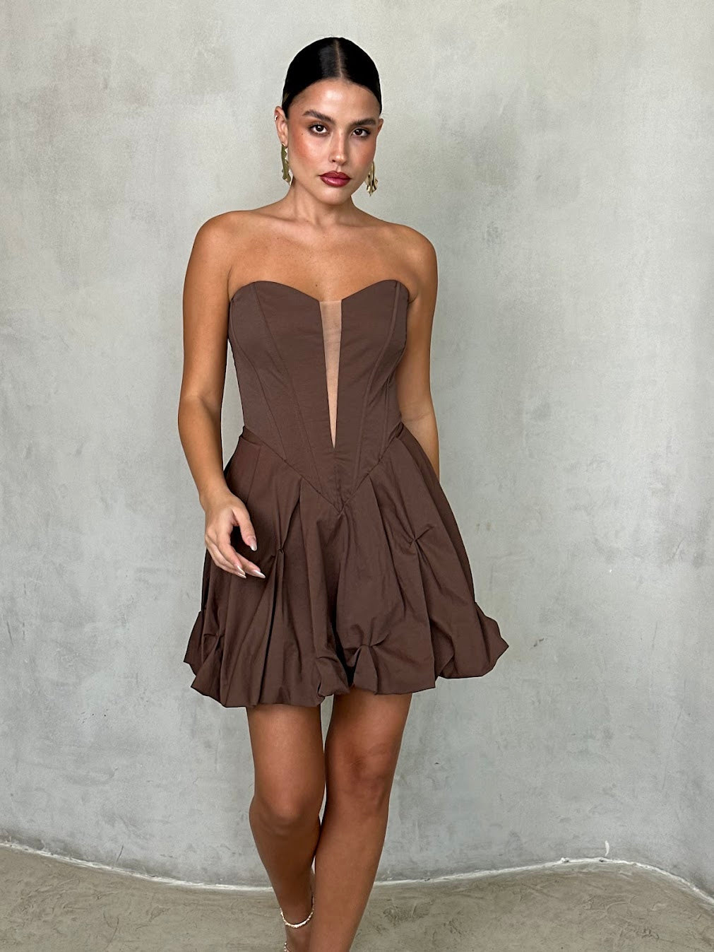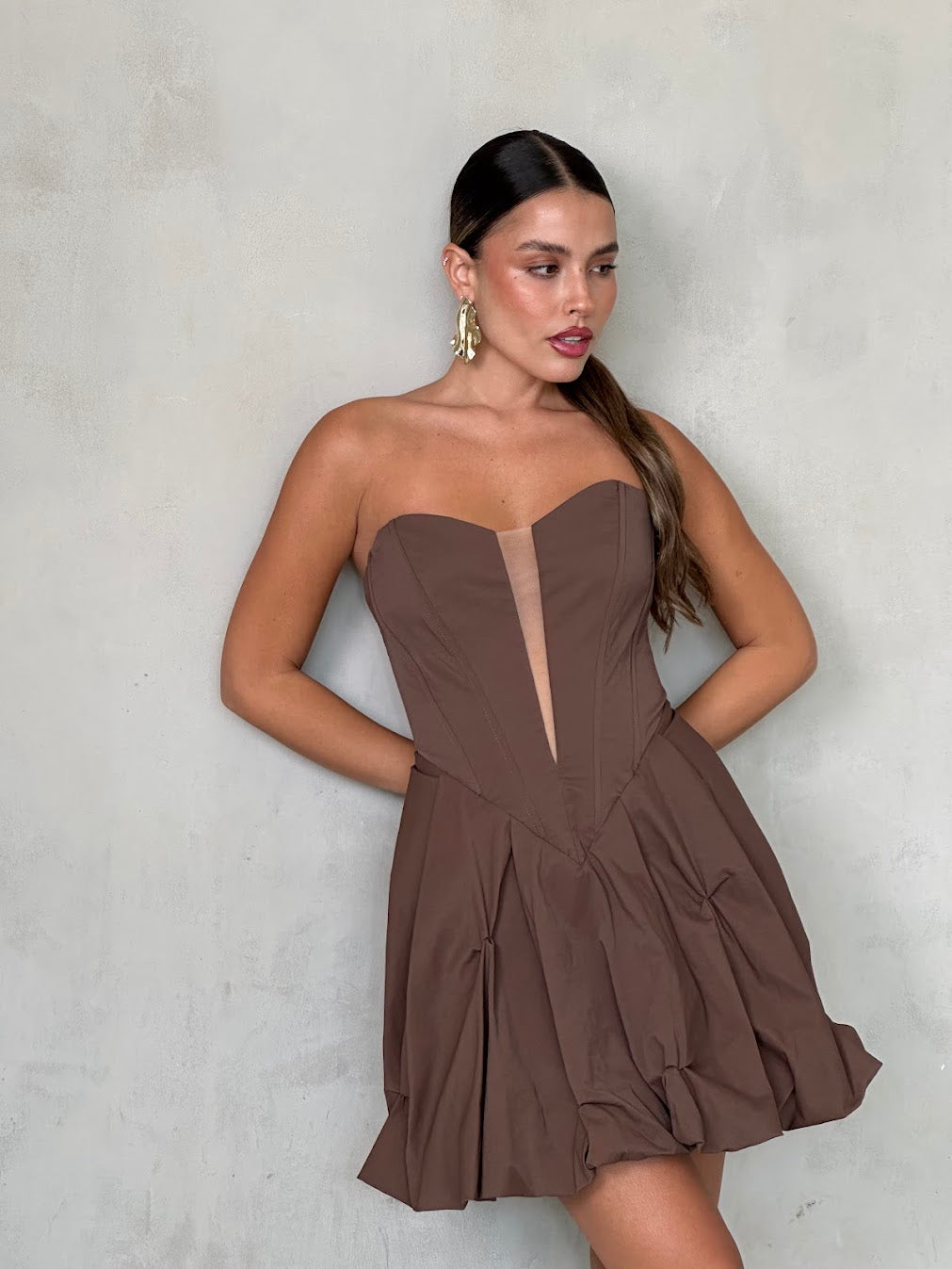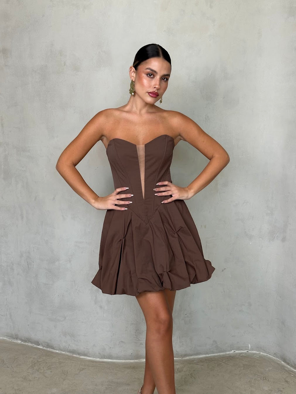 שמלת מיני סטרפלס עם מחוך מובנה ומחשוף עדין בשילוב בד שקוף במרכז. החצאית המעוצבת בקפלים קלילים יוצרת נפח רך ומראה צעיר ומלא שיק. בד קליל ונעים למגע, מושלמת לאירוע ערב, דייט או יציאה אופנתית עם נוכחות.